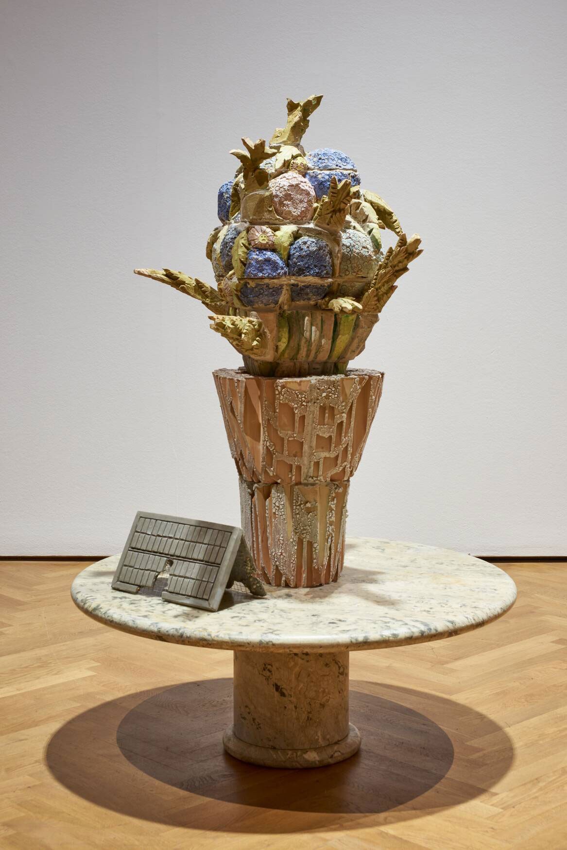 Die Skulptur von Nadim Vardag „Untitled“ (2012) besteht aus einer Stellwand, die auf den ersten Blick Bestandteil des Hausinventars des Museums zu sein scheint, doch tatsächlich handelt es sich um ein Kunstobjekt. Im Zusammenspiel von Skulptur, Design und Display macht Vardag (* 1980) auf die Reduktion auf grundlegende geometrische Formen aufmerksam, denen unterschiedliche Bedeutungen in Bezug auf Ethik und Ästhetik zugeschrieben werden. Die Konstruktion basiert auf einem Tischgestellentwurf von Egon Eiermann aus den 1960er Jahren, der trotz seiner nationalsozialistischen Aufträge im Industriebau in der Nachkriegszeit zu einem der wichtigsten Vertreter einer den modernen Fortschritt symbolisierenden Architektur Deutschlands wurde.