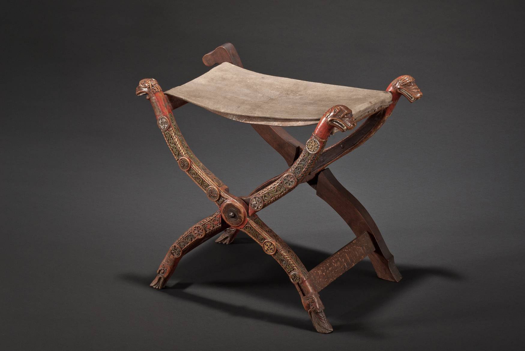 Folding chair, Salzburg, beginning of the 13th century, pear wood, carved, colorfully painted; leather, H 1705 © MAK
