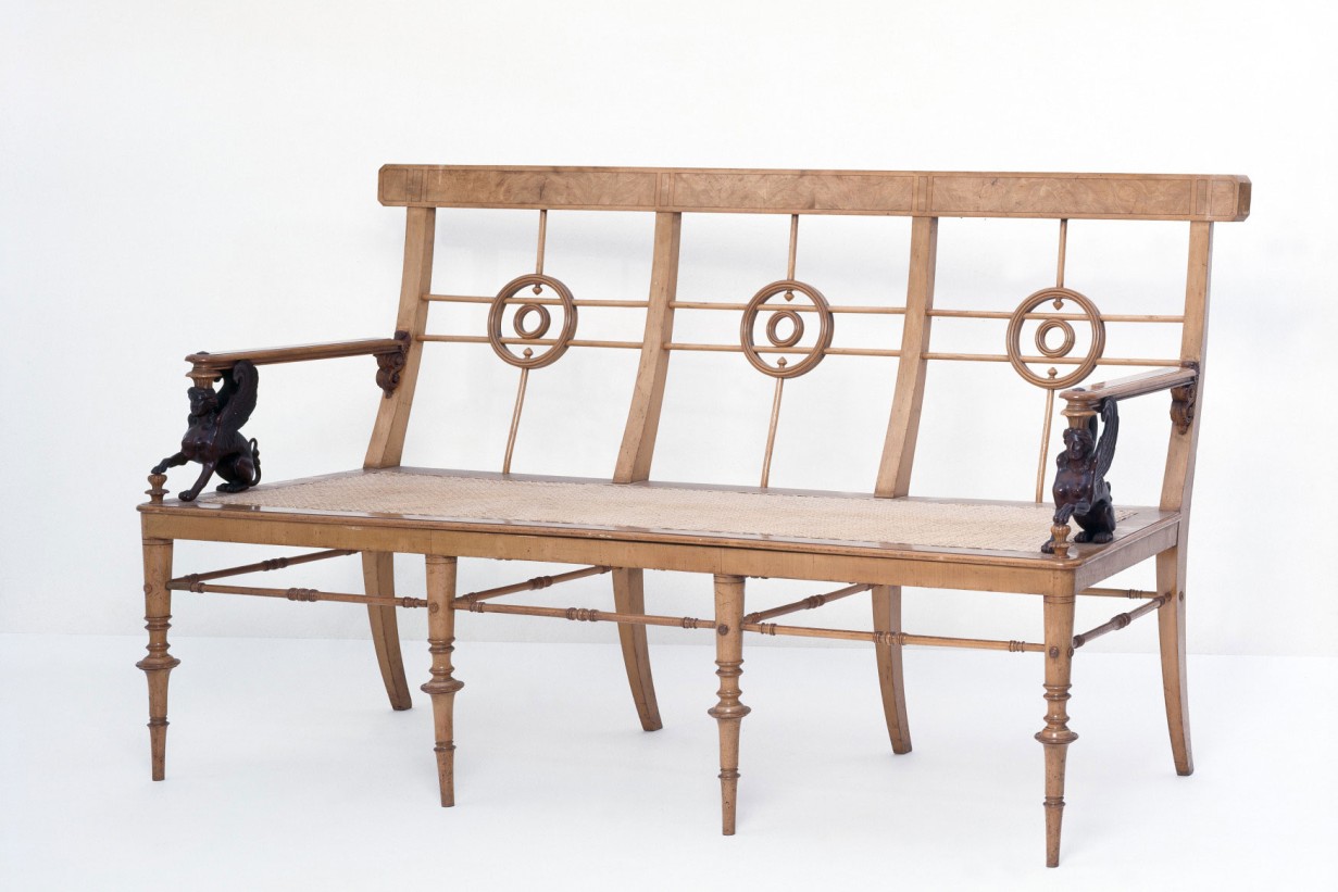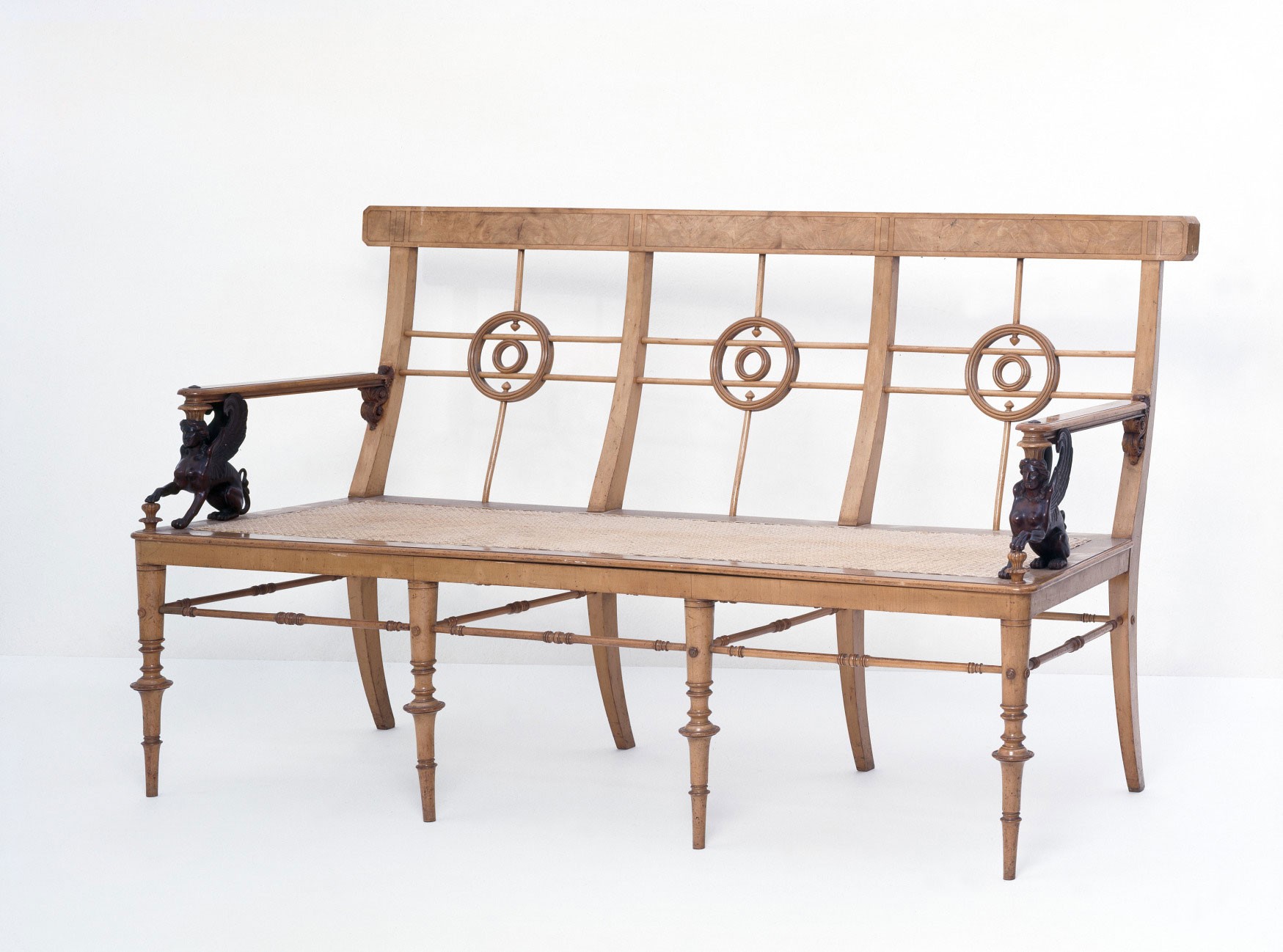 Theophil Hansen, bench, Vienna, ca. 1870, beech wood; maple wood, solid and veneered; mahogany wood, carved; basketwork, H 2755 © MAK