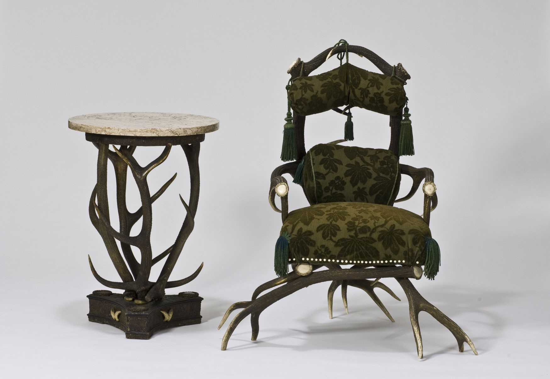Armchair and table from the hunting lodge in Neuberg a. d. Mürz, execution: Rotter, Austria, 1858, deer antlers; wood; upholstery with a green rep cover; horn, polished, H 3140-1 © MAK
