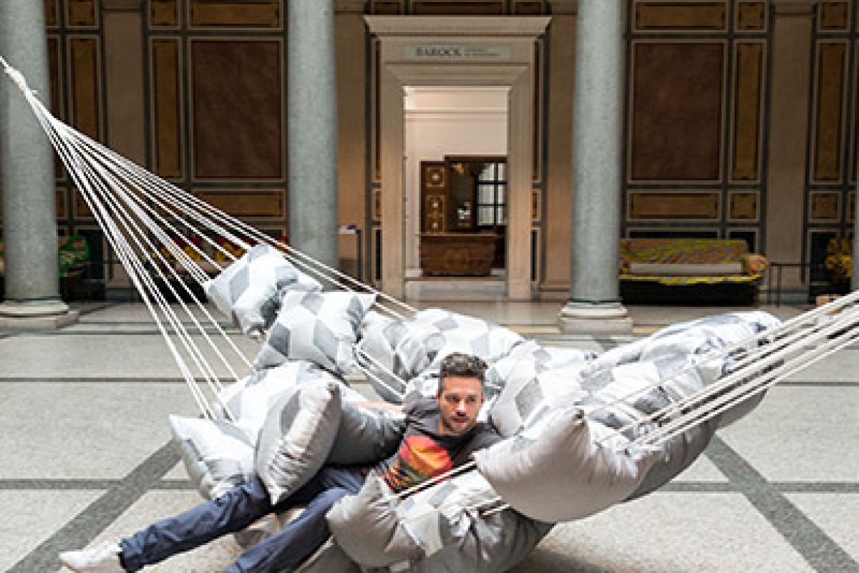 With an acoustic hammock, developed in cause of the MAK FASHION Lab by BLESS, visitors can play and newly experience the MAK Columned Main Hall.