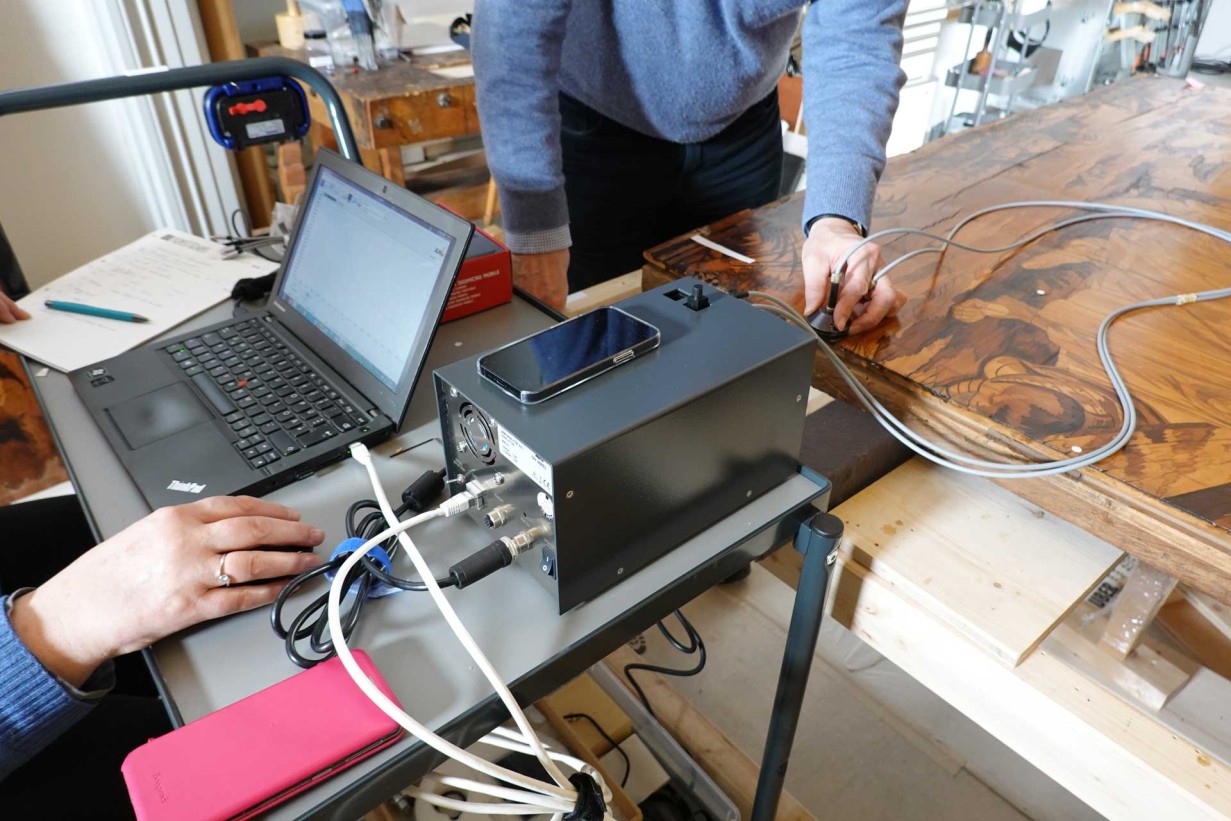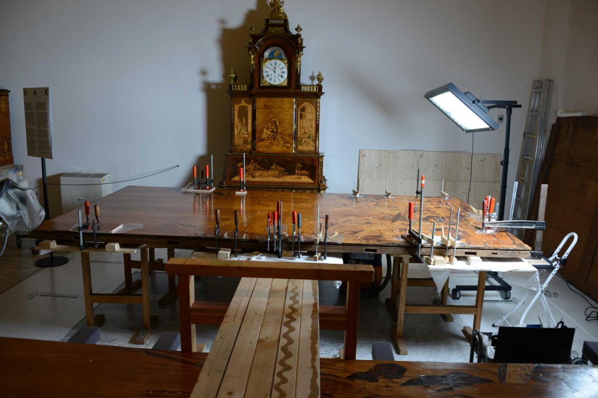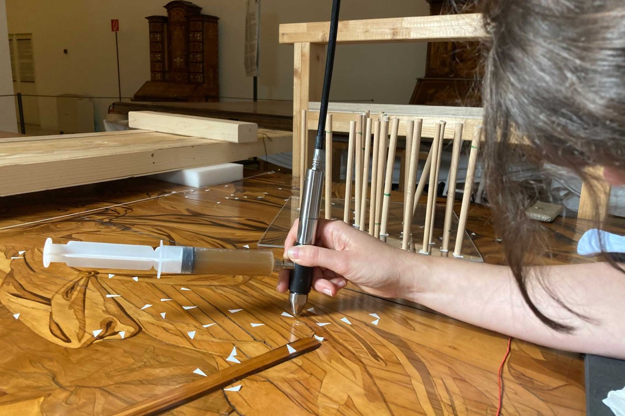 MAK conservators Britta Dierig and Anne Biber present David Roentgen's marquetry panels as part of the Long Night of Research 2024. The historical scenes depicted on them demonstrate an extraordinary love of detail. Thanks to the careful choice of wood and the extremely high quality of the workmanship, the original substance of the panels has been largely preserved. Nevertheless, time has left visible traces on the panels.