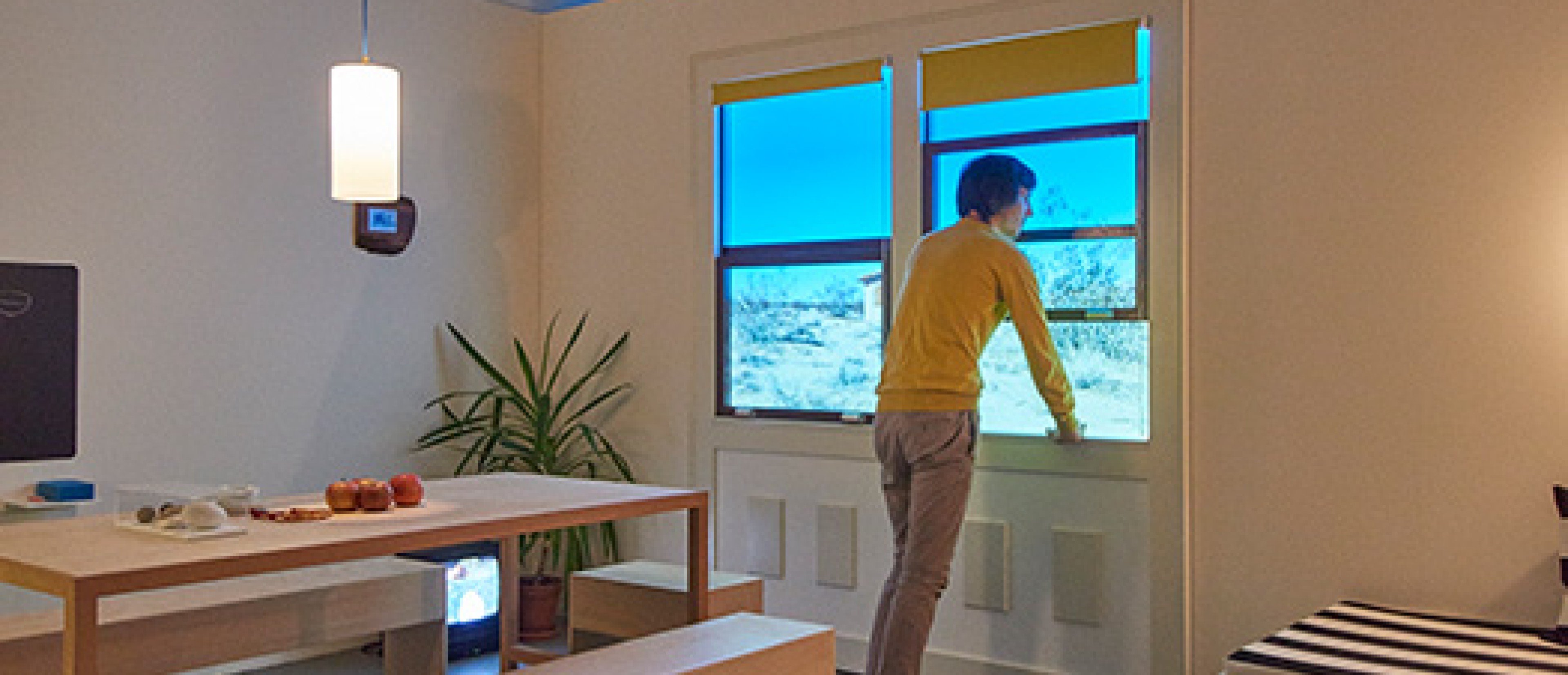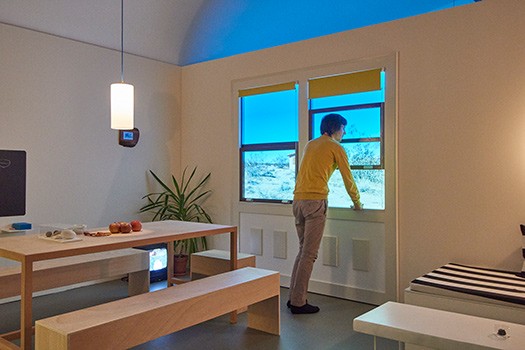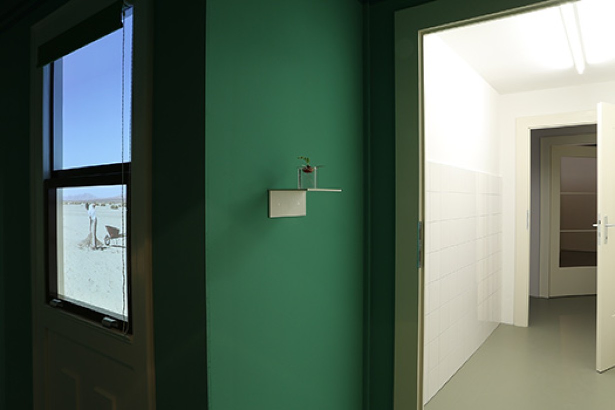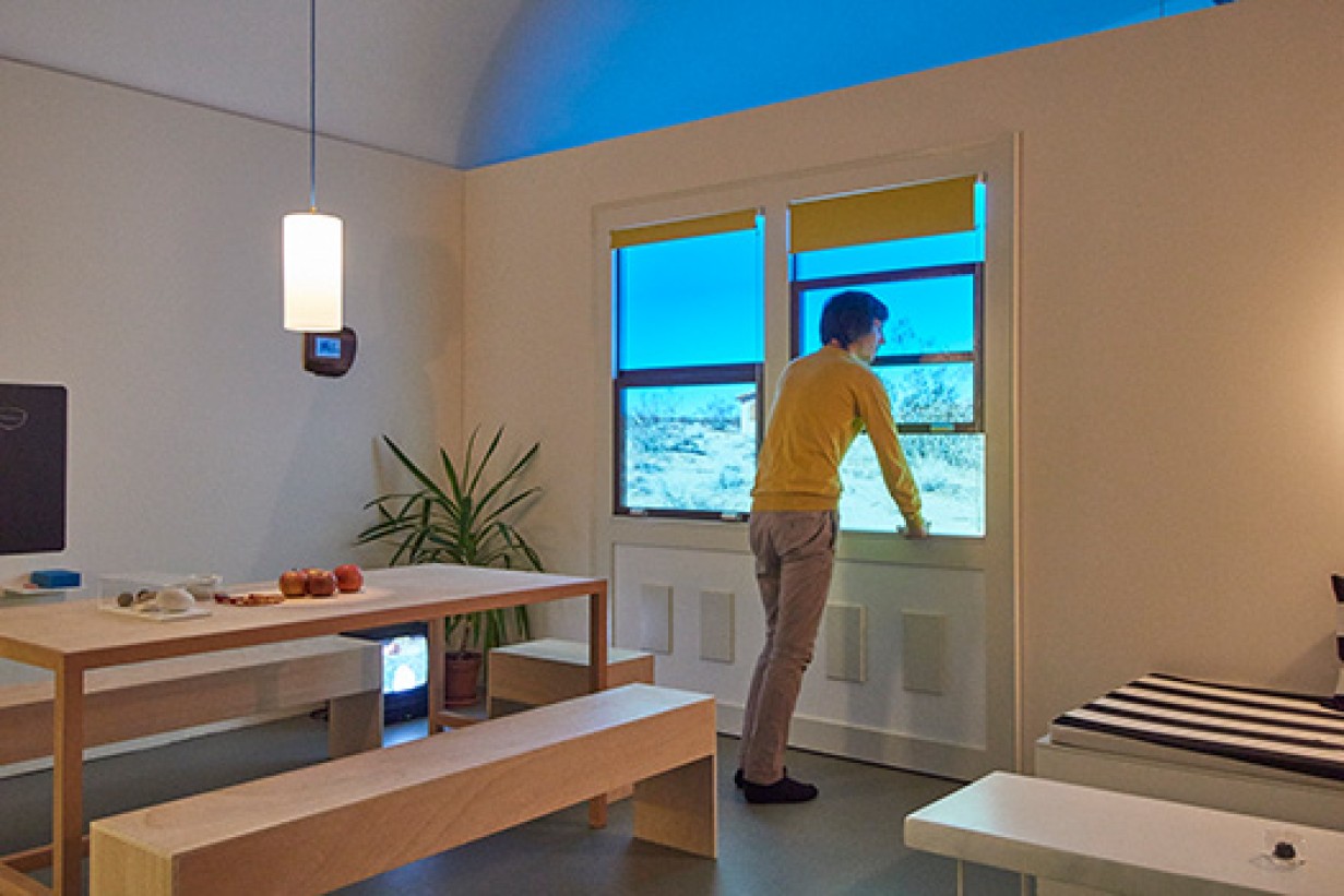 With deliberate breaks in reality in the form of windows looking out onto the Mojave Desert, the artist unfurls an additional plotline that reflects on retreat, autonomy, and human beings’ personal self-determination in the context of an increasingly globalized world. In the Mojave Desert, near Los Angeles, one can to this day find relics and ruins of dwellings—so-called “homesteads”— that had been put up beginning in the late 19th century under a series of US federal laws known as the “Homestead Acts”. The government had given every adult citizen of the USA the right to settle on ca. 160 acres (ca. 64 hectares) of previously uninhabited land and work it on his or her own. The related present-day term “homesteading” refers to the ideal of achieving the greatest possible degree of autonomy (or even autarchy) in the sense of a sustainable lifestyle. Homesteading is based on the idea of self-provision without resorting to public infrastructure, and it often entails using renewable energy sources (or even going “off the grid”, i. e. doing without electricity, water, and/or natural gas from the outside) and do-it-yourself production (of food, clothing, furniture, etc.). In reference to Henry Thoreau’s well-known book Walden (1854), Barsuglia’s installation—in which nearly all the furnishings were constructed by the artist himself—exemplifies a homesteading attitude that conforms to his own ideology, as a walk-in model and a metaphor for independence and selfreliance. In Walden, Thoreau documented his own personal social experiment including his reflections on the idea of the “simple life” and the feasibility of self-sufficiency while spending two years, two months, and two days just three kilometers away from his family’s house in the cabin that he had built himself on Walden Pond in Massachusetts.