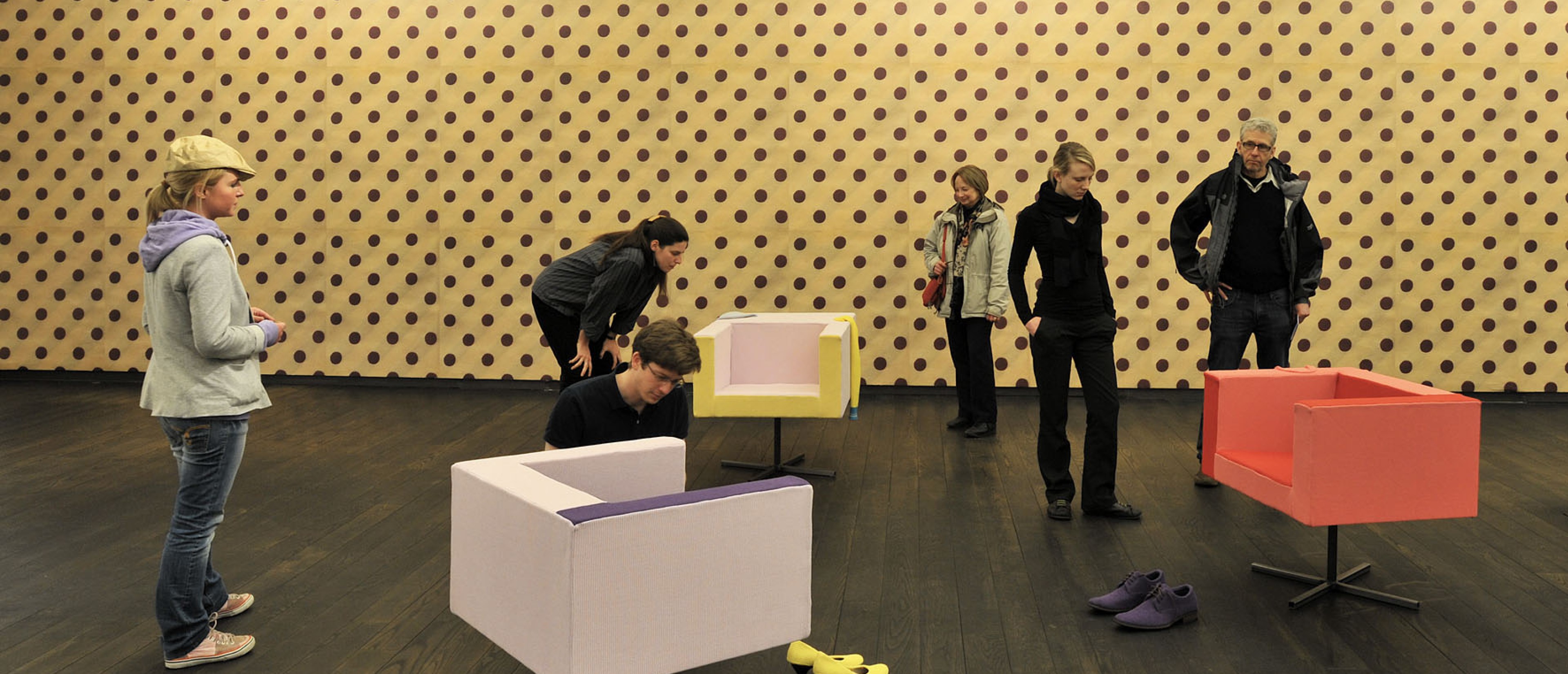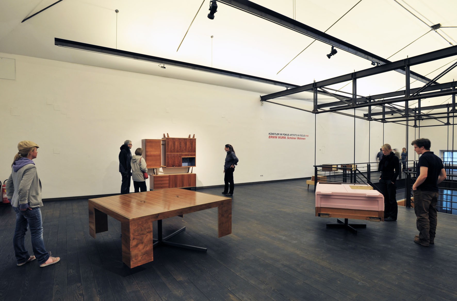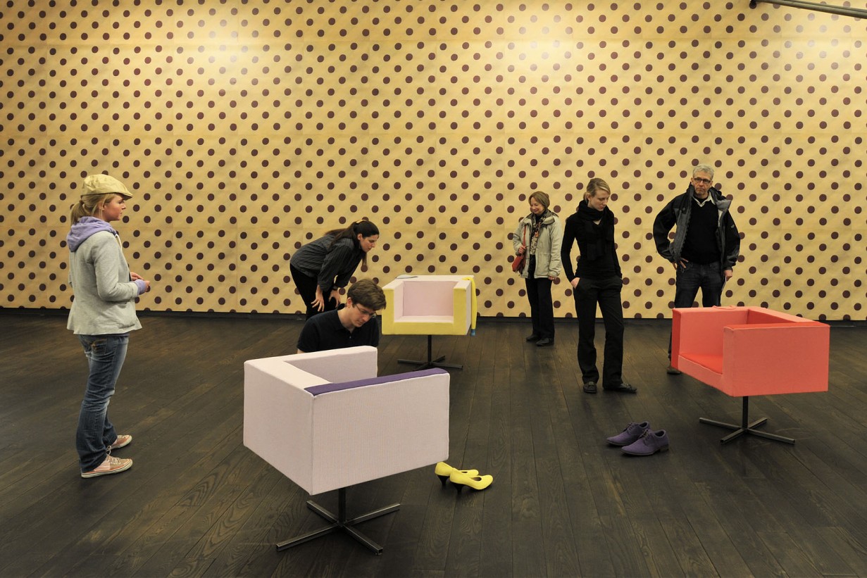 Schöner Wohnen, an intervention developed by Erwin Wurm for the Permanent Collection of Contemporary Art, infiltrates and undermines classic interior furnishings with various narrative strands. The focus is on furnitureobjects of functional value and the standard repertoire of the social space. Such pieces manifest attitudes towards life in a model fashion. Wurm overturns this world of things, however, and in the process he further exaggerates the functionality and symbolic nature of his objects. Starting with originals from between the 1930s and 1960s, he forms and animates furniture objects into applied sculptures, expanded by so-called Action Models.