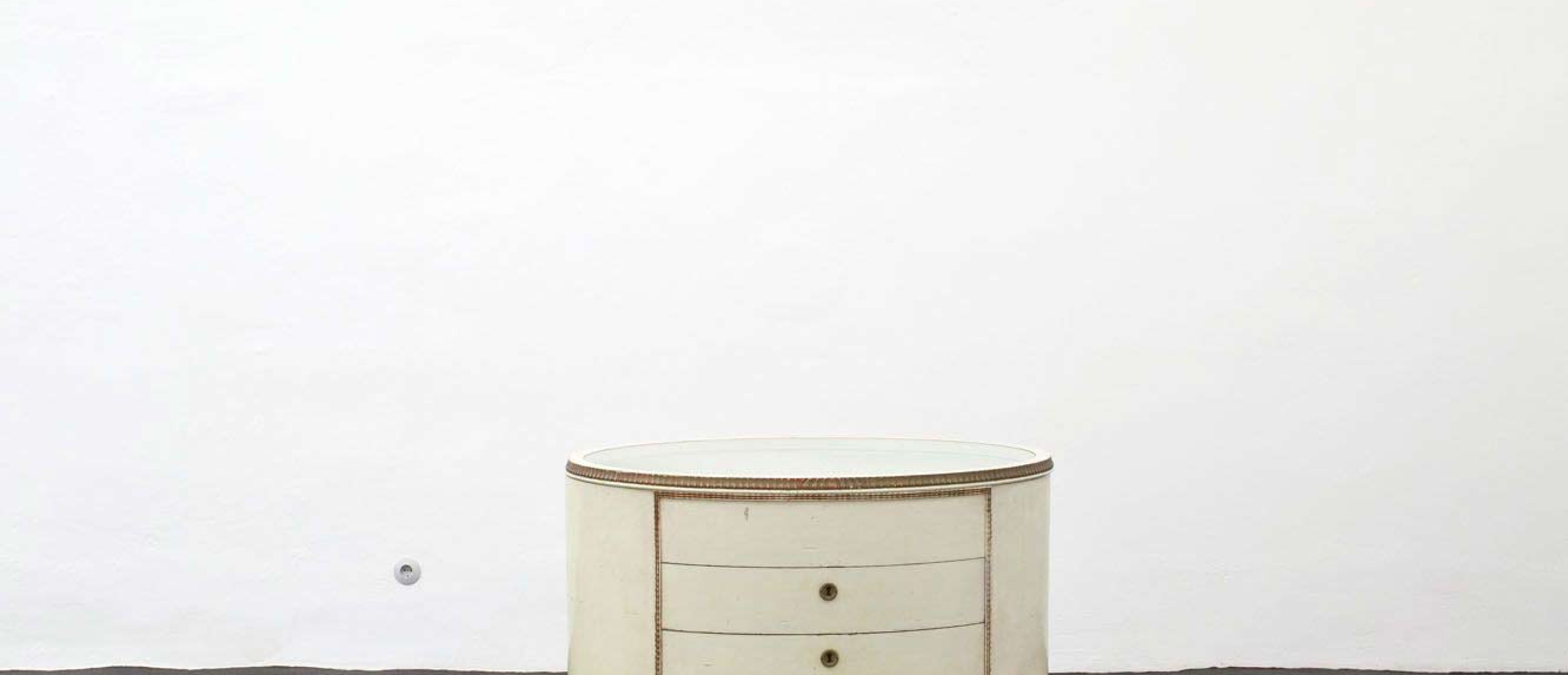 Various species of wood, lacquered white, partially gilded, feet of carved wood; glass