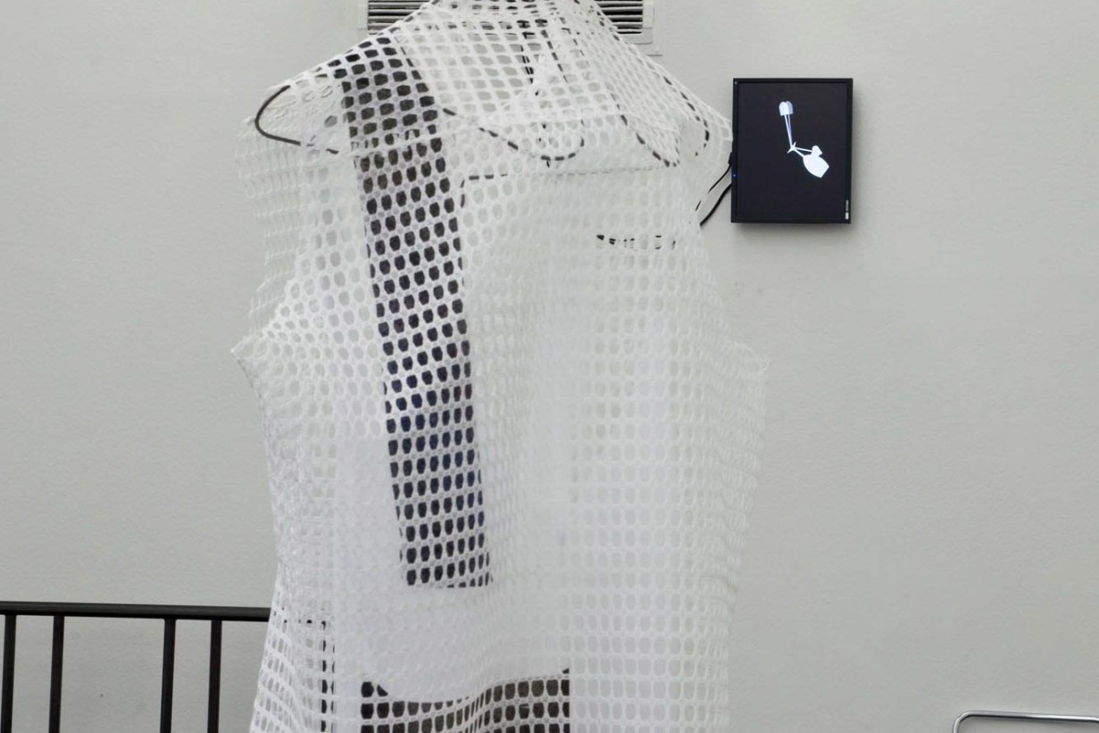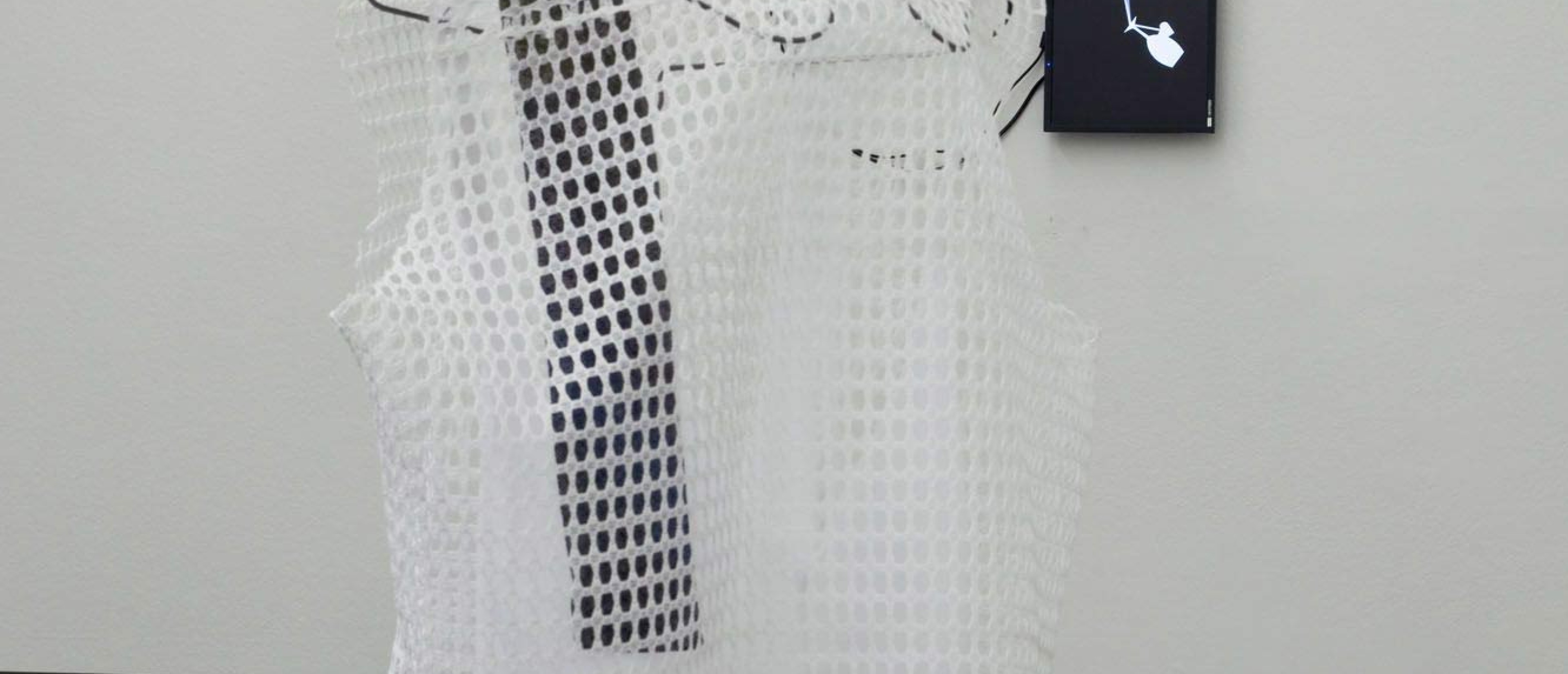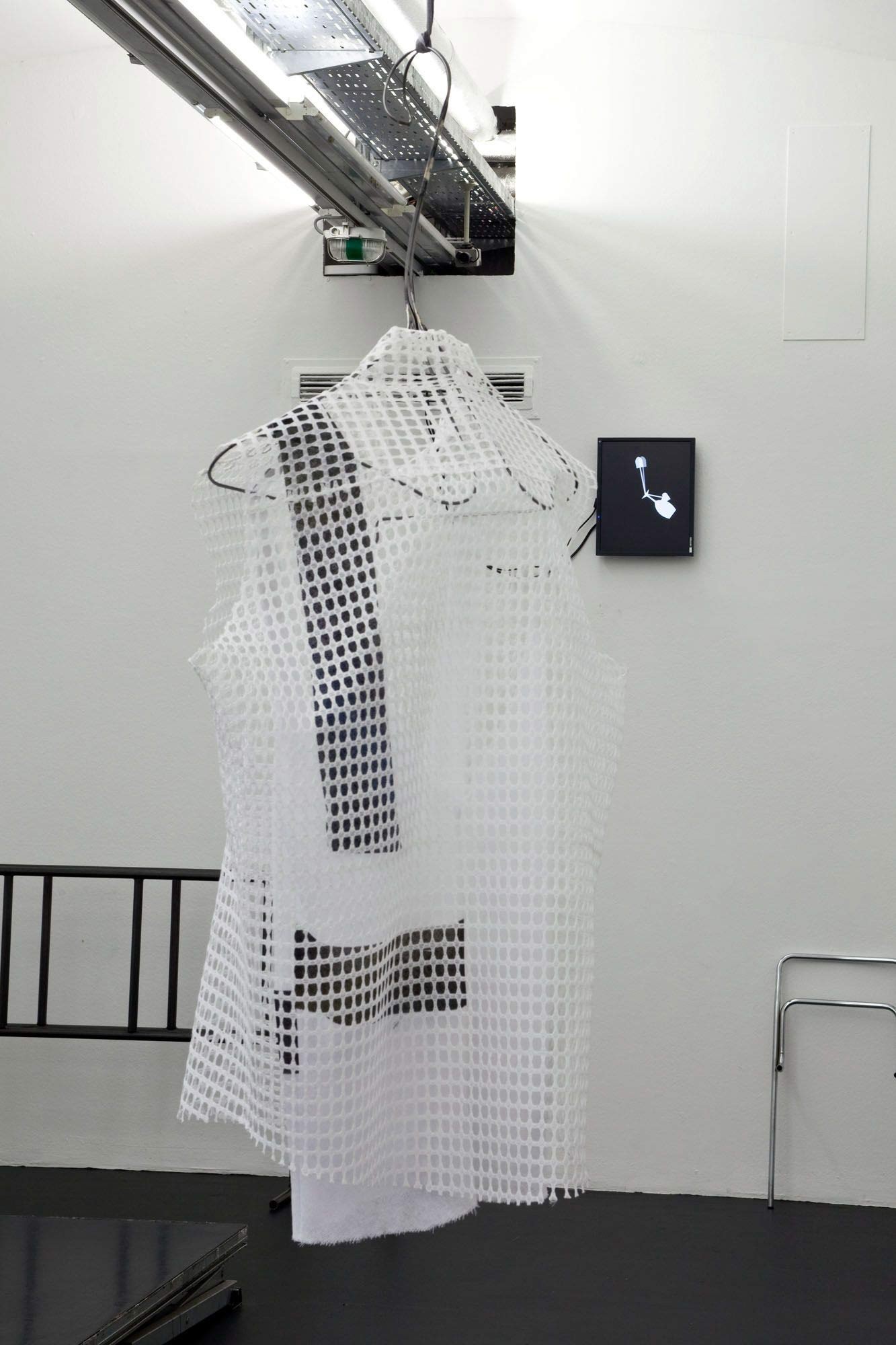 Lace cloth, silkscreen print on cotton fabric, replication of clothes hanger for presentation steel wire, bent, soldered