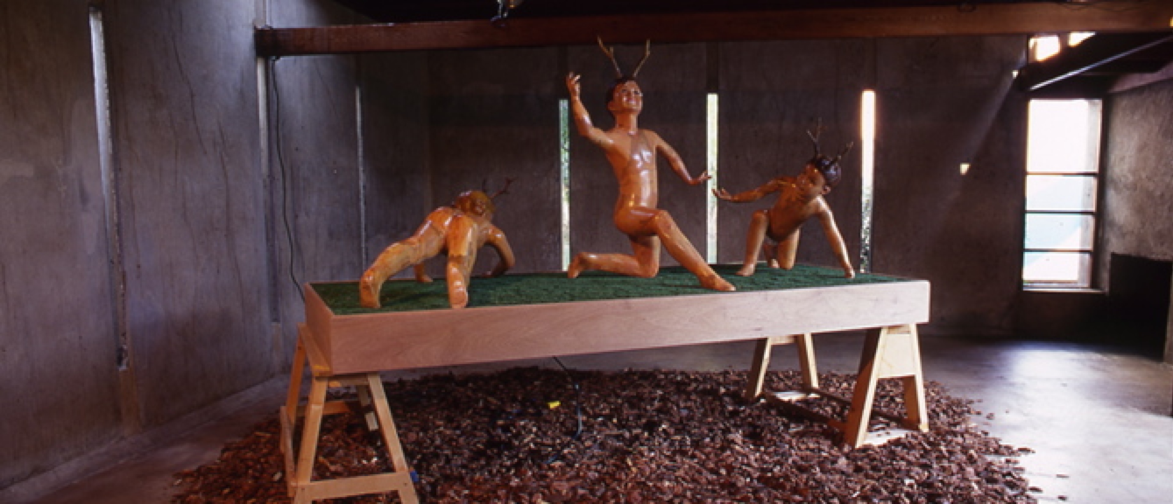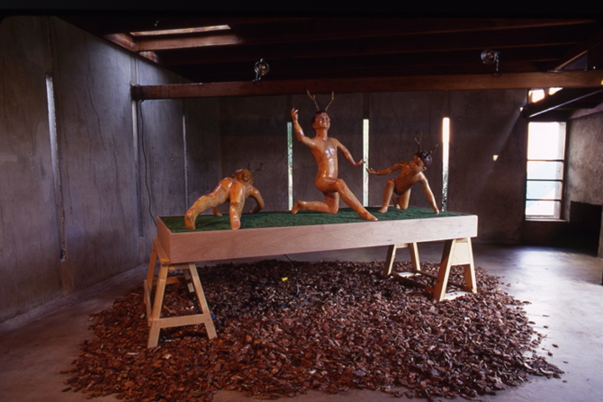 Christoph Kasperkovitz described his work "God is a Butcher" as a "video-sculpture." This finely-crafted piece presented a contemporary interpretation of late medieval representations of the "dance of death," which were meditations on mortality. Here, three child mannequins were given horns which were reconstructed to represent different attitudes toward the inevitability of death: innocence, carpe diem ("live for today"), indifference, and religious ecstasy. The middle figure, which found religion, bore a video monitor in its head that screened a variety of American tele-evangelist preachers. Upon coming to the U.S., Kasperkovitz was fascinated by this salesman-like approach to spirituality.