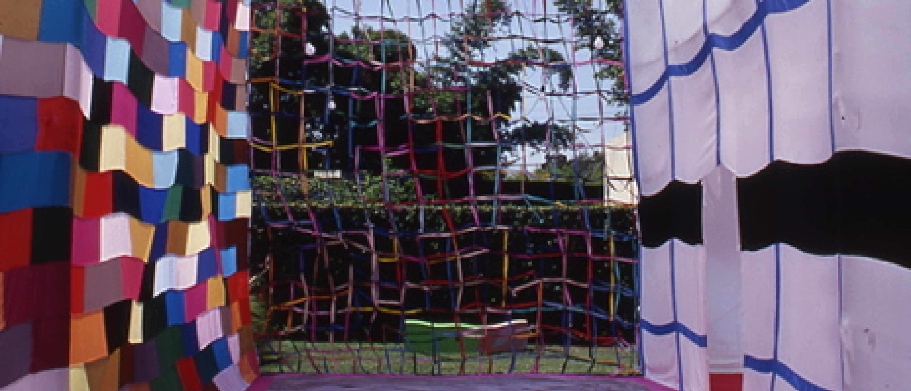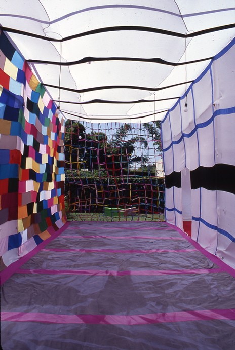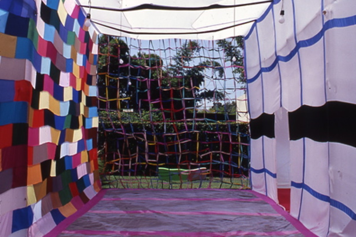 For Final Projects, Gilbert Bretterbauer constructed "The House" on the front lawn of the Schindler House by using bamboo harvested on the grounds and interpreting Schindler design concepts. "The House" utilized the interlocking "L" structure of the Schindler House and engaged Schindler's interpenetration of indoor and outdoor spaces through the use of translucent fabrics and lighting. Late in his life, Schindler spoke of "removing architecture." Bretterbauer's nomadic house -- the structure can be moved and reconstructed in an hour -- with its fabric walls was a contemporary expression of that ideal. Just as Schindler's house provided a canvas for the artists of Final Projects, Bretterbauer's house played host to the work of other artists. In two of the three rooms, the work of Los Angeles artists Liz Larner and Thomas Baldwin were presented for the duration of the exhibition.