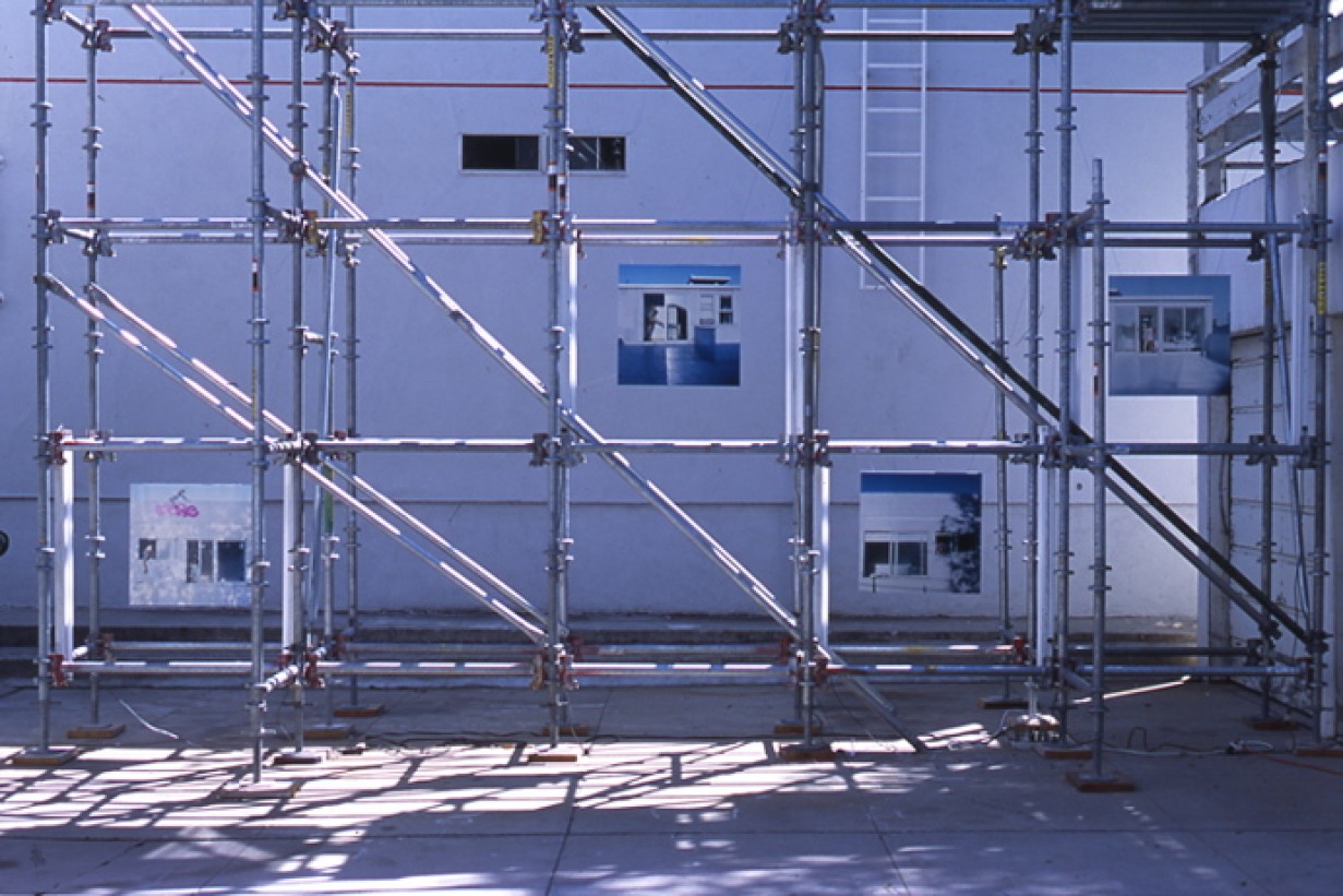Artist Corinne Rusch utilized the architectural promenade designed by fellow residents Nicolas Fevrier and Roland Oberhofer to exhibit her photographic work. She presented a diptych featuring an image from her native country and an image from her temporary home in Los Angeles the Mackey Apartments. Rusch condensed her daily experiences and childhood memories into photographic images, using her surroundings as a setting with family and friends posing as her models.