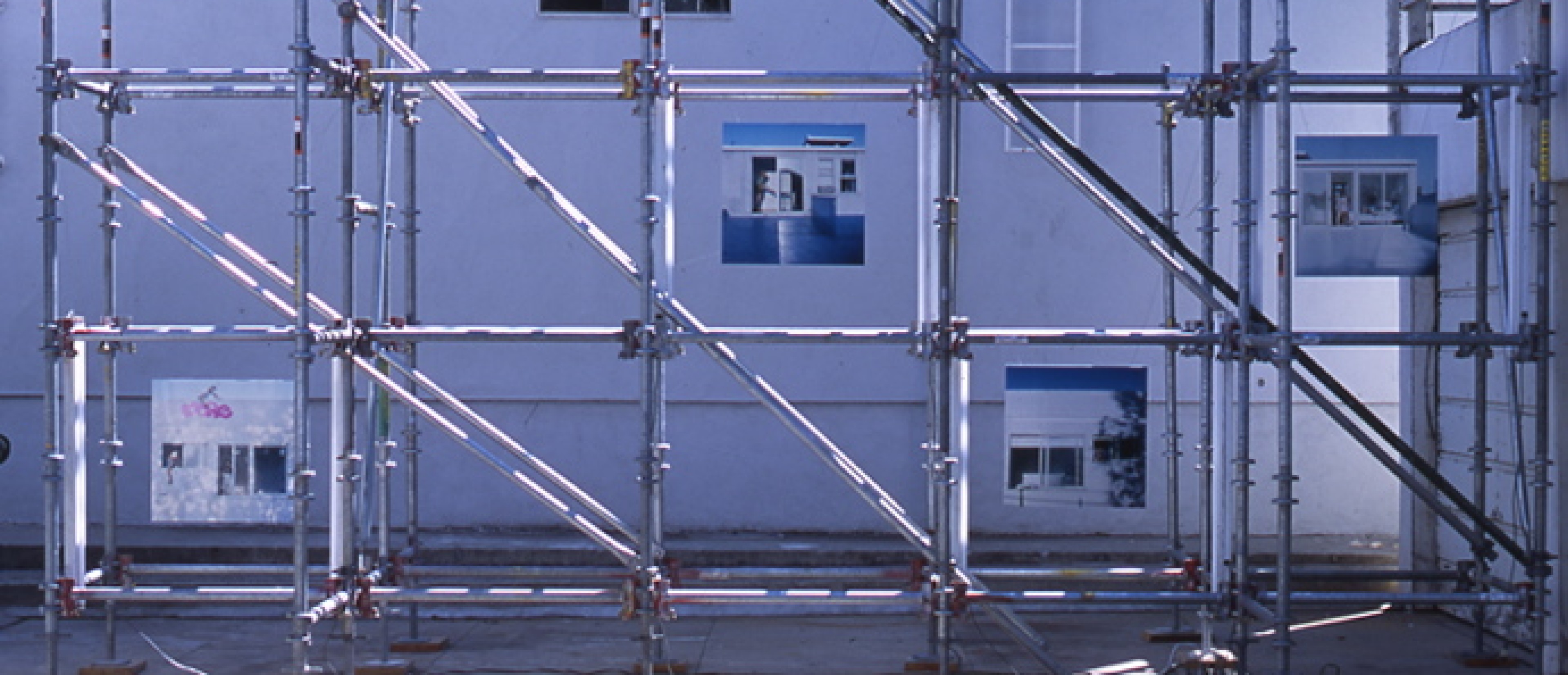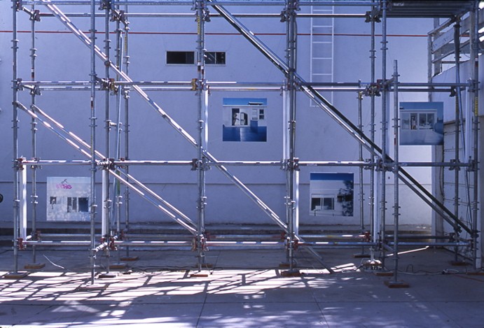 Christoph Kumpusch designed, built, and un-built archetypal outdoor objects to establish a social function for the rooftop space of the Mackey Apartments. Experimenting with common everyday materials to create forms that proposed a program of leisure and summertime activity for guests, Kumpuschs installation accommodated poolside suntanning as well as the performative activities of fellow resident Suwan Laimanee.