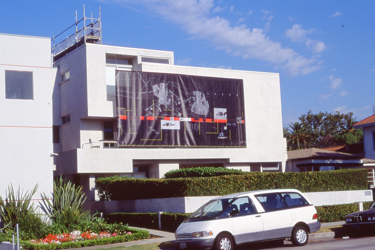 An architectural promenade designed by architects Nicolas Février (France) + Roland Oberhofer (Italy), temporarily altered ones perception of and approach to the Mid-Wilshire Mackey Apartments (1939). Their project served as an experiment towards a new type of public space that could co-exist with a private residential building. A long staircase wrapped around and over the existing structure and provided guests from the neighboring community an opportunity to enjoy panoramic views of Los Angeles from atop the three-story Modernist building. The goal of the architects was to develop a new model for outdoor private/public space by using the flat rooftops that are typical of L.A.s Modernist housing tradition.