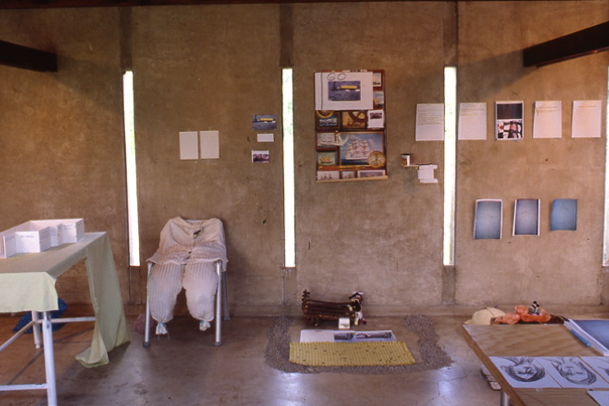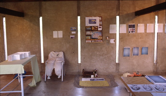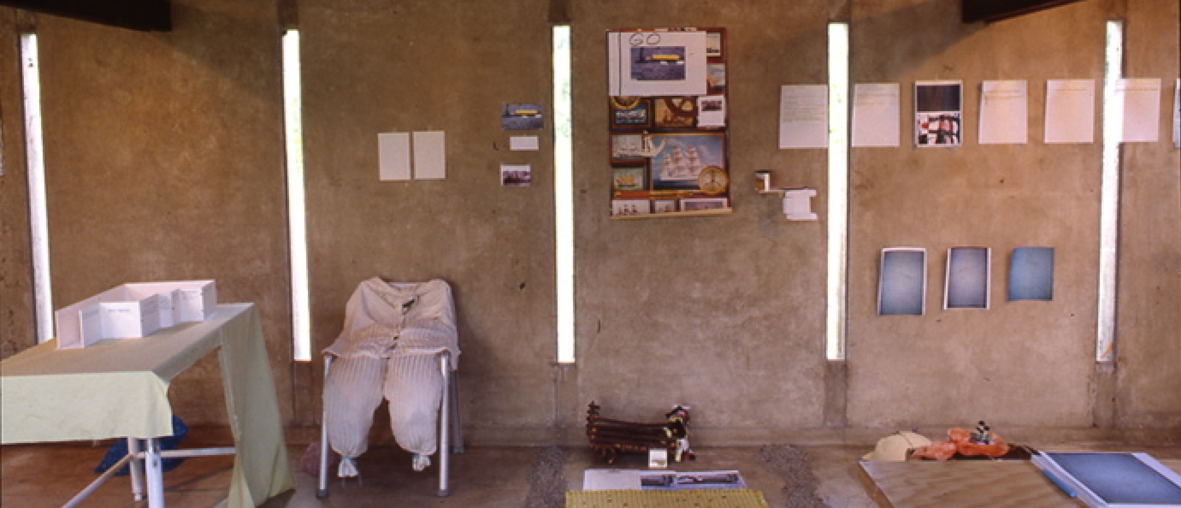 Helena Huneke of Hamburg, Germany presented a project titled "a Quiet. b Quilt. c Quit. d Quite." Her spatially-oriented, experimental work is driven by language constructions. In former works, she had employed useless or broken objects which were transformed through lexical operations and poetic descriptions from states of decay to new modalities of function. In Los Angeles, Huneke reflected on the word "exile," by examining the particularity of the stranger's language in relation to an environment of displacement. With an interior installation (which serves to evoke the unconscious as well as an architectural situation), she created a spatial structure posing examples and questions in an abstract visualization of the term "Frauenzimmer" ("Women's Room").
