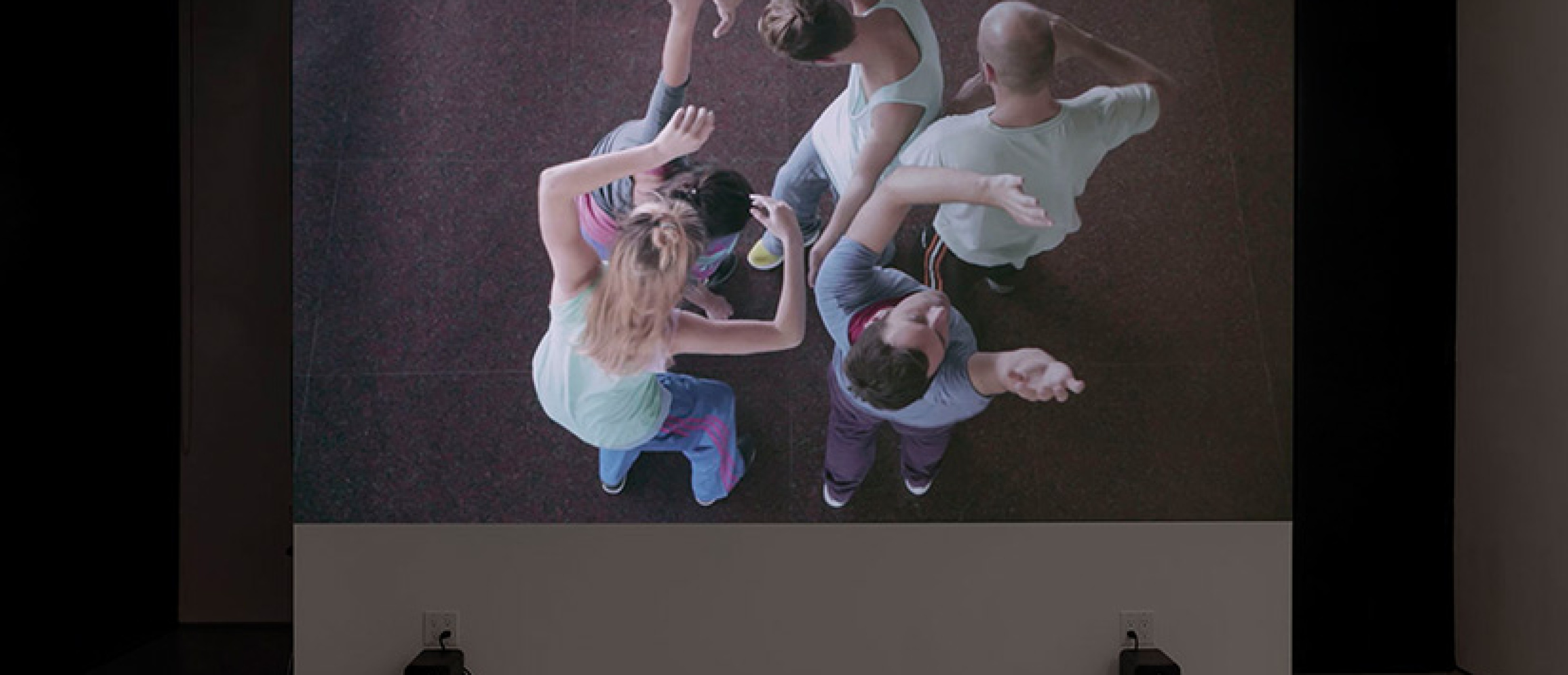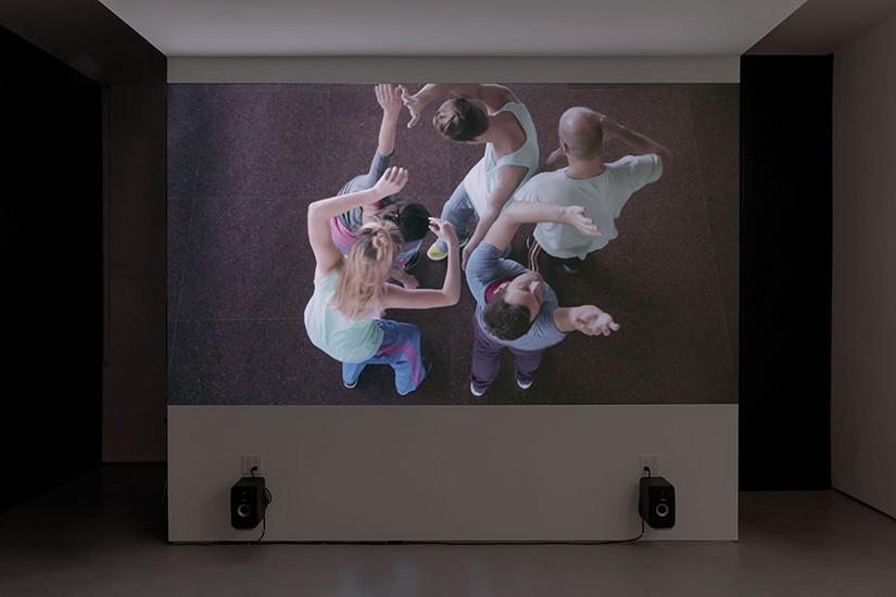 In his video presented at the Garage Top—titled Kosmaj Monument (2015)— Lulic juxtaposes the flux of bodies in movement with the static and imposing aspects of modernist monuments. This particular monument, commemorating the partisan fights of World War II in Yugoslavia, is located on Kosmaj Mountain near Belgrade. Dancers are shown creating contact through improvisation, while trying to establish a dialogue with the shapes of this specific icon. The video was shot in the neighboring cultural center, an area with state-owned student homes built during the same era as the monument— both sites employed raw concrete to represent their respective utopian period.