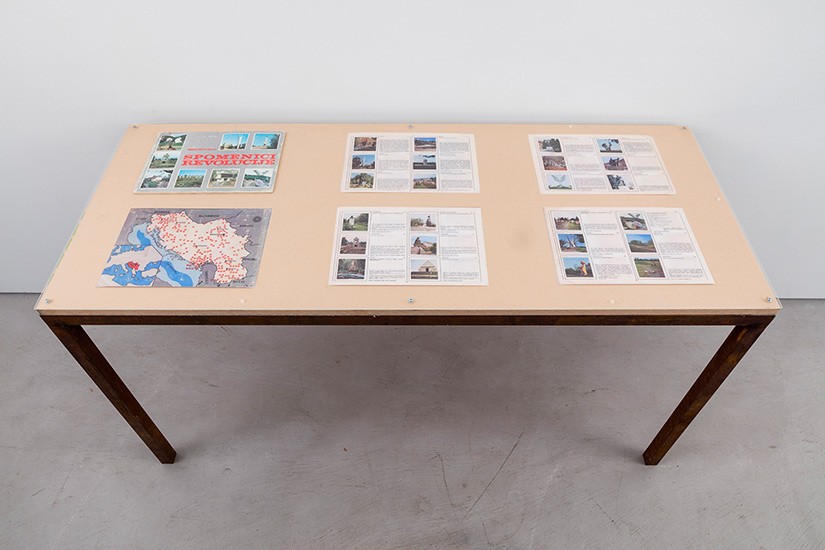 Spomenici revolucije is the two-person exhibition that results. The title comes from a Yugoslavian sticker album from the 1970s, produced for children who were supposed to buy stickers of anti-fascist modernist monuments at local kiosks and to fill up their albums. The first school with all the students’ albums completed would win a trip to the most important monuments, second place winning a color TV set.