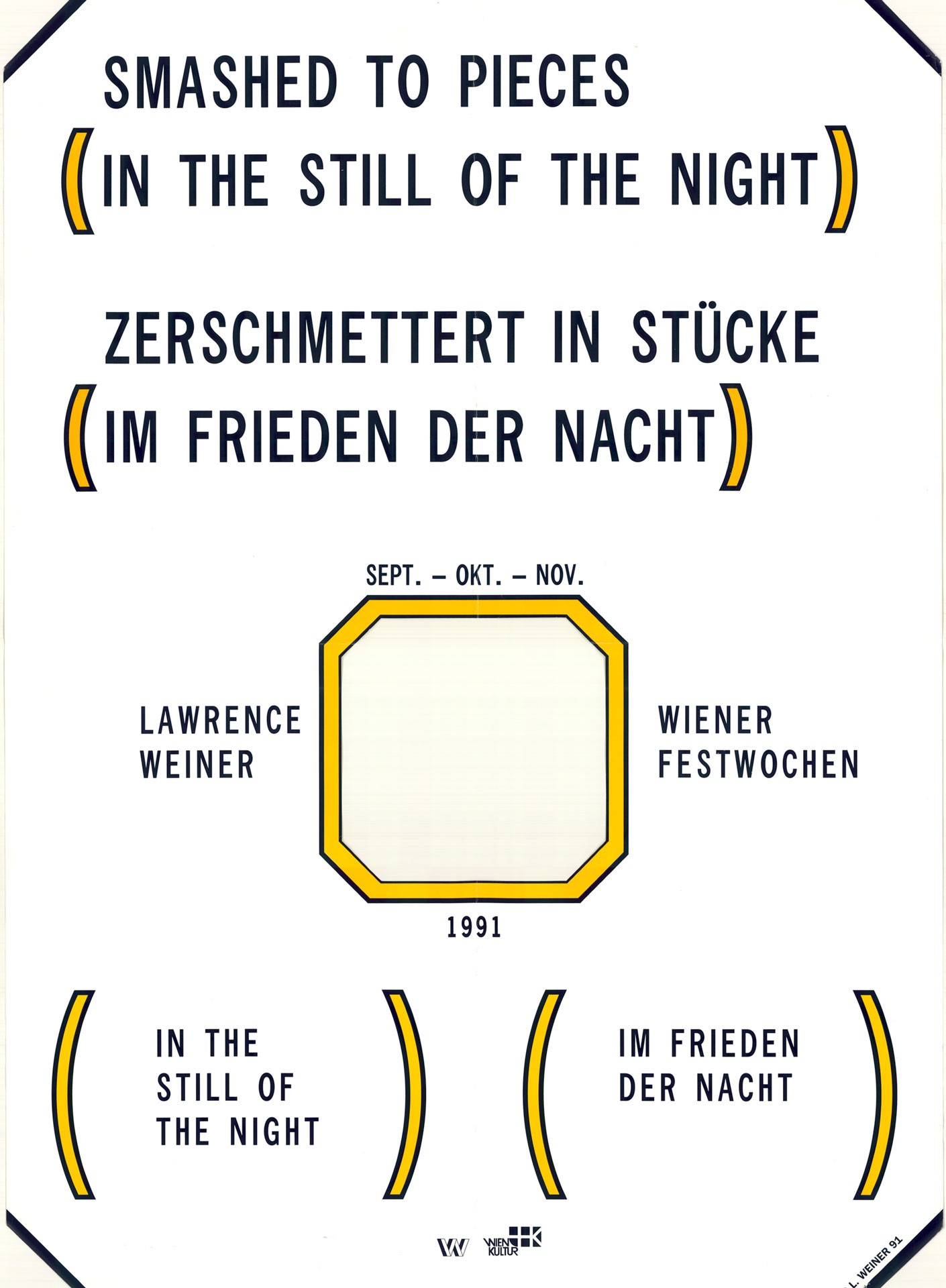 Lawrence Weiner, Smashed to Pieces [in the still of the night]. Zerschmettert in Stücke (Im Frieden der Nacht) Wiener Festwochen ... Sept.−Oct.−Nov. 1991 1991 Wienbibliothek P-375304 © Lawrence Weiner