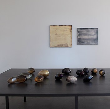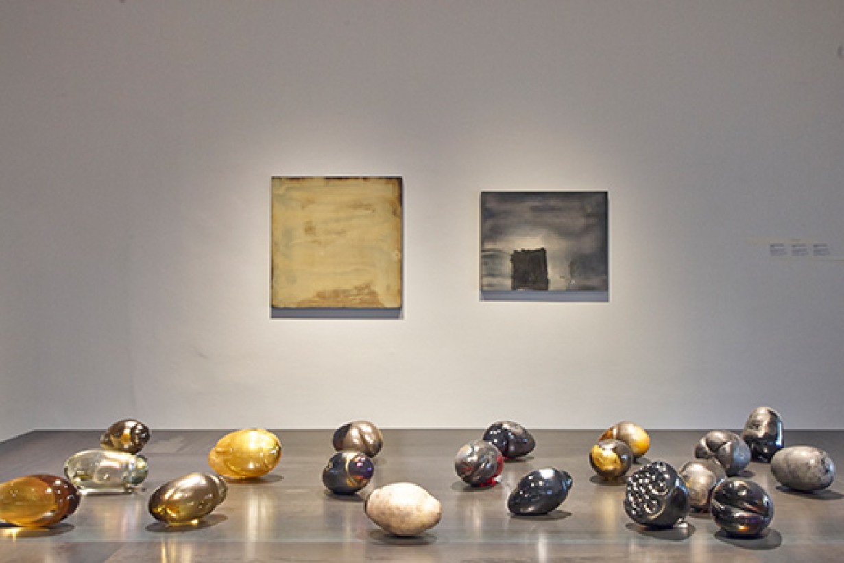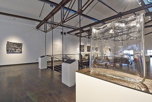 The wall objects by Alessandro Diaz de Santillana shown in the MAK reflect the history of hand blown Venetian plate and window glass and the effect of ancient, now blind mirrors. Paintings on black mirror glass reduce a subject to diverse shades of black and gray, conveying the impression that they are part of a larger aesthetic dialog. Alessandros wall objects enter into a spatial counterpart with Lauras sculptures. A series of videos in the exhibition shows visitors how the glassworks are made in the glass furnace by the Santillana siblings.
