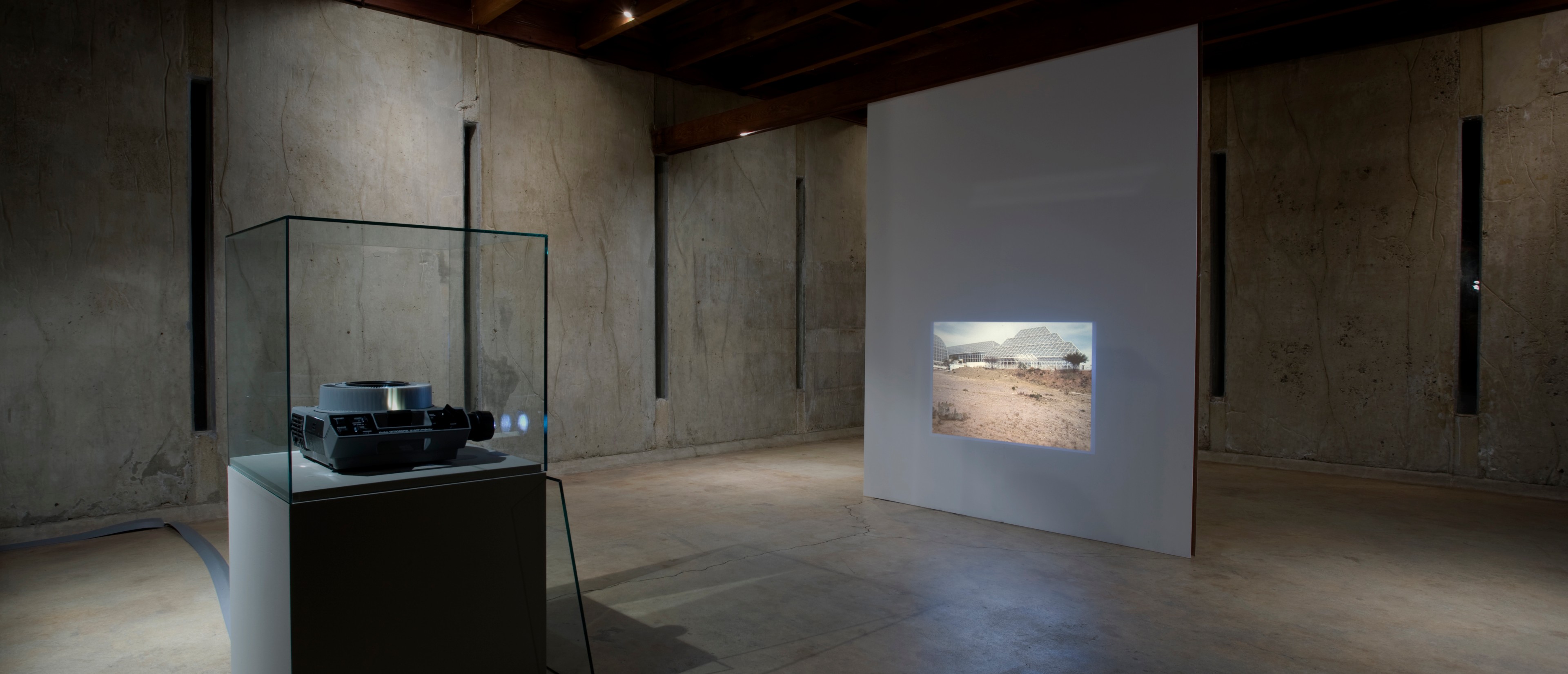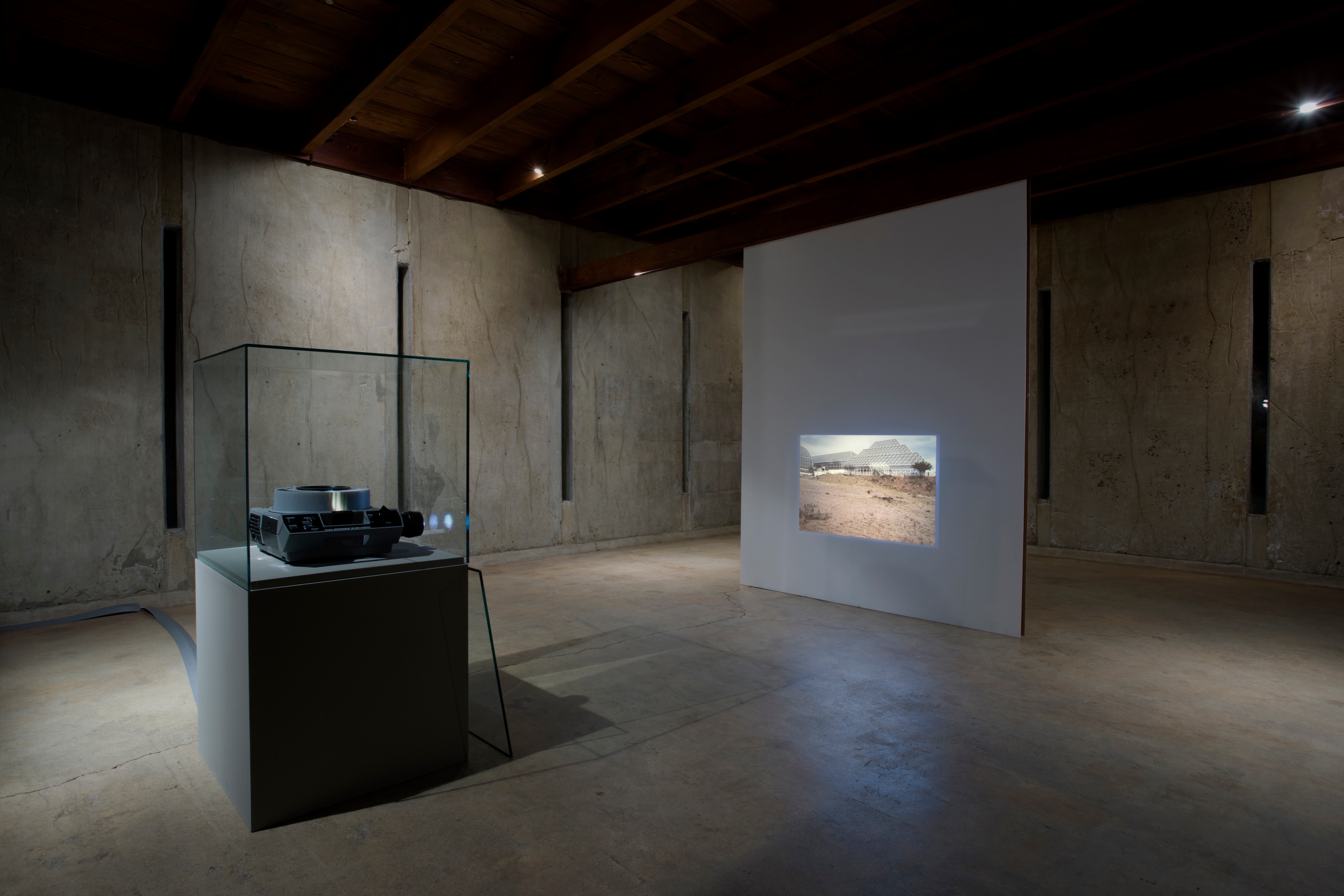 For the final part in the three-part exhibition series Locus Remix. Three Contemporary Positions Dorit Margreiter presents a triad of film and video installation works including "10104 Angelo View Drive" (2004), centered on an iconic modernist home by architect John Lautner; "Zentrum" (2006), which captures a moment in the reconstruction of Leipzig, Germany as it attempts to rid itself of the traces of its Communist past; and "Failed Model for an Enclosed System" (2006) which takes the form of a slide show about the failed Biosphere 2 experiment in Arizona in the early 1990s.