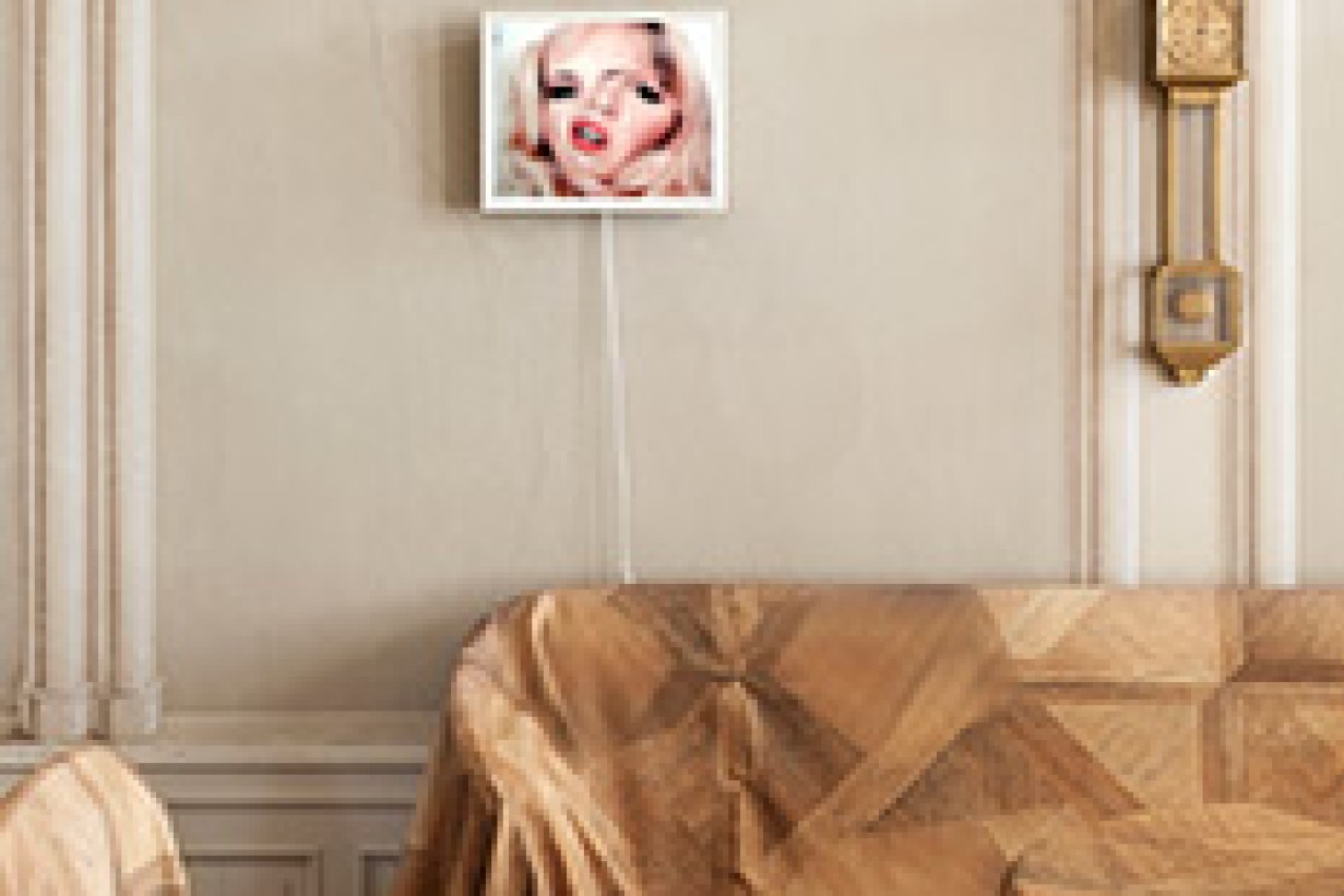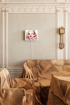 In the front: Robert Stadler, Fantome, floor patterns from the Geymüllerschlössel digitally edited for textile printing in collaboration with Backhausen, 2014. Robert Stadler, 24h Linda clock, 2005