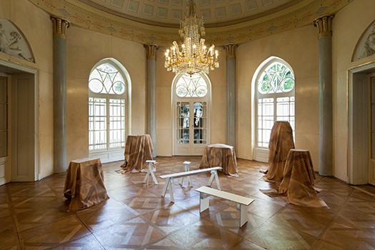 This years contribution Back in 5 min by Paris-based designer Robert Stadler plays on the easy transformability of the Biedermeier interior by means of light pieces of furniture, whichdepending on the situation at handcan be grouped into functional islands to permit uses such as eating, reading or music-making in one and the same room. In doing so, Stadler reinterprets the simple furniture typologies of traditional rustic roomsas suggested by this former rural summer villato create object groups consisting of working furniture such as stools and benches that contrast with this villas fundamentally bourgeois and opulent leisure idyll. This includes using surfaces and patterns in keeping with the Biedermeier-era material and decorative approach. In the process, deconstructive mechanisms give rise to a type of in-between phenomenonas if the space had just reconfigured itself.