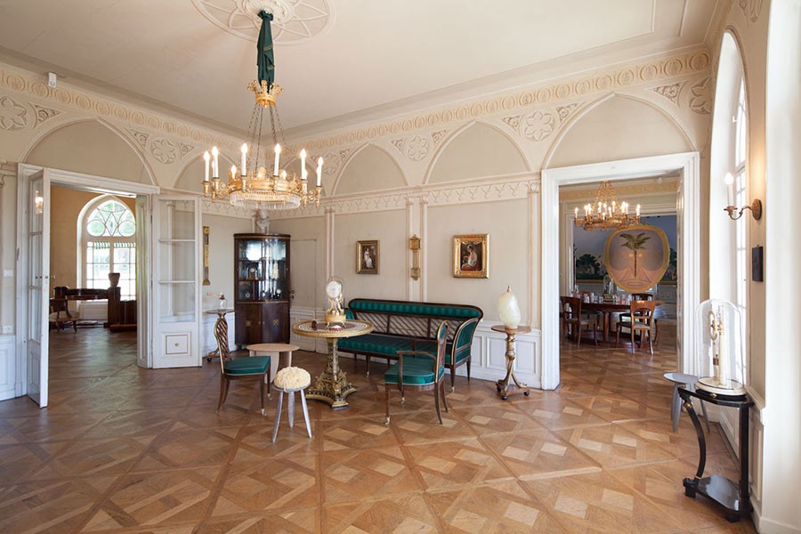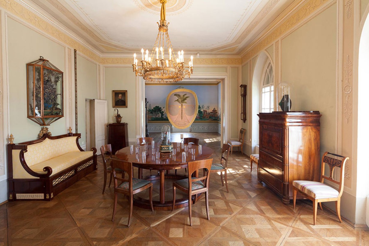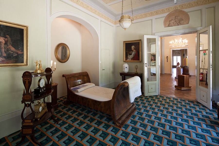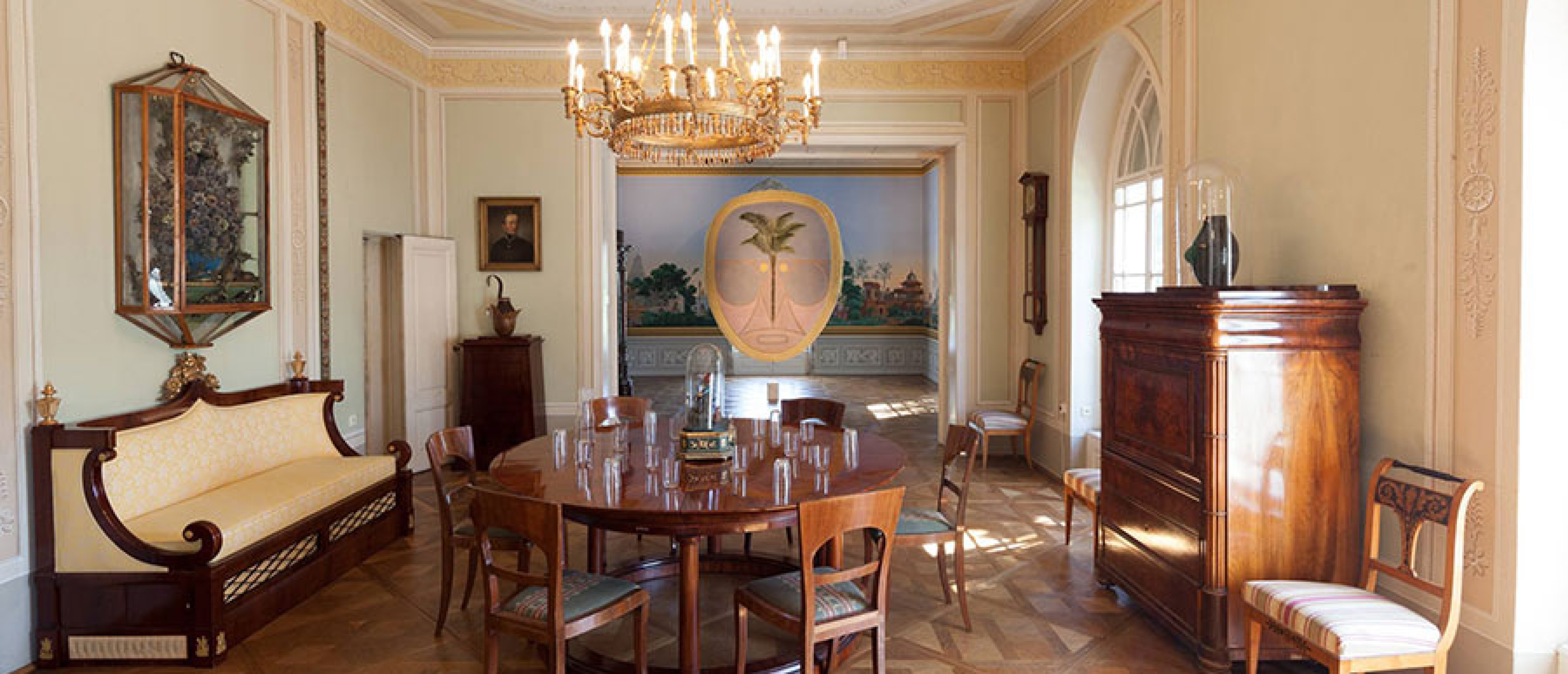 The Geymüllerschlössel’s architectural style, façade ornaments, and interior tell of that era’s bourgeois and somewhat faddish predilection for oriental cultures. The panoramic tapestry showing temples in the so-called Blue Salon provided a starting point from which the design duo set out to analyze this paradox phenomenon in which a yearning for distant places coexisted with Biedermeier “homeliness.”