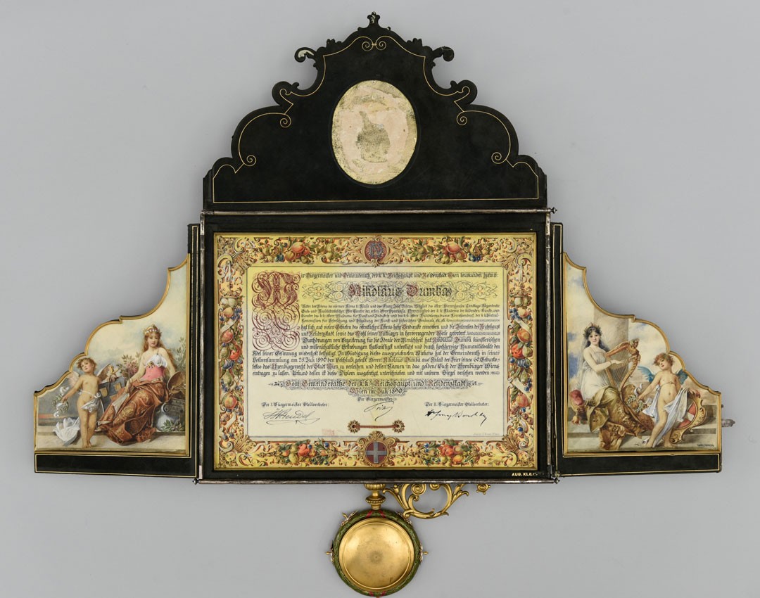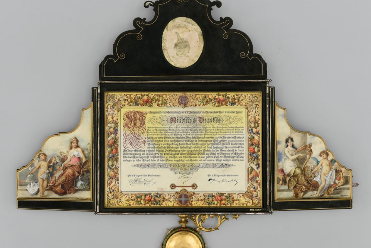 This presentation features an ornamental box, now part of the MAK Library and Works on Paper Collection, that was elaborately produced in 1890 to protect and frame the certificate of honorary citizenship presented to the Viennese industrialist, collector, arts patron, and philanthropist Nikolaus Dumba (1830¬–1900).