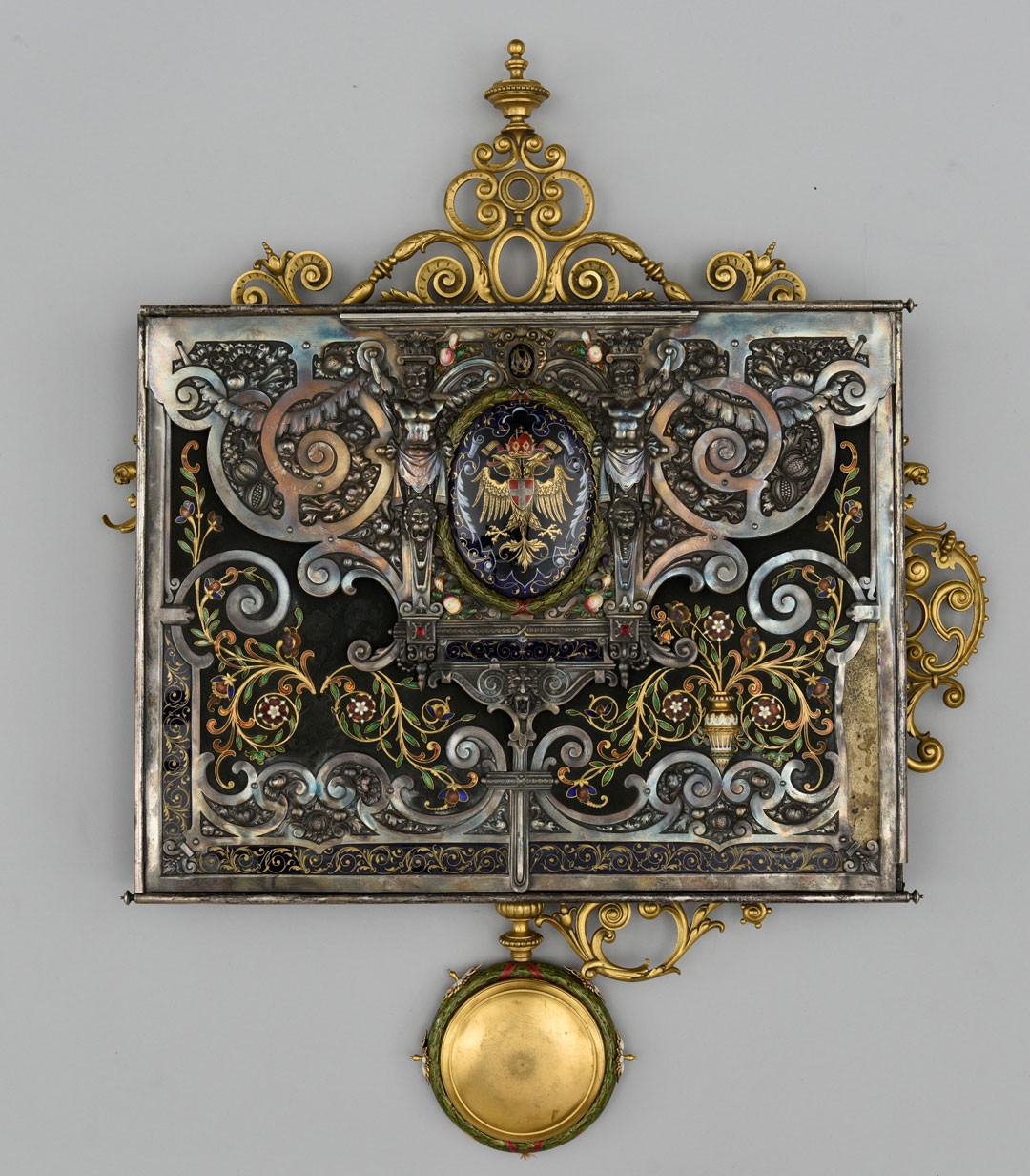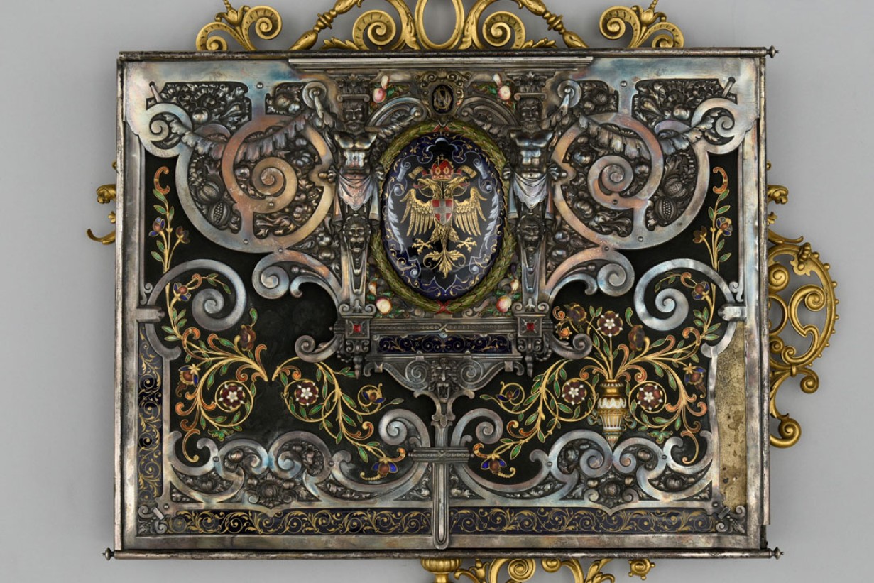 The four-part construction of this box with its numerous quotations of ornamentation done in silver, enamel, and gilt brass marks this exceptional object as a masterpiece of historical book art.