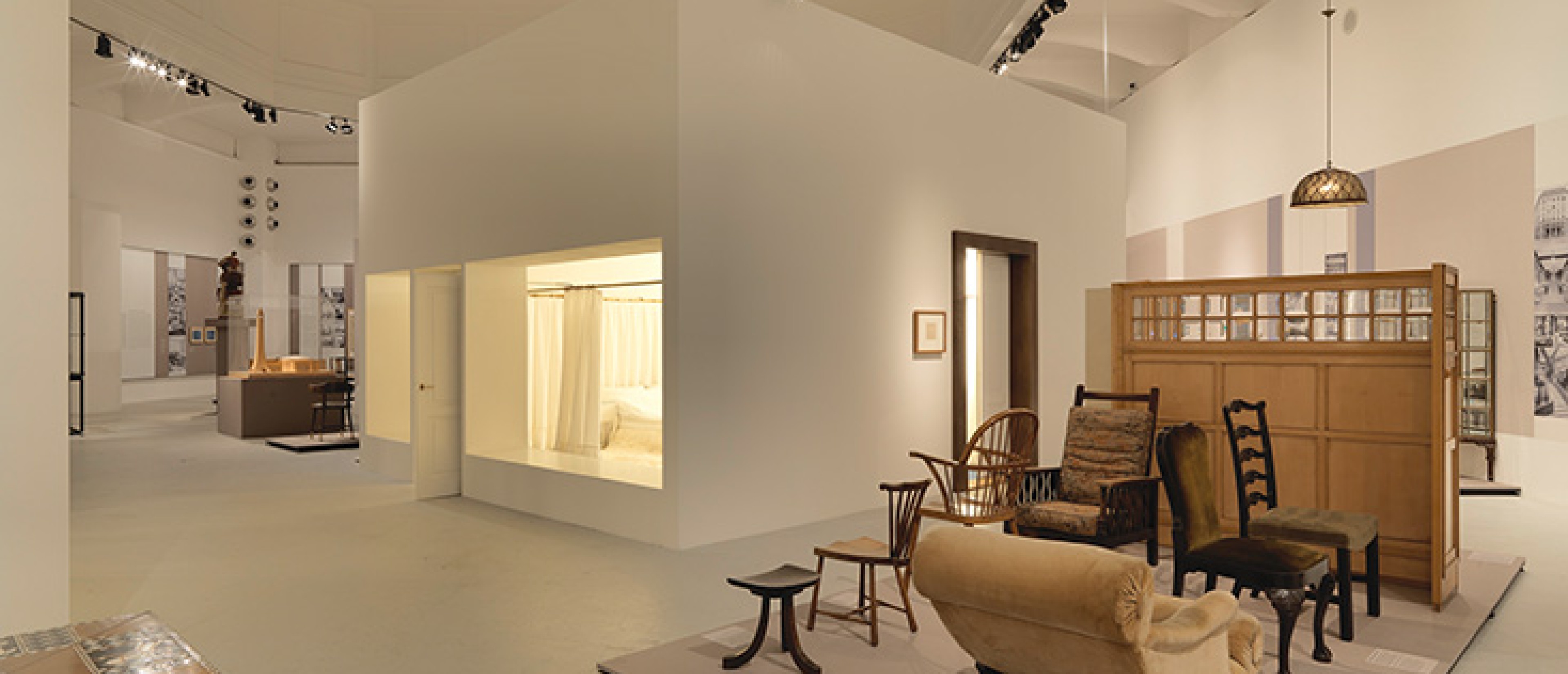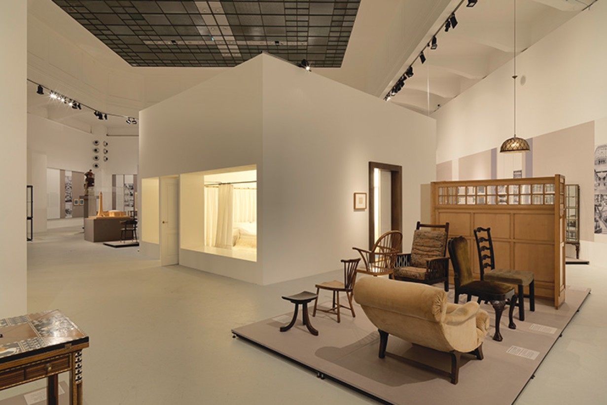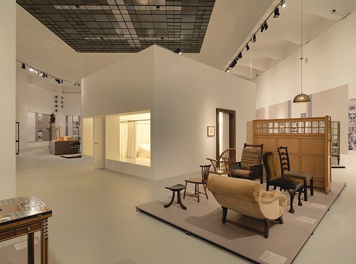 Two other segments illuminate the continuation of Josef Hoffmann’s aesthetic approach to Modernism and Adolf Loos’s evolutionary and emancipatory strategy. From 1910 onward, changes in society and a new generation of architects resulted in new approaches to Modernism that built on the ideas of Hoffmann and Loos. Humancentered and socially oriented concepts by Oskar Strnad and Josef Frank combine the two mindsets. Reconstructions of Hoffmann’s opulent Boudoir d’une grande vedette [Boudoir of a great star] (1937) and Margarete Schütte-Lihotzky’s Working Single Woman’s Apartment (1929), by contrast, illustrate contrary positions. The internationally oriented Austrian avant-garde is represented by Ernst Plischke and the Vienna office of Singer & Dicker. Bernard Rudofsky’s interpretations of modern lifestyles demonstrate a further development of Loos’s cultural criticism.