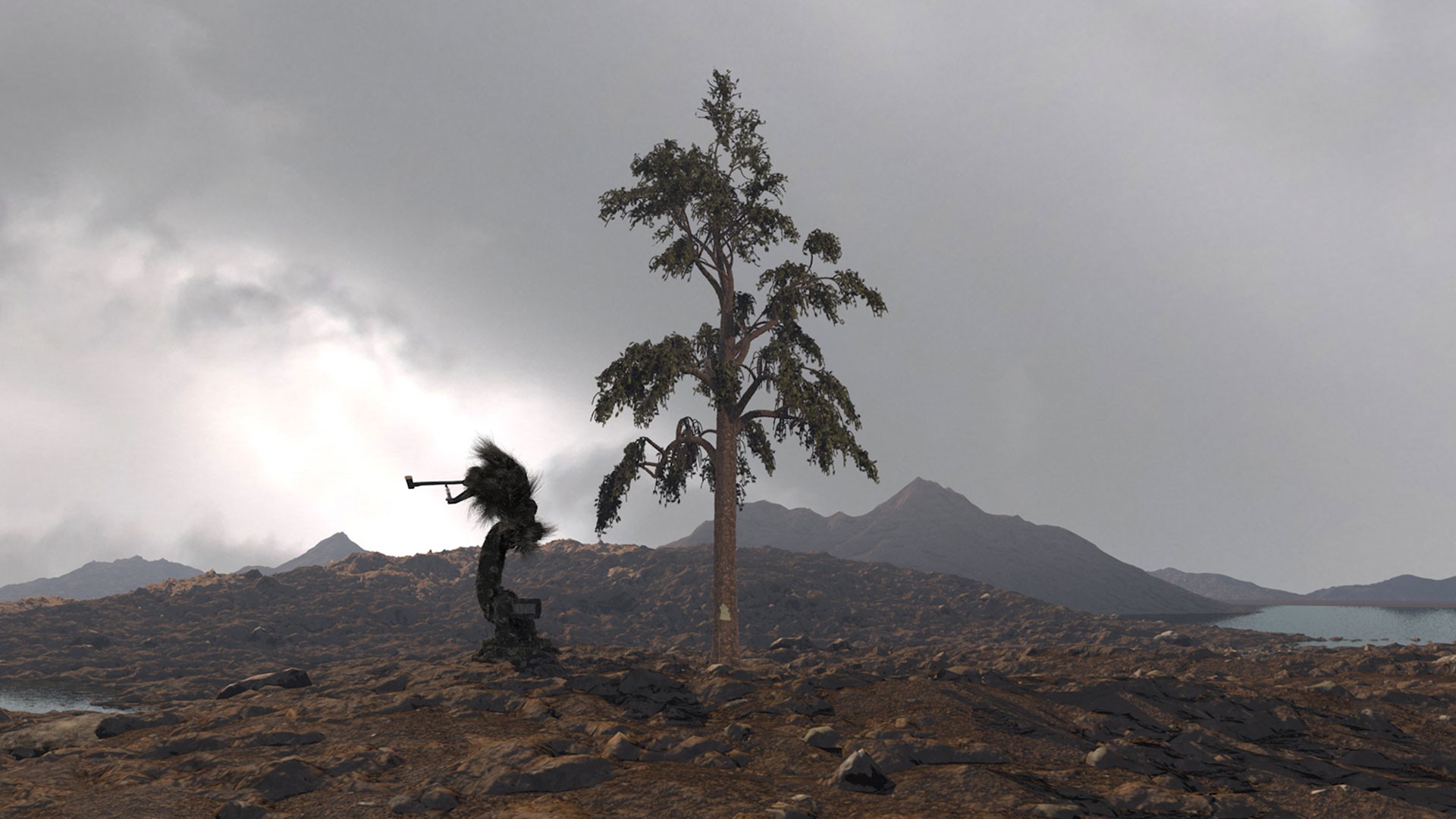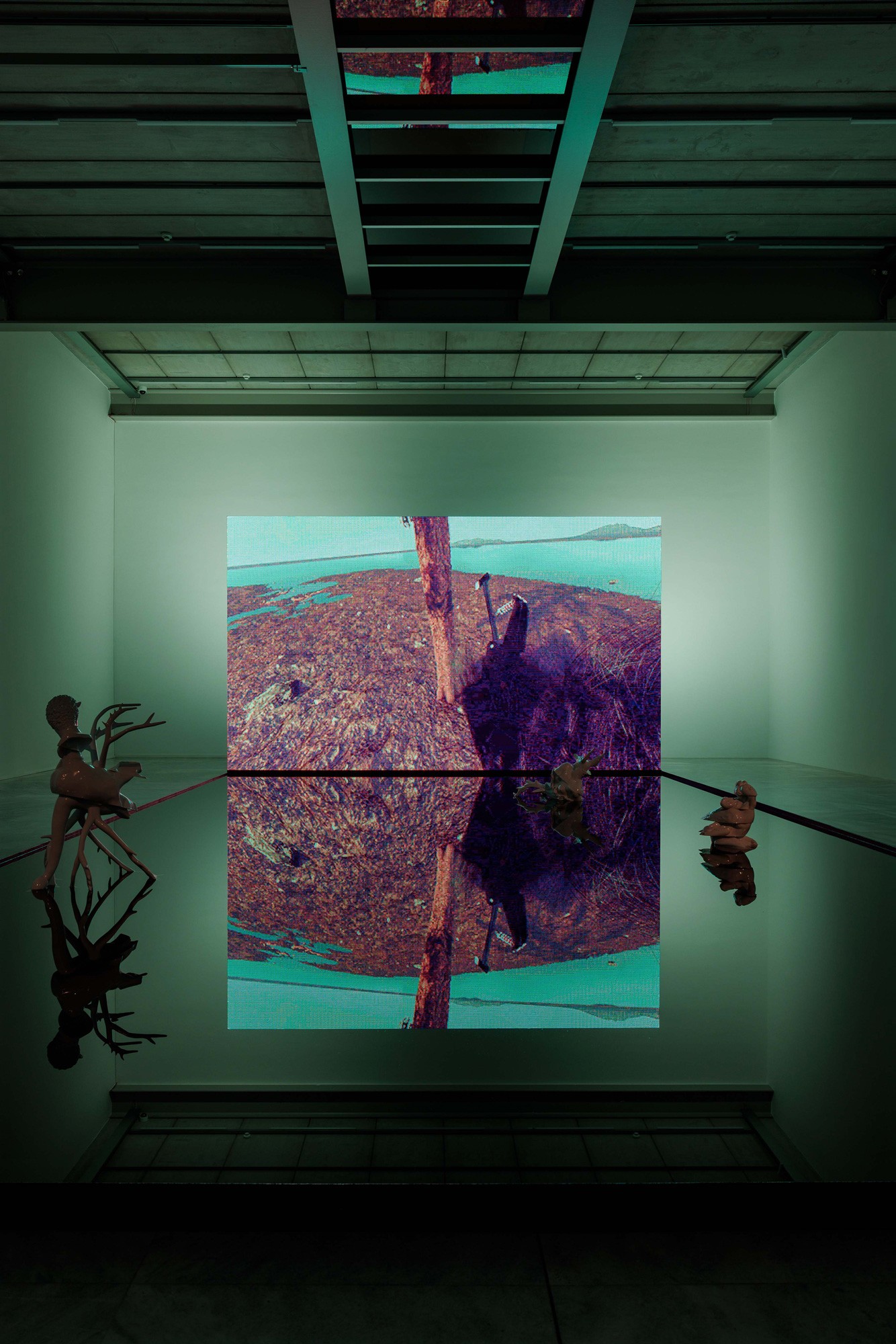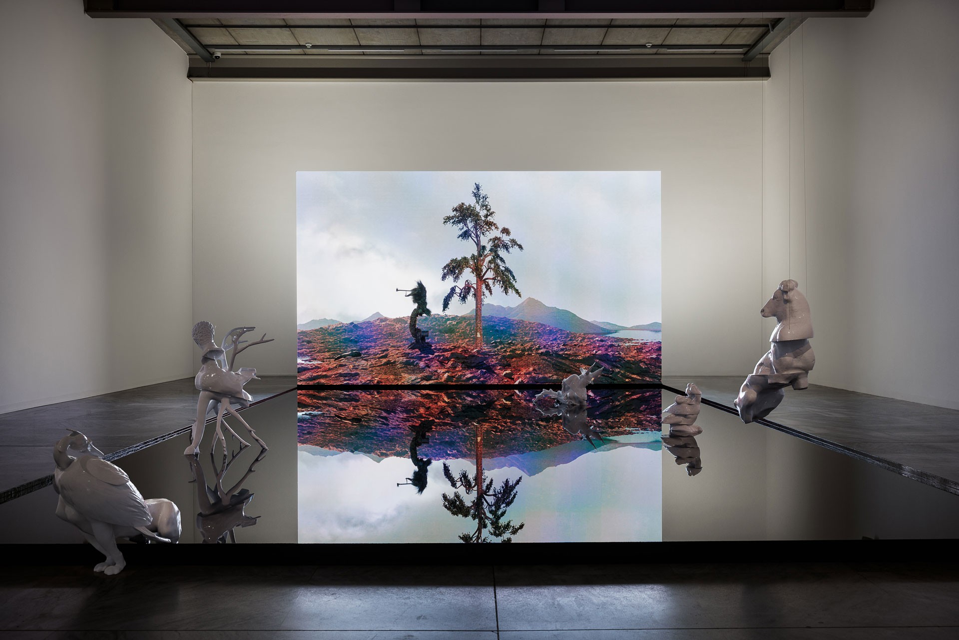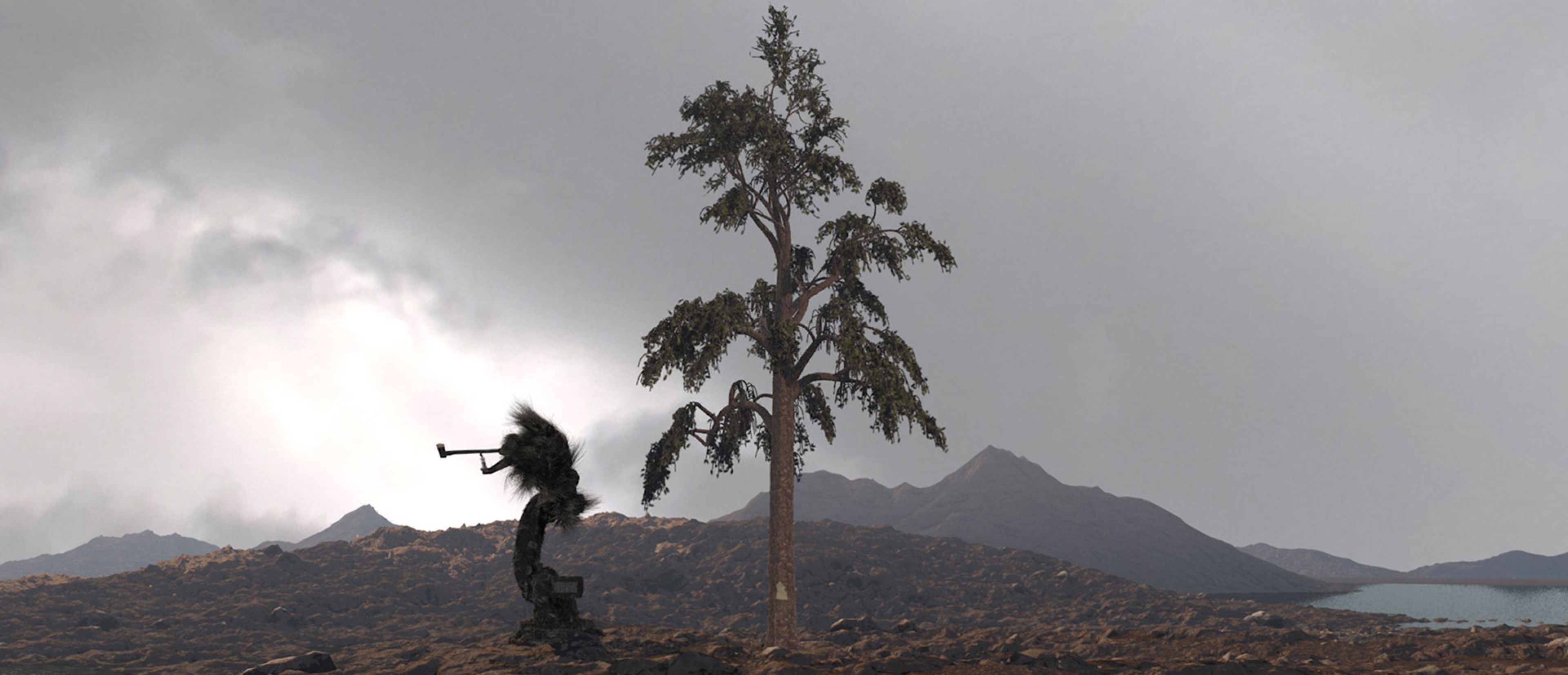 In the eponymous animation film, a robot covered in black fur is chopping down the last tree on Earth to a soundscape of radio waves reminiscent of birdsong. The cinematic plot is continued in the real exhibition space where 3D-printed digital twins of recombined museum objects—“Grenzgänger” (“crossers”)—populate the a flooded landscape as enigmatic hybrid creatures.