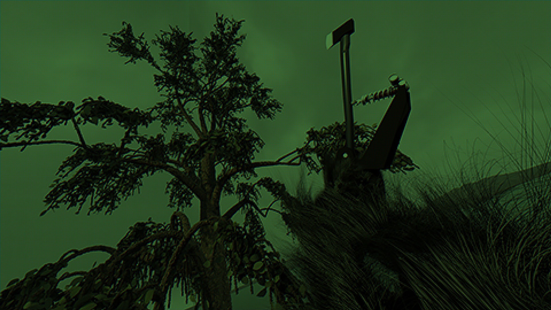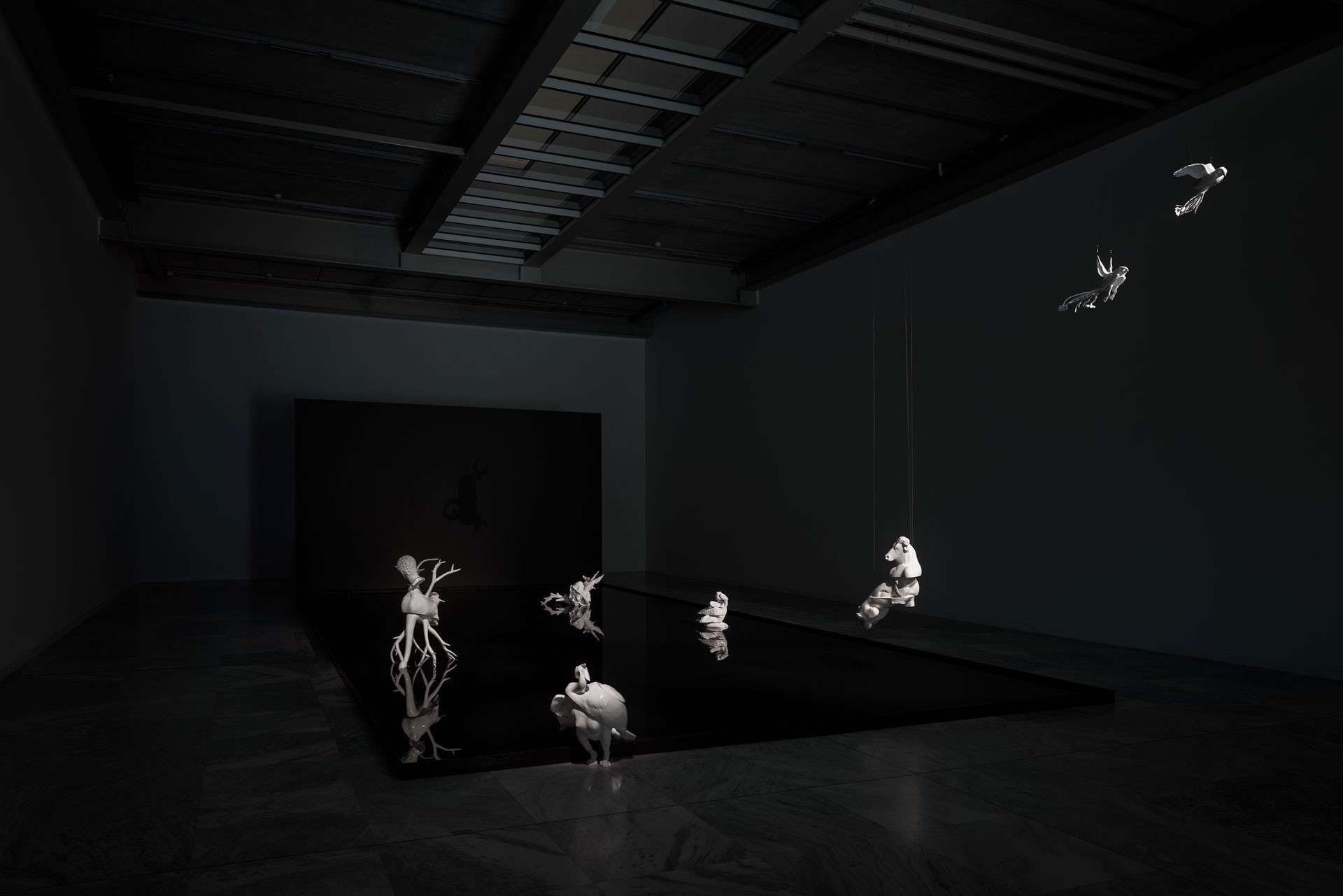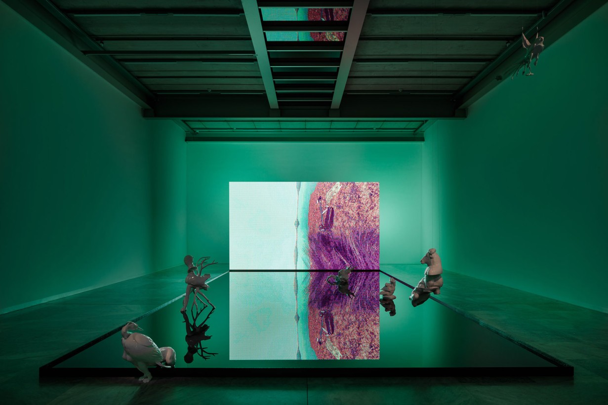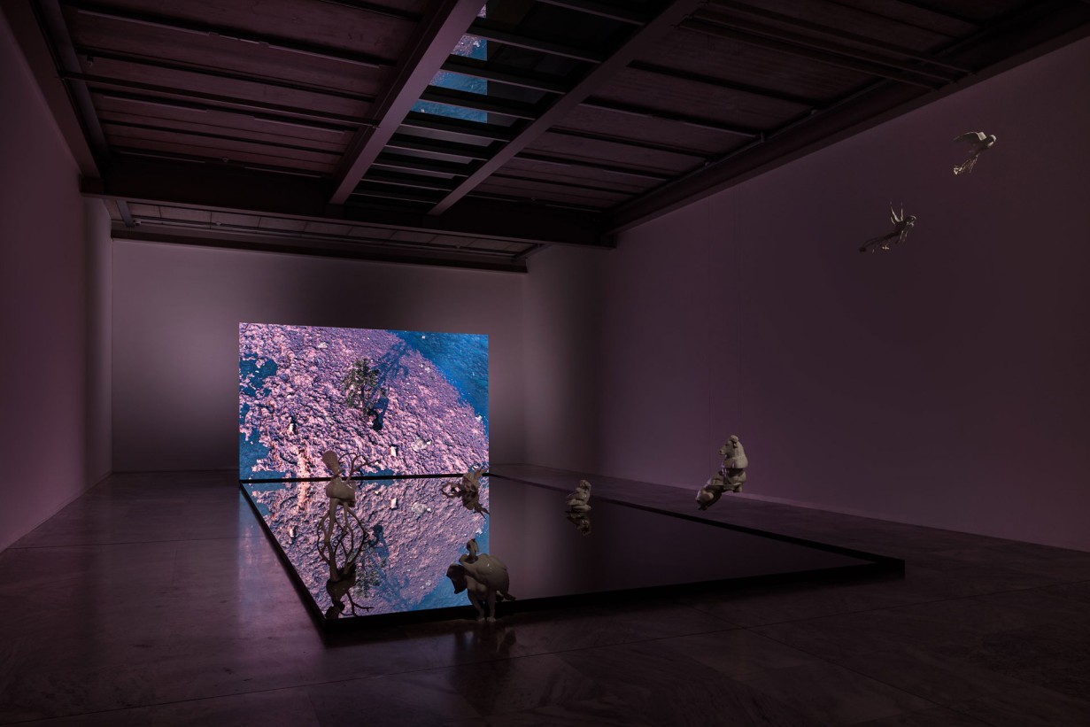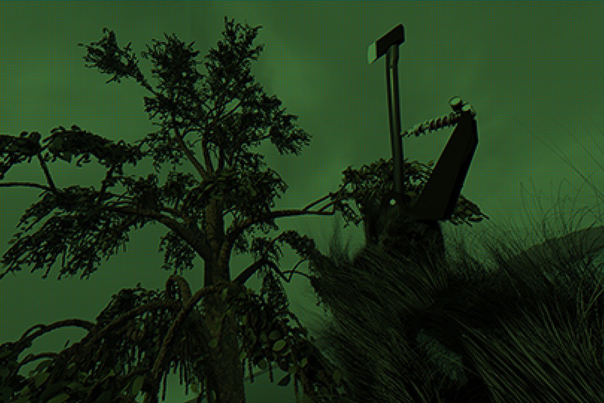 In the eponymous animation film, a robot covered in black fur is chopping down the last tree on Earth to a soundscape of radio waves reminiscent of birdsong. The cinematic plot is continued in the real exhibition space where 3D-printed digital twins of recombined museum objects—“Grenzgänger” (“crossers”)—populate the a flooded landscape as enigmatic hybrid creatures.
