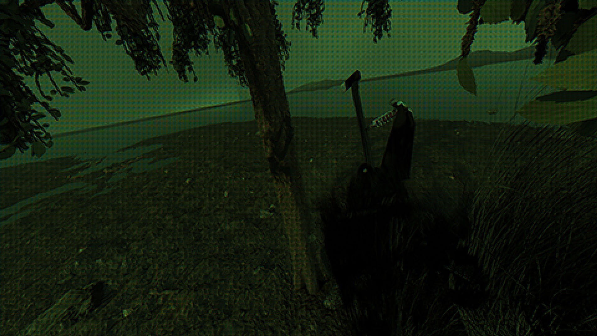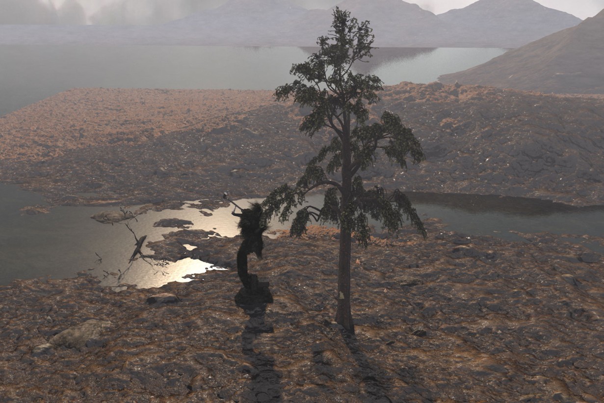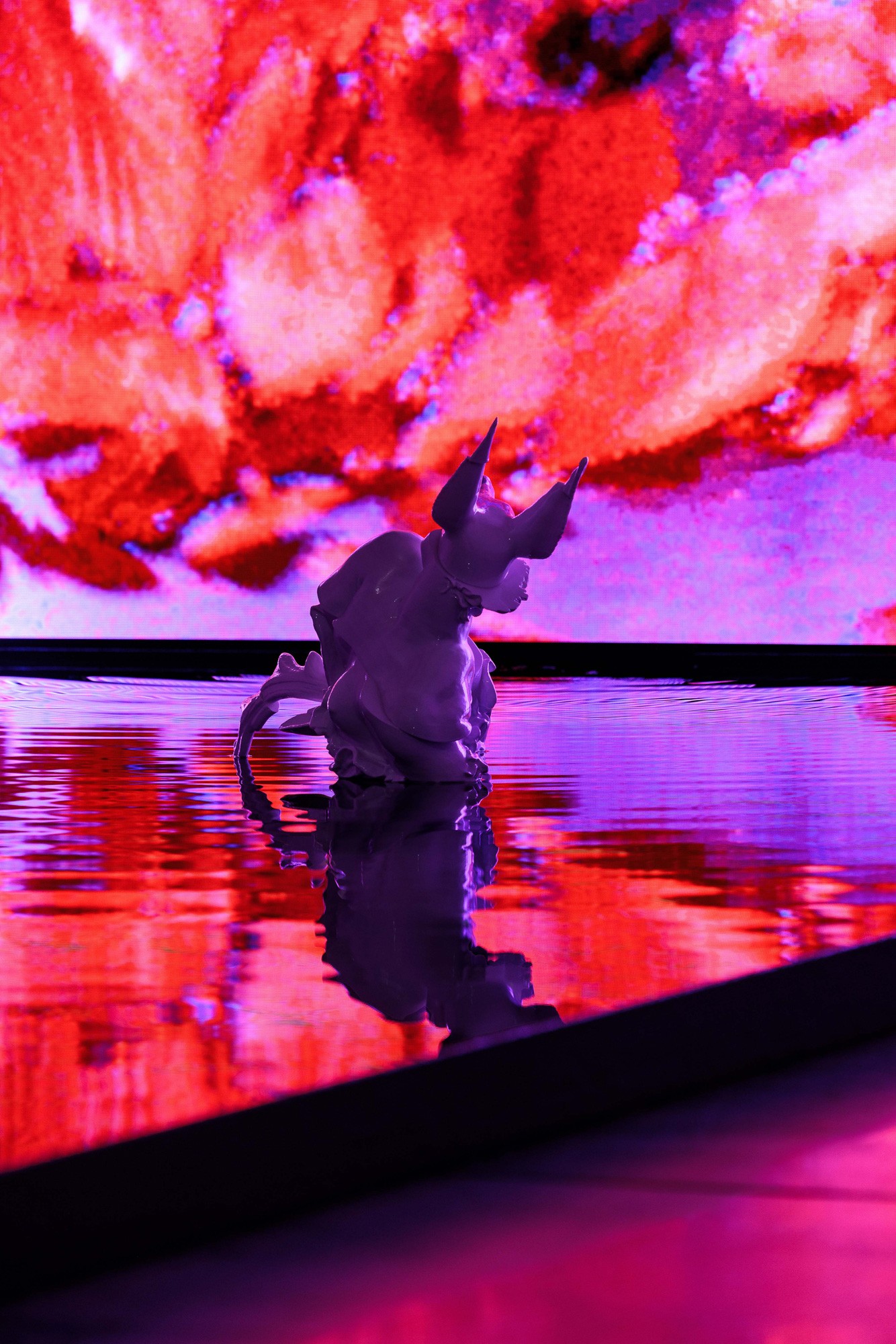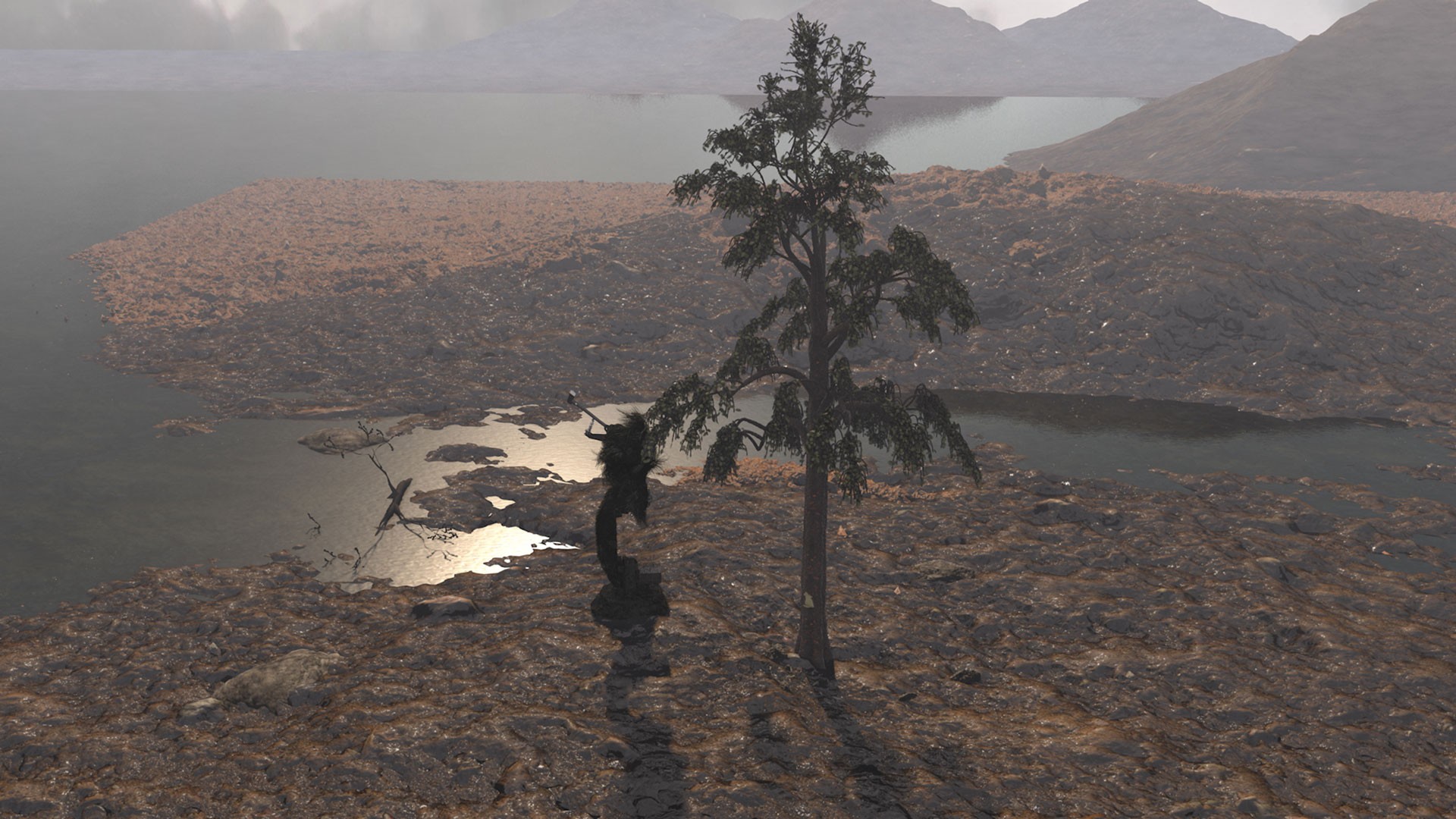 In the eponymous animation film, a robot covered in black fur is chopping down the last tree on Earth to a soundscape of radio waves reminiscent of birdsong. The cinematic plot is continued in the real exhibition space where 3D-printed digital twins of recombined museum objects—“Grenzgänger” (“crossers”)—populate the a flooded landscape as enigmatic hybrid creatures.