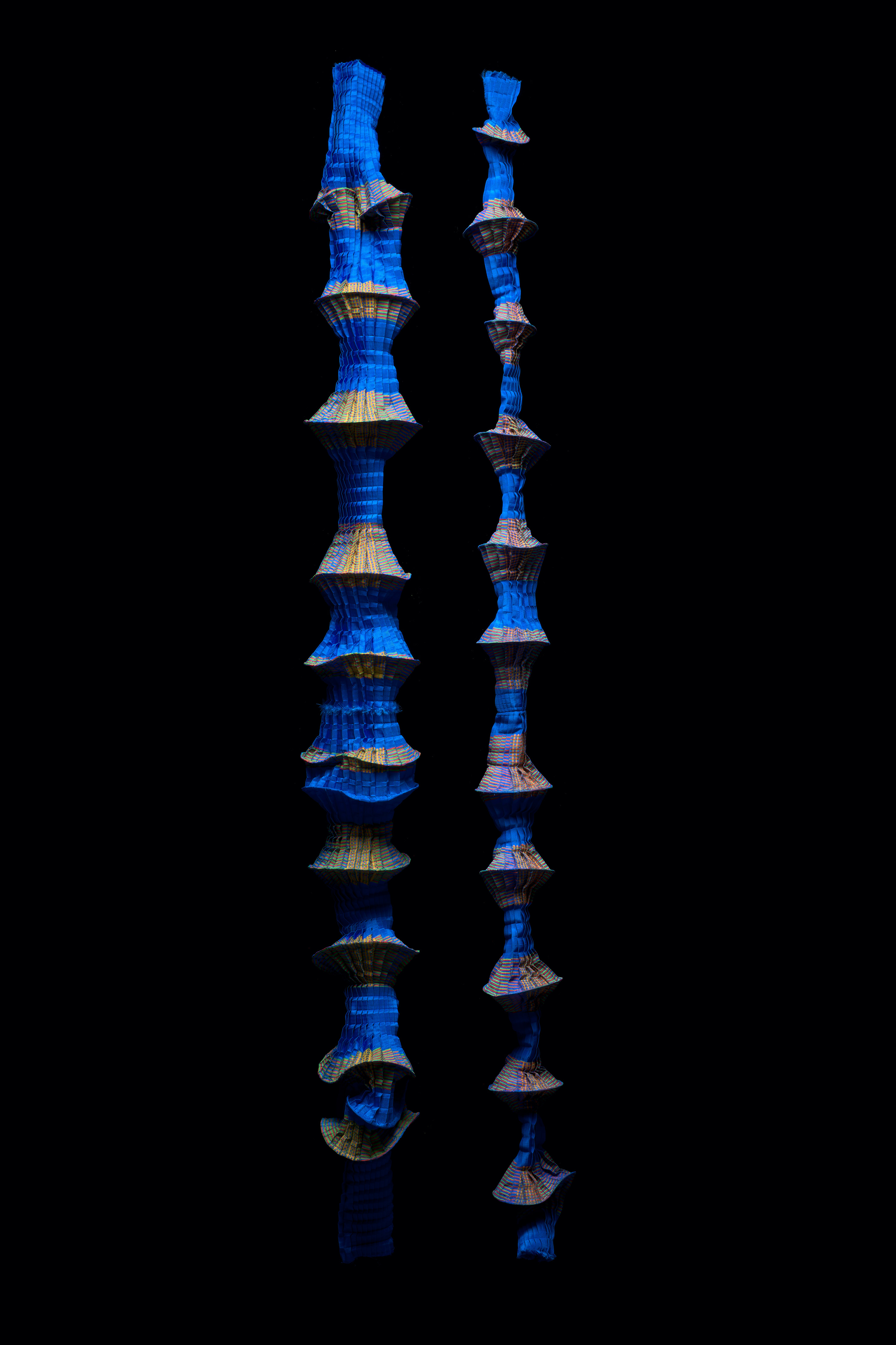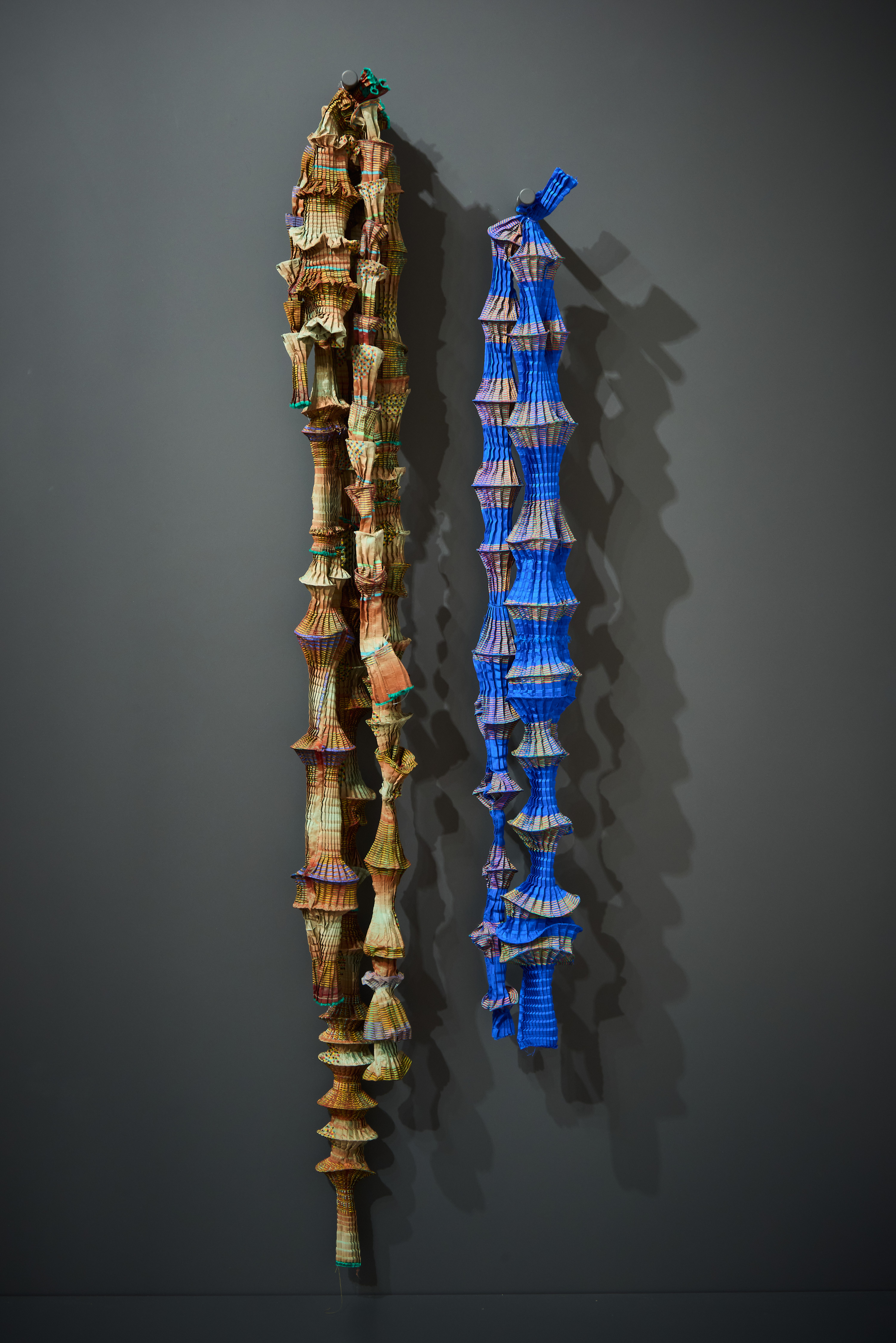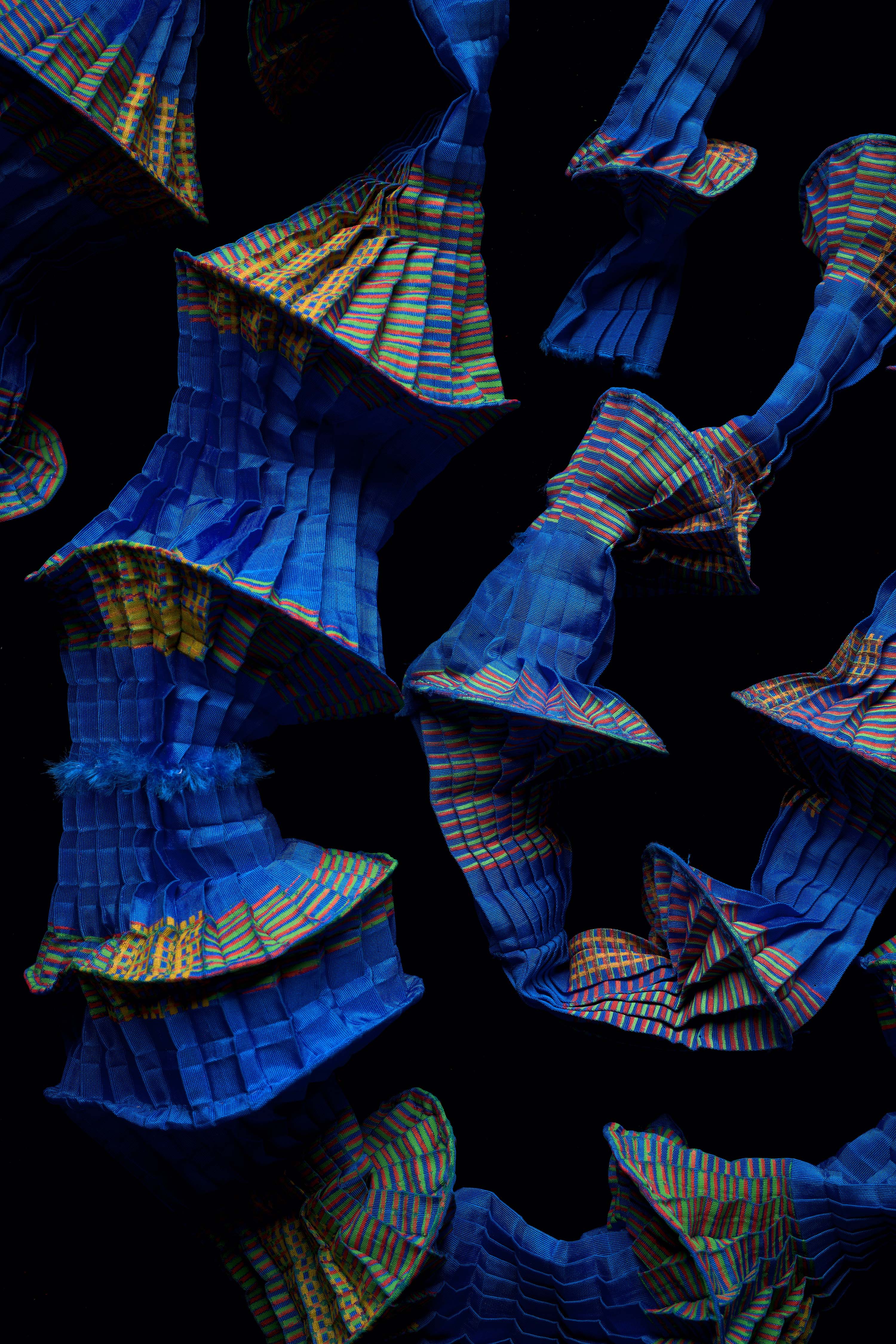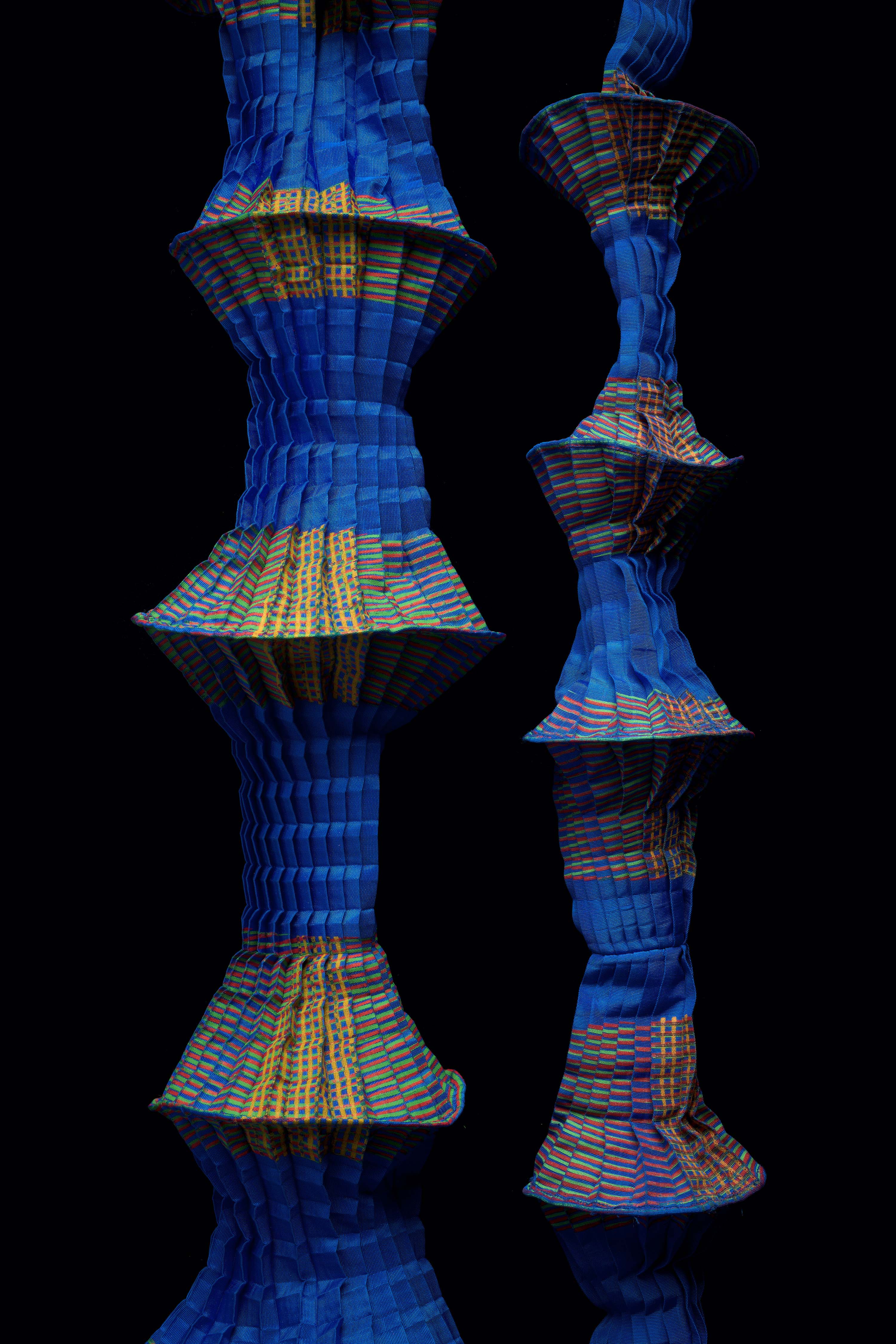Ursi Fürtler in Zusammenarbeit mit Walli Jungwirth, ohne Titel (textile Objekte), 2004 Kunstfaser, plissiert, bedruckt; Angelschnur