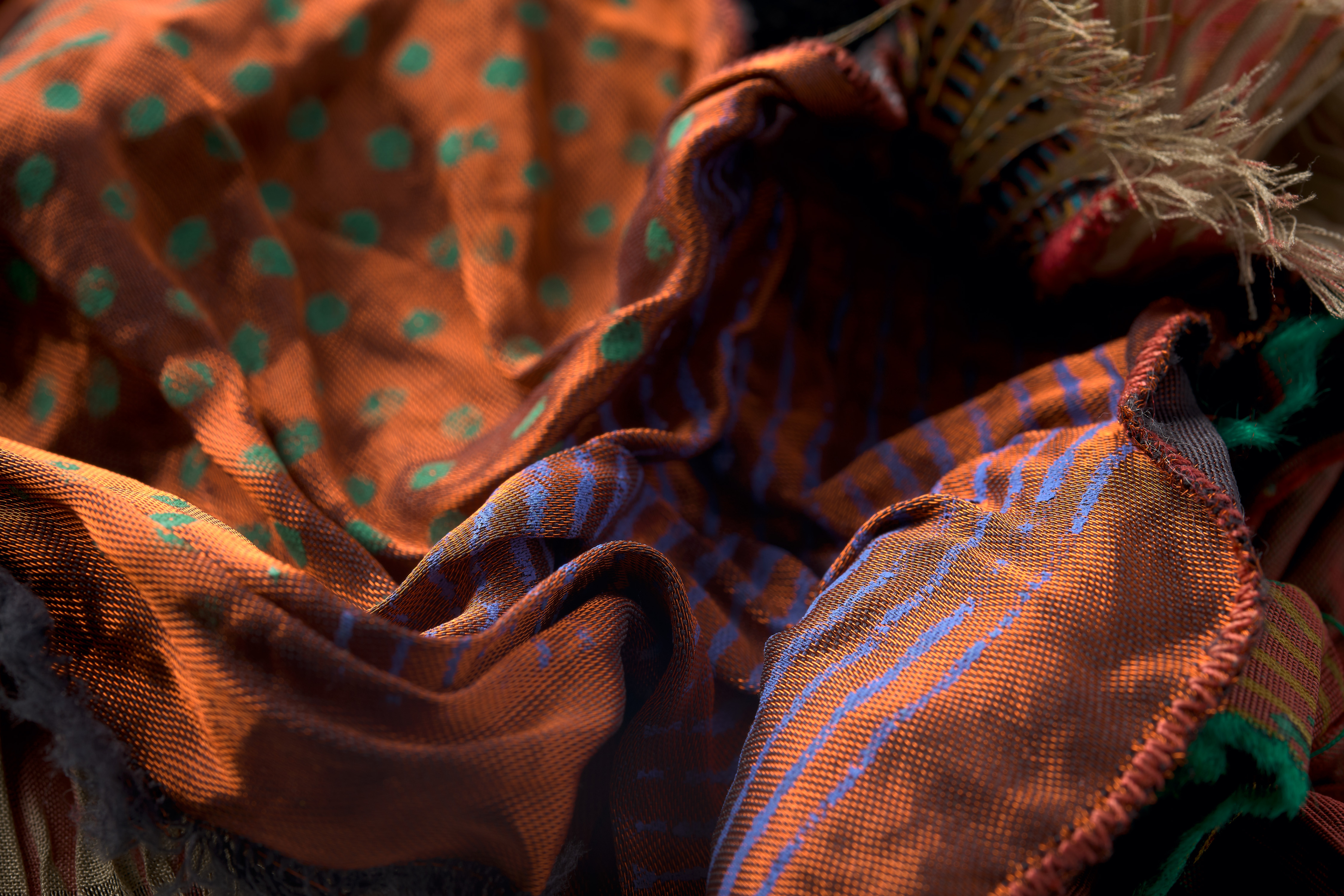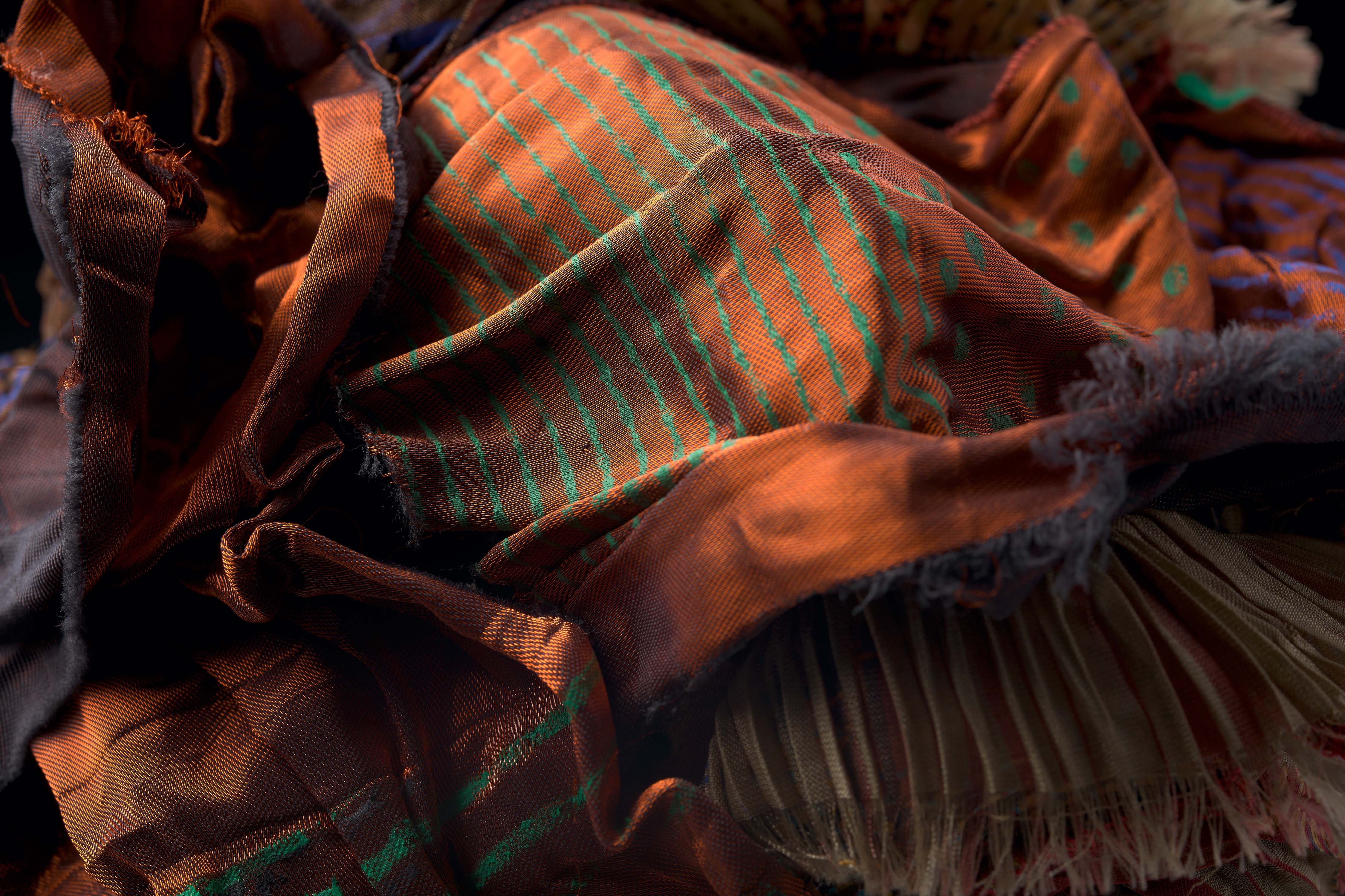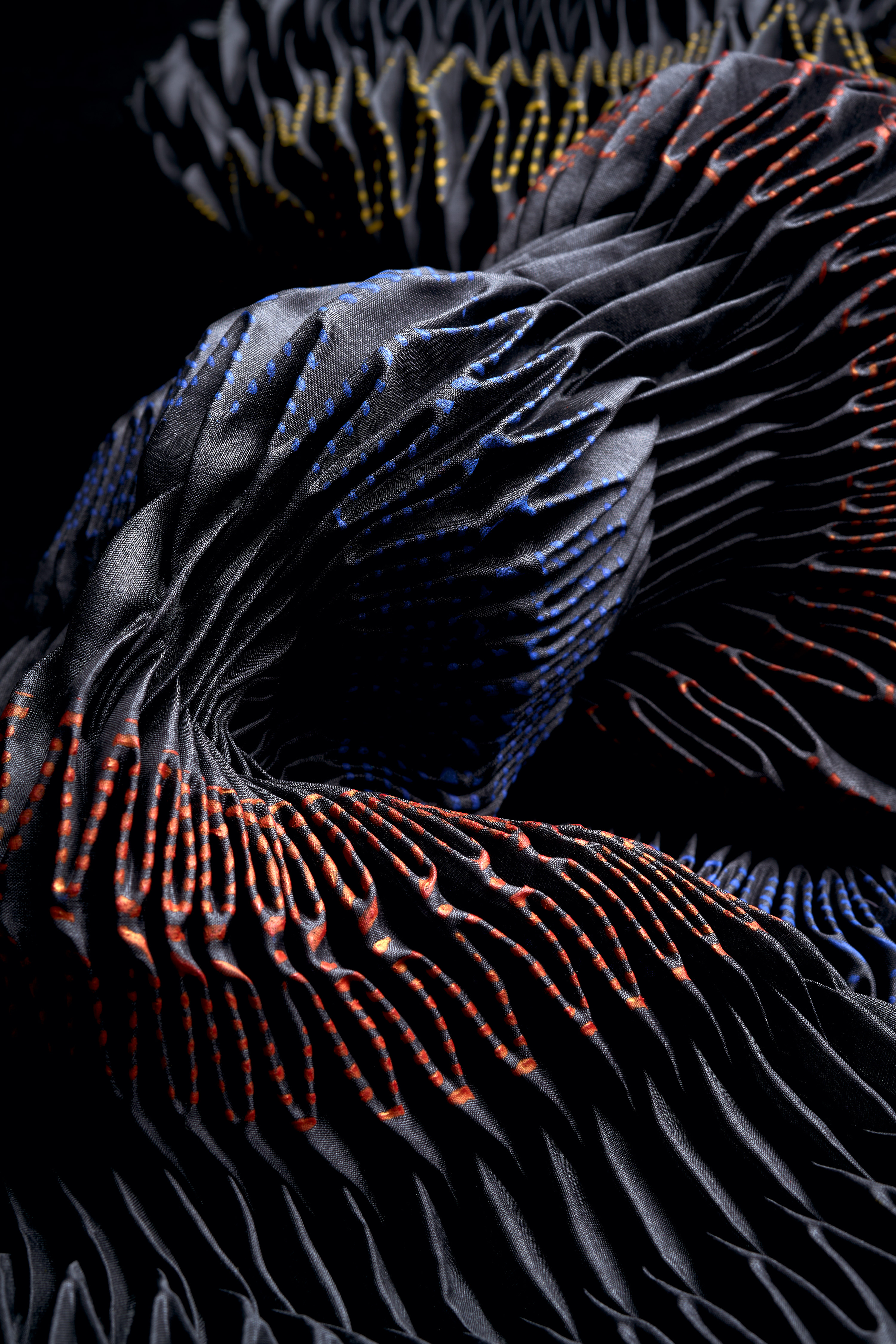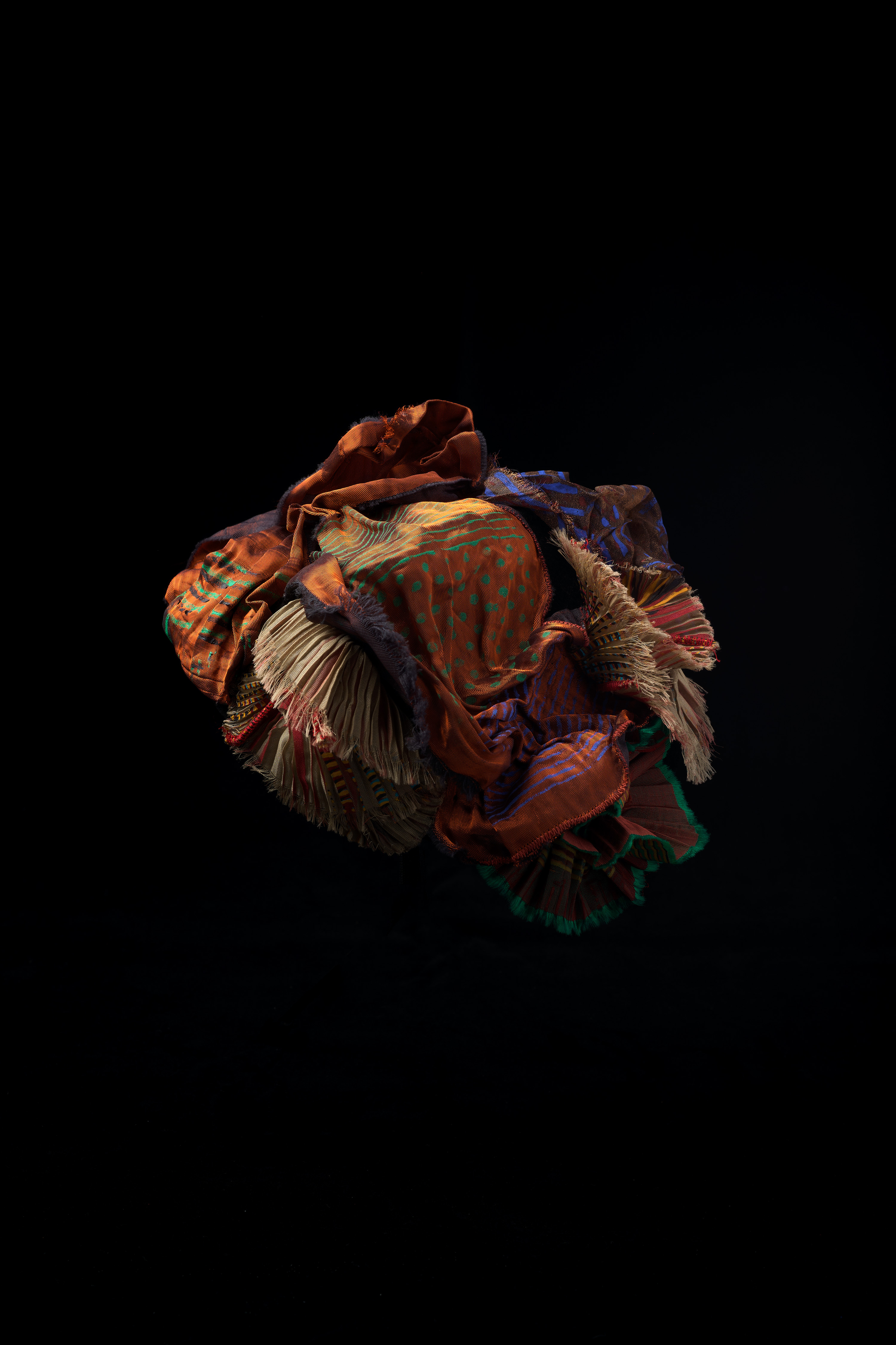 Ursi Fürtler in Zusammenarbeit mit Walli Jungwirth, ohne Titel (textile Objekte), 2004 Kunstfaser, plissiert, bedruckt; Angelschnur