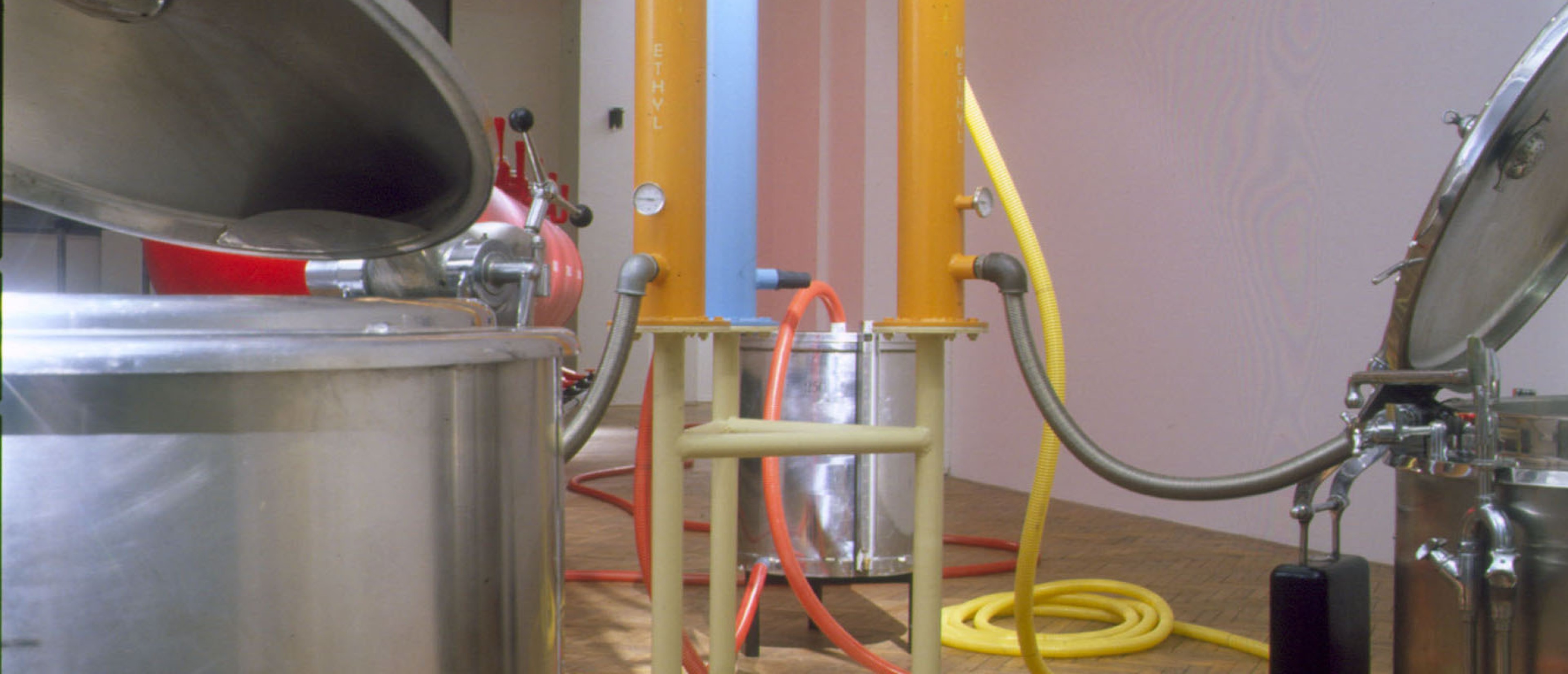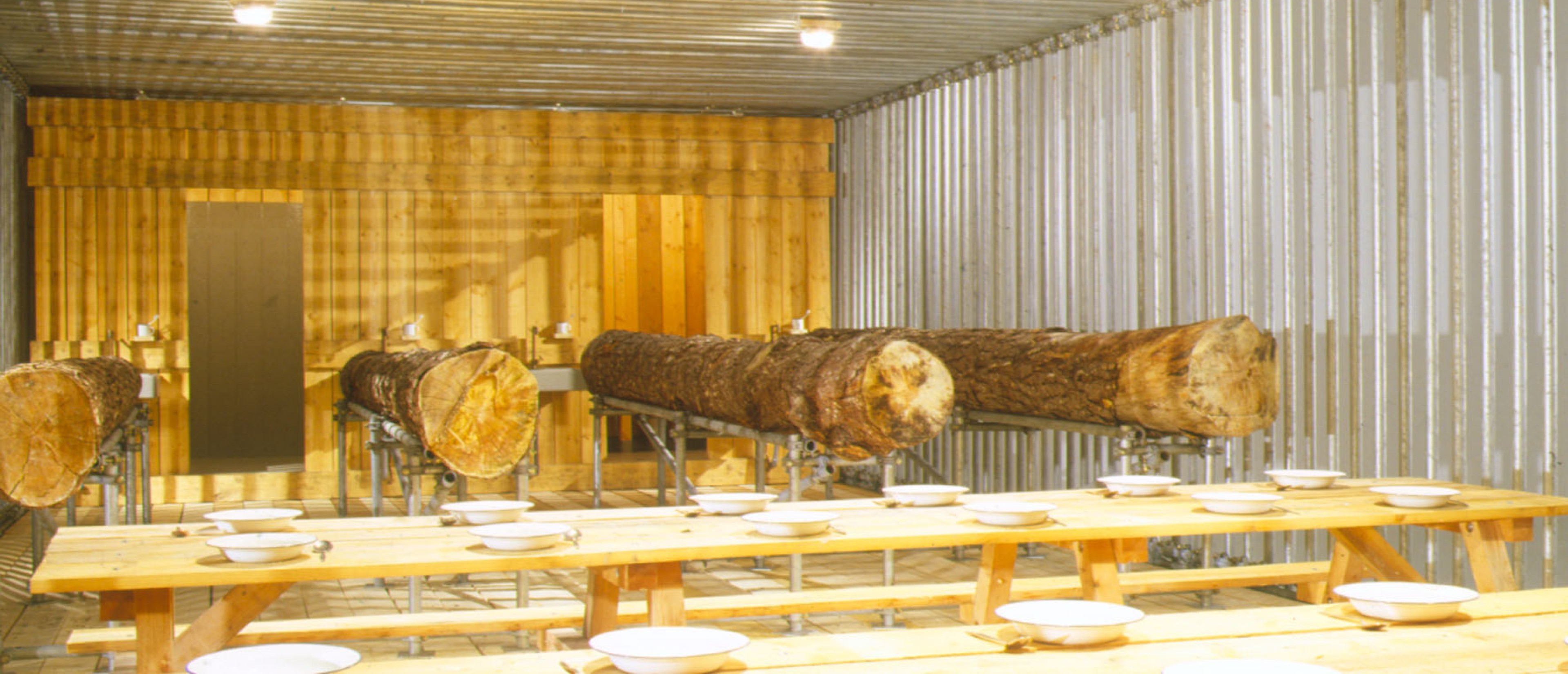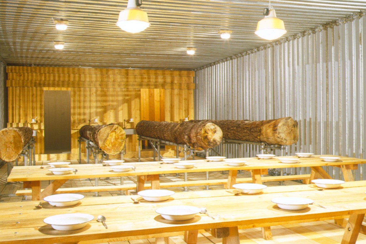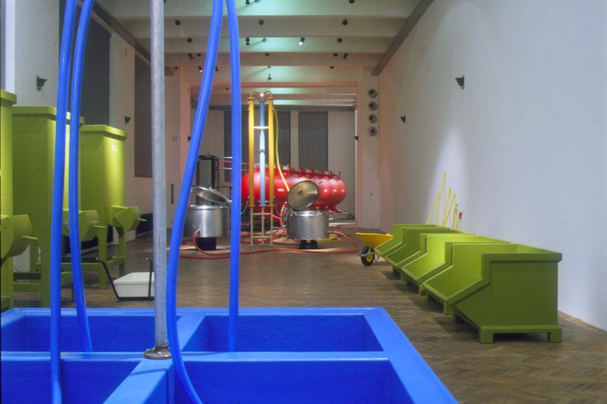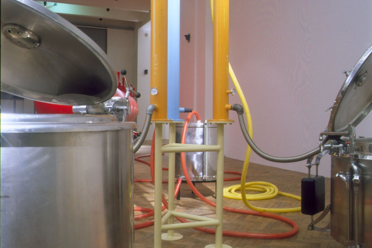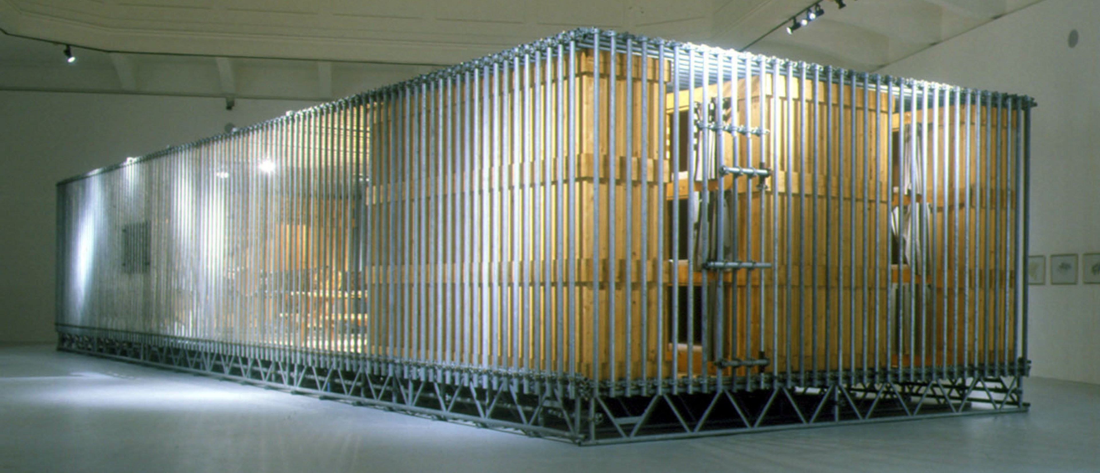 Zwei große AVL-Werkblöcke – „The Disciplinator“ (2003) und „The Technocrat“ (2004) – werden nun im MAK vorgestellt. Mit seinen gewaltigen Ausmaßen verwandelt der „Disciplinator“, eine käfigartige Konstruktion für 72 Insassen, die MAK Ausstellungshalle in ein modernes Arbeitslager, das auf Maximalprofit durch Rationalismus setzt. So verweisen die 24 Schlafeinheiten auf dreifache Schichtbelegung und zeugen von der skurrilen Perfektion, mit der Friktionen jeder Art ausgeschaltet werden. Gerade weil die moralische Stellungnahme seitens AVL ausbleibt, vermittelt der „Disciplinator“ ein unverfälschtes Schreckensbild vom Prinzip der Ausbeutung an sich. Auch der „Technocrat“ – ein in sich geschlossener Kreislauf aus Nahrung, Alkohol, Exkrementen und Energie – setzt auf Provokation durch Rationalismus. In diesem System funktioniert der Mensch als biologisches Zahnrad, das einen ganzen Maschinenpark antreibt: Er liefert das Rohmaterial zur Erzeugung von Methangas, das wiederum zur Zubereitung von Essen und zur Produktion von Alkohol eingesetzt wird: Die 1.000 Bürger, die für den reibungslosen Betrieb der Anlage notwendig sind, müssen naturgemäß bei Laune gehalten werden. Auf ironische Weise kommentiert der „Technocrat“ die Stellung des modernen Menschen in einer hoch technologischen Gesellschaft, die nur scheinbar grenzenlose Möglichkeiten und Freiheit garantiert.