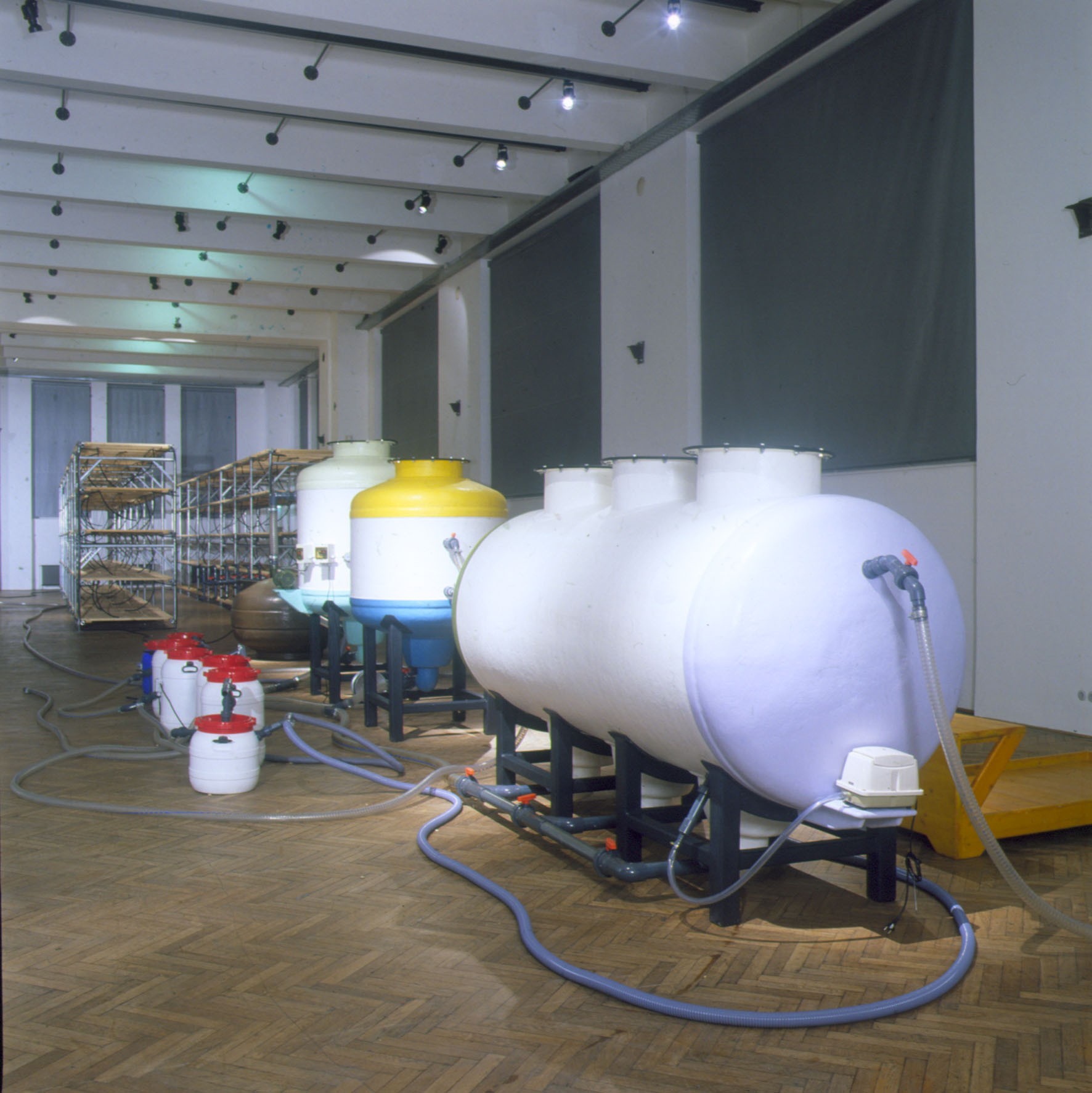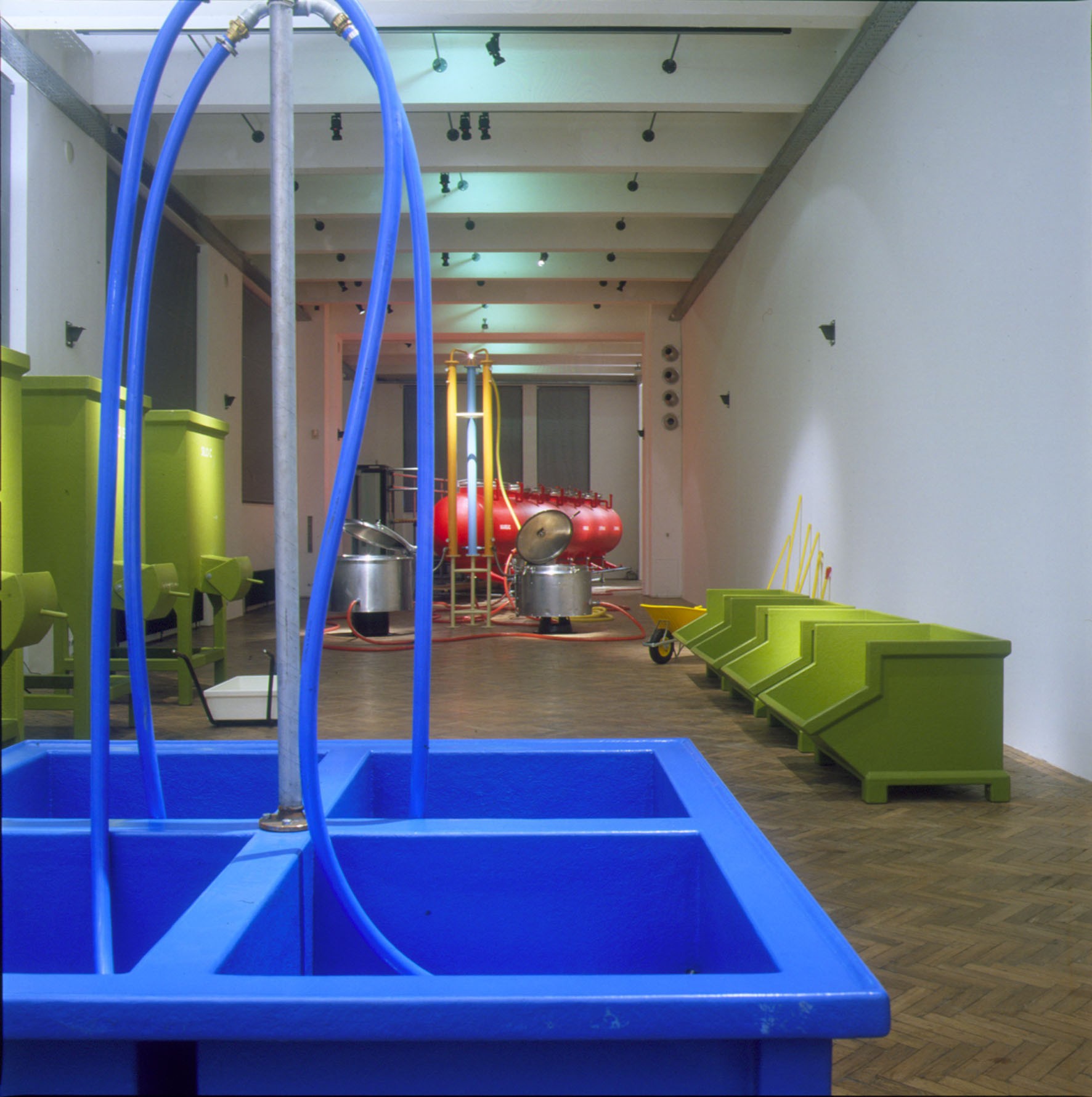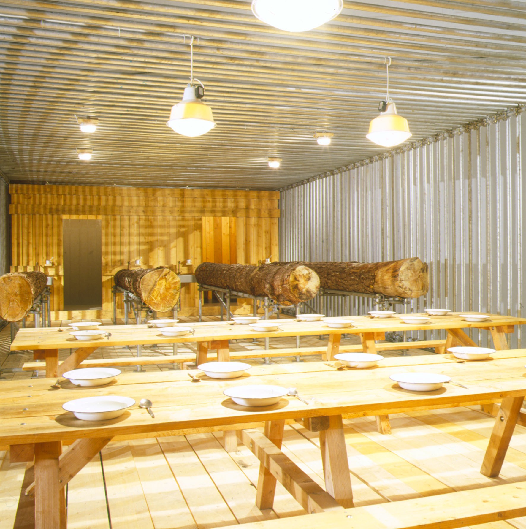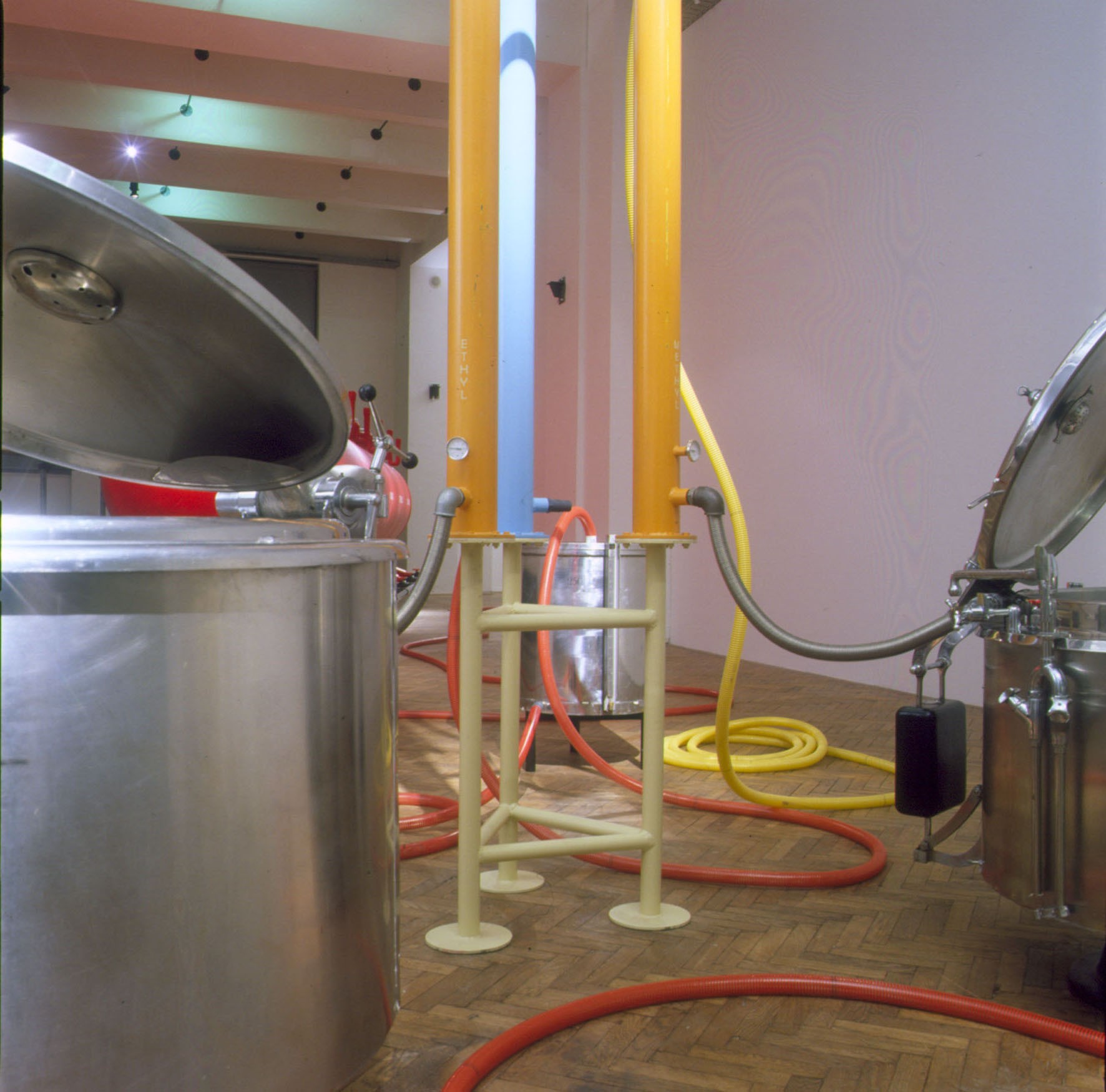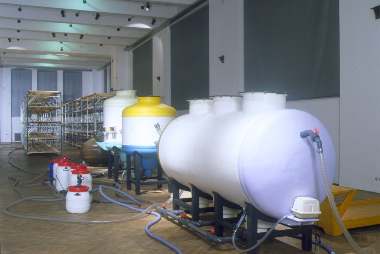 Zwei große AVL-Werkblöcke – „The Disciplinator“ (2003) und „The Technocrat“ (2004) – werden nun im MAK vorgestellt. Mit seinen gewaltigen Ausmaßen verwandelt der „Disciplinator“, eine käfigartige Konstruktion für 72 Insassen, die MAK Ausstellungshalle in ein modernes Arbeitslager, das auf Maximalprofit durch Rationalismus setzt. So verweisen die 24 Schlafeinheiten auf dreifache Schichtbelegung und zeugen von der skurrilen Perfektion, mit der Friktionen jeder Art ausgeschaltet werden. Gerade weil die moralische Stellungnahme seitens AVL ausbleibt, vermittelt der „Disciplinator“ ein unverfälschtes Schreckensbild vom Prinzip der Ausbeutung an sich. Auch der „Technocrat“ – ein in sich geschlossener Kreislauf aus Nahrung, Alkohol, Exkrementen und Energie – setzt auf Provokation durch Rationalismus. In diesem System funktioniert der Mensch als biologisches Zahnrad, das einen ganzen Maschinenpark antreibt: Er liefert das Rohmaterial zur Erzeugung von Methangas, das wiederum zur Zubereitung von Essen und zur Produktion von Alkohol eingesetzt wird: Die 1.000 Bürger, die für den reibungslosen Betrieb der Anlage notwendig sind, müssen naturgemäß bei Laune gehalten werden. Auf ironische Weise kommentiert der „Technocrat“ die Stellung des modernen Menschen in einer hoch technologischen Gesellschaft, die nur scheinbar grenzenlose Möglichkeiten und Freiheit garantiert.