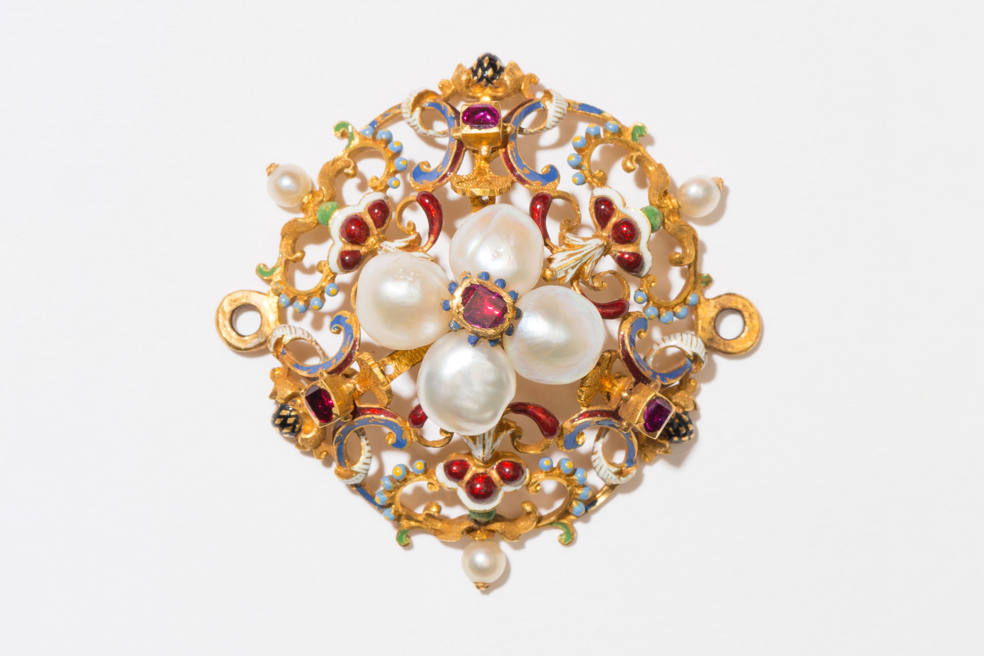 Rosette aus dem sogenannten Haller Schmuck, um 1580, Ausführung: Münchner Hofwerkstatt Gold, Email, Rubine, Perlen, MAK, BJ 931-1 © MAK/Nathan Murrell