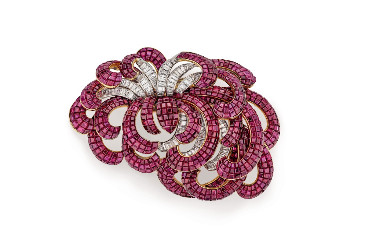 Clip Chrysanthemum, 1937, Platin, Gelbgold, Mystery-Set-Rubine, Diamanten © Van Cleef & Arpels Collection