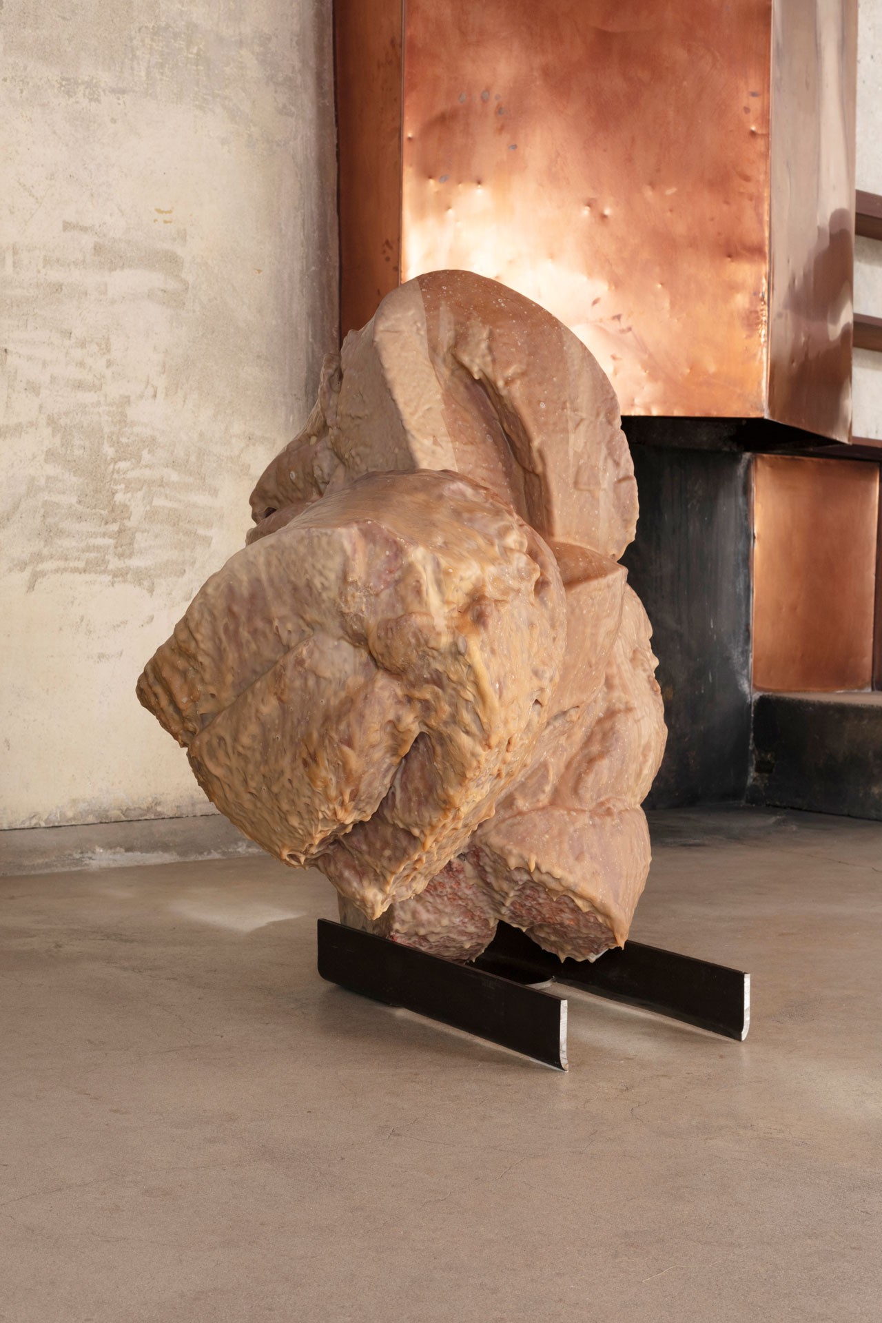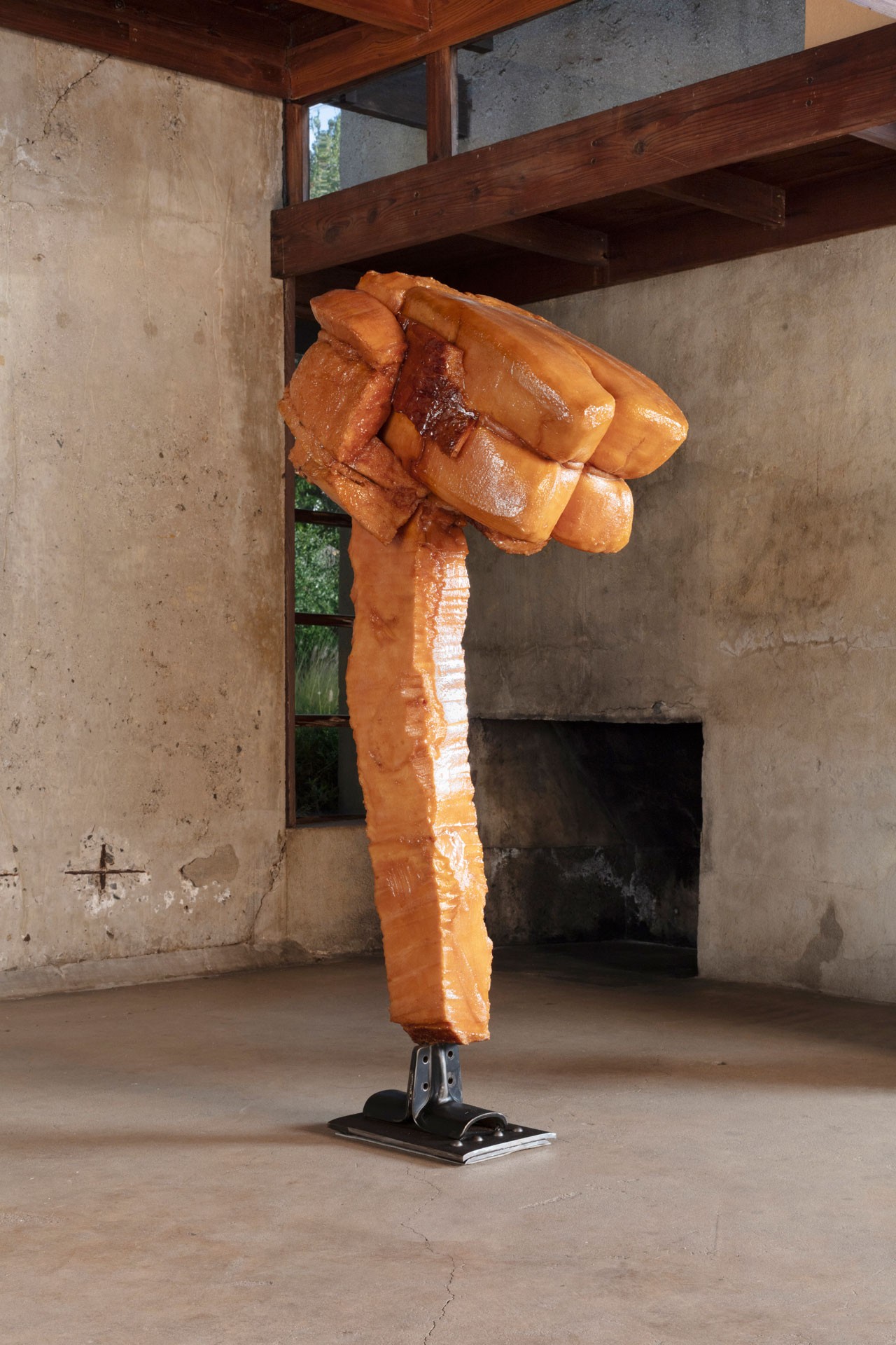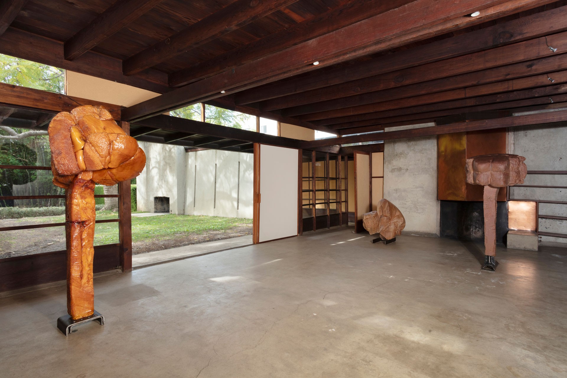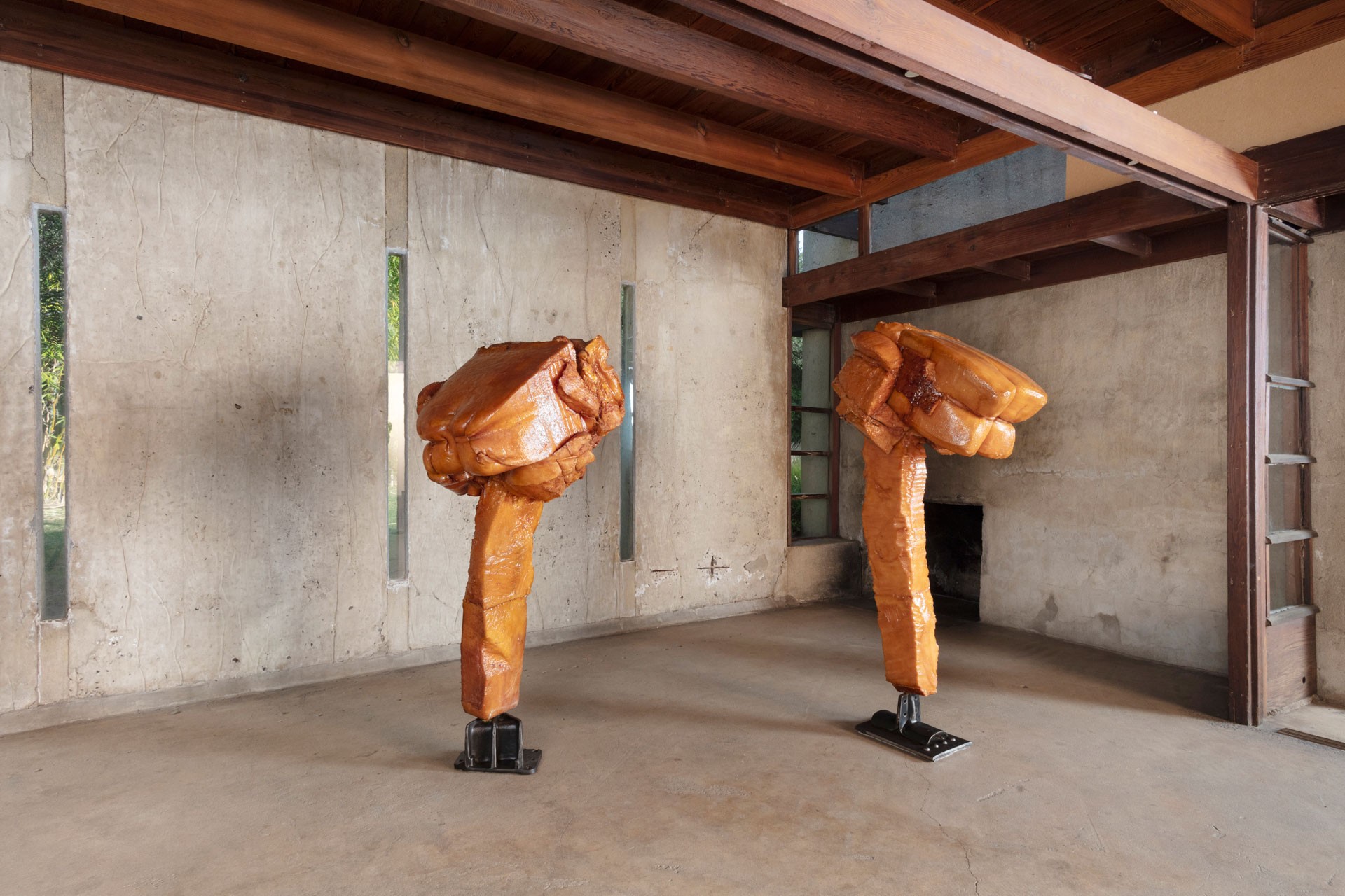 The historic house designed by fellow Austrian Rudolph Schindler provides the spare, proto-minimalist frame for a series of freestanding sculptures. Neither entirely figurative nor entirely abstract, they bring a fundamentally reductivist approach to material that is deeply impregnated with the burden of history. Sometimes this reads as a confrontation between the body and its past derelictions. At others the current is sexual, an accumulated tension that itself becomes a stand-in for human identity, vulnerability and desire. Always they occupy a liminal space where form is in a continual state of becoming.