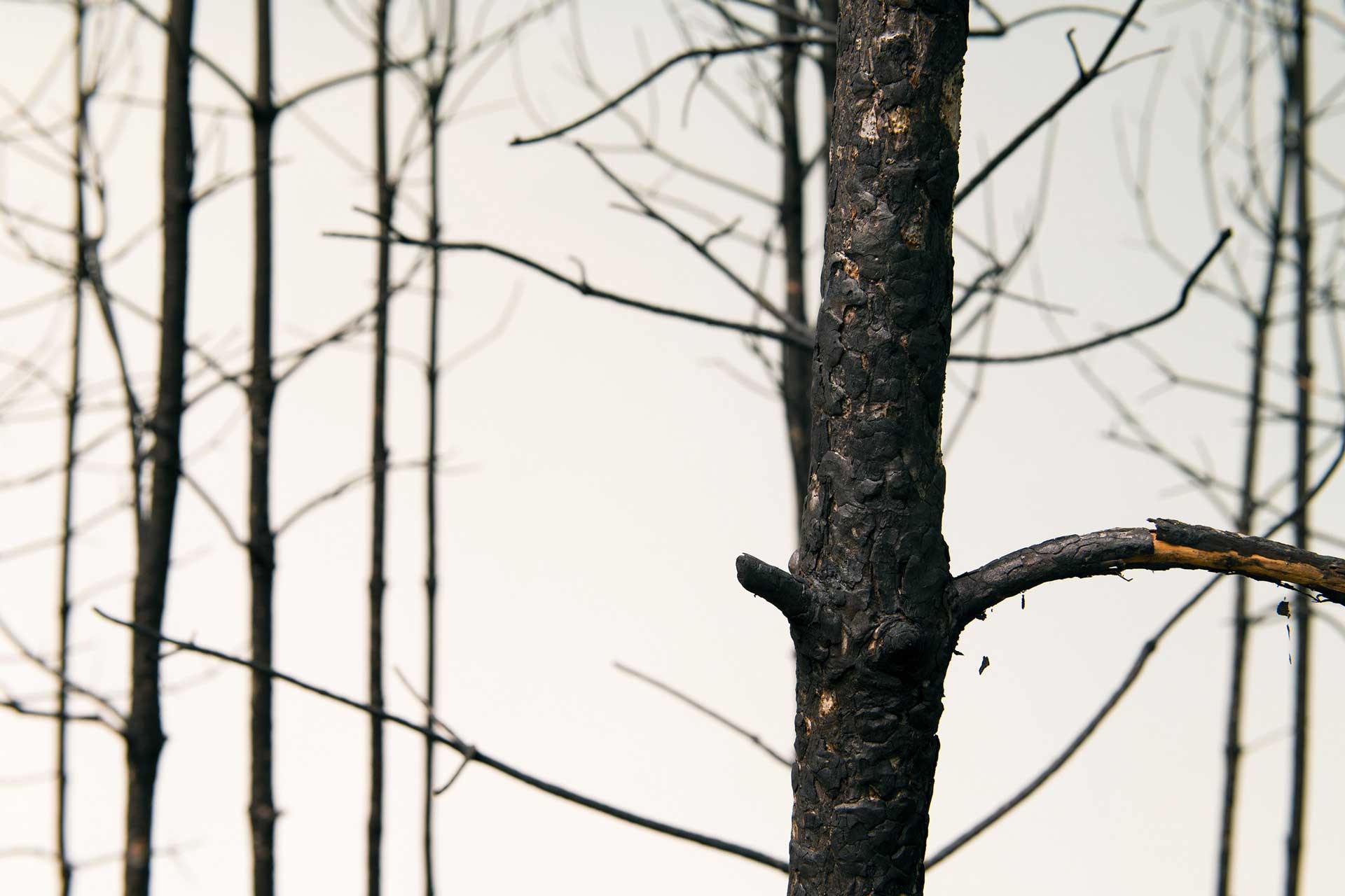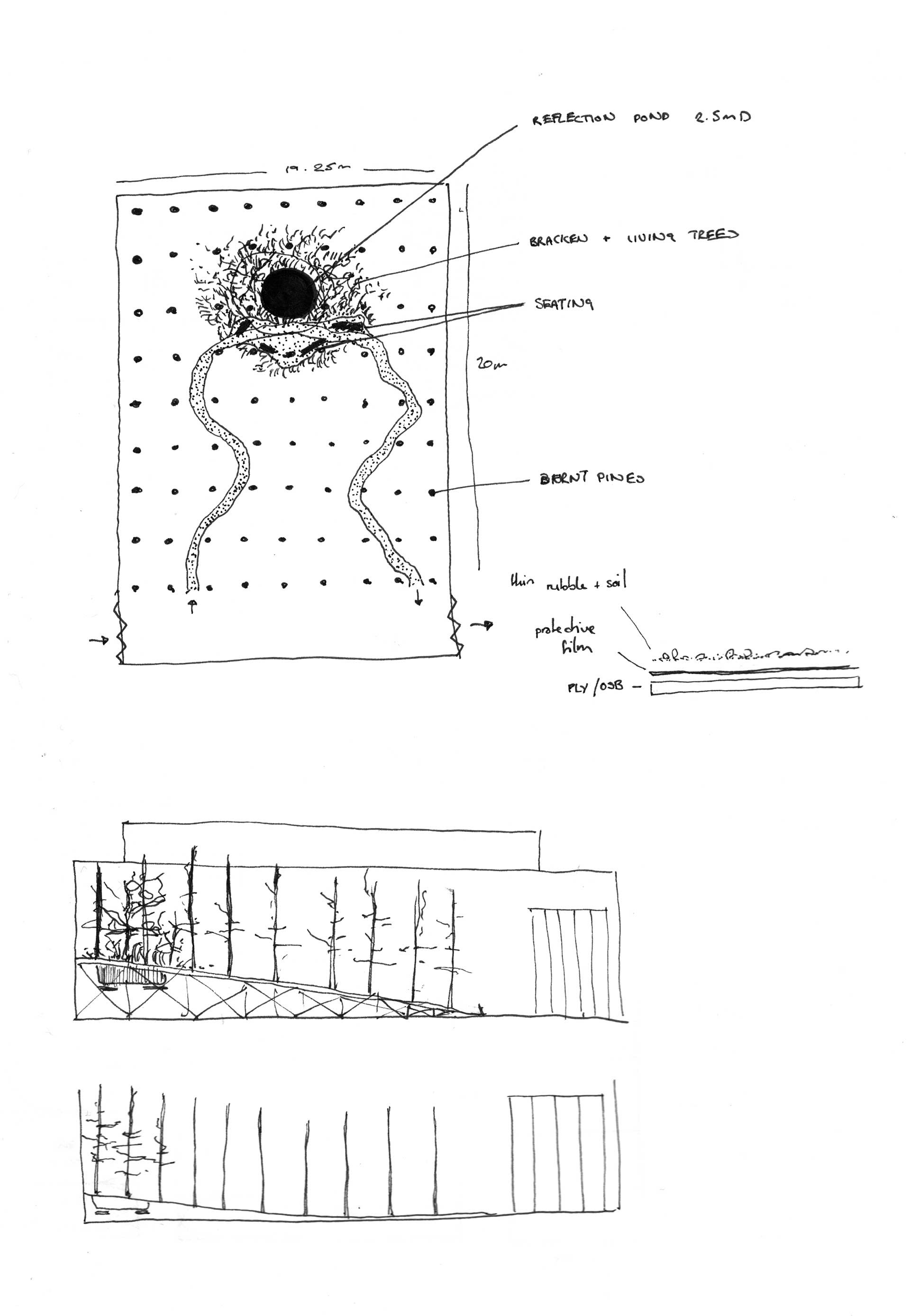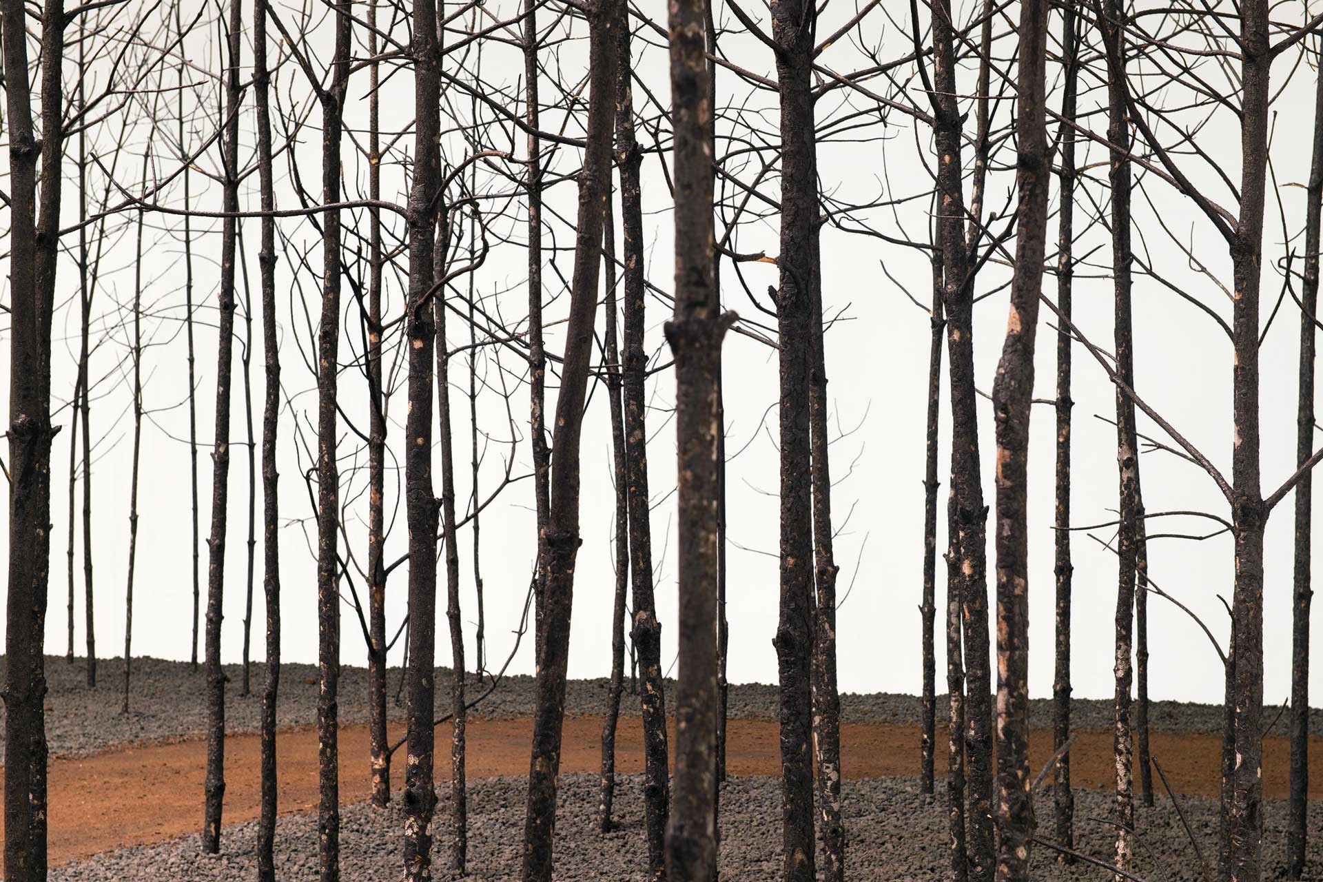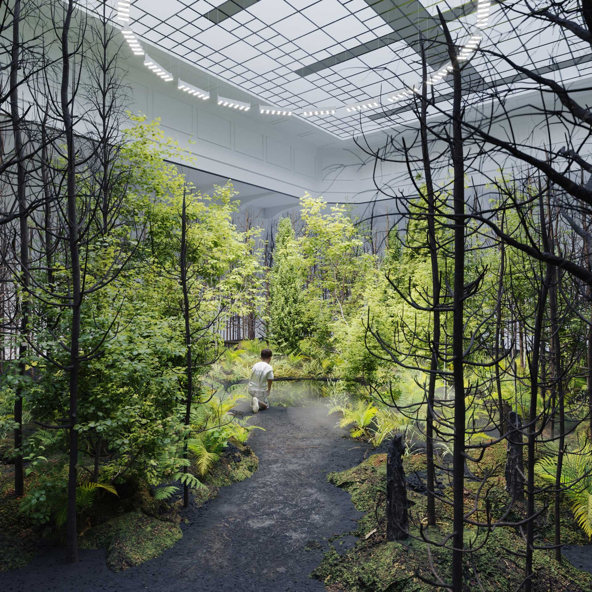 In Kooperation mit dem Forstamt und der Feuerwehr der österreichischen Region Neunkirchen (NÖ) bringen die Designer*innen mehrere Hundert Bäume, die kürzlich bei einem Waldbrand verbrannt sind, ins MAK. Während die Besucher*innen durch den Wald gehen, können sie wahrnehmen, dass die Baum-Skelette anmutig ihre Fruchtbarkeit an die Erde um sie herum zurückgeben. An einer Lichtung angekommen, lädt eine glitzernde Wasseroberfläche die Besucher*innen dazu ein, darin ihre Spiegelungen neben denen vieler anderer Spezies auf dem Planeten zu betrachten.