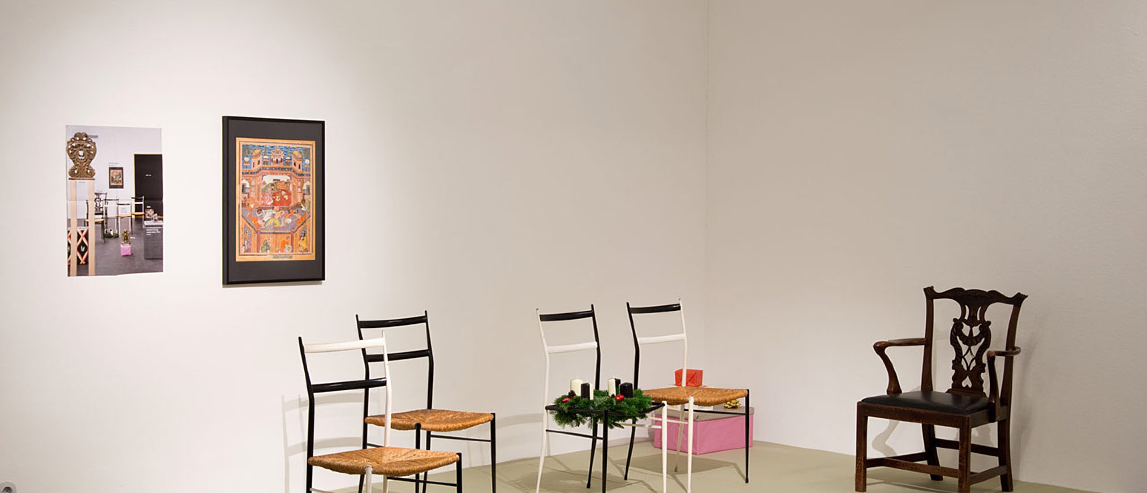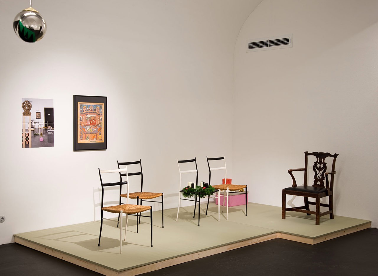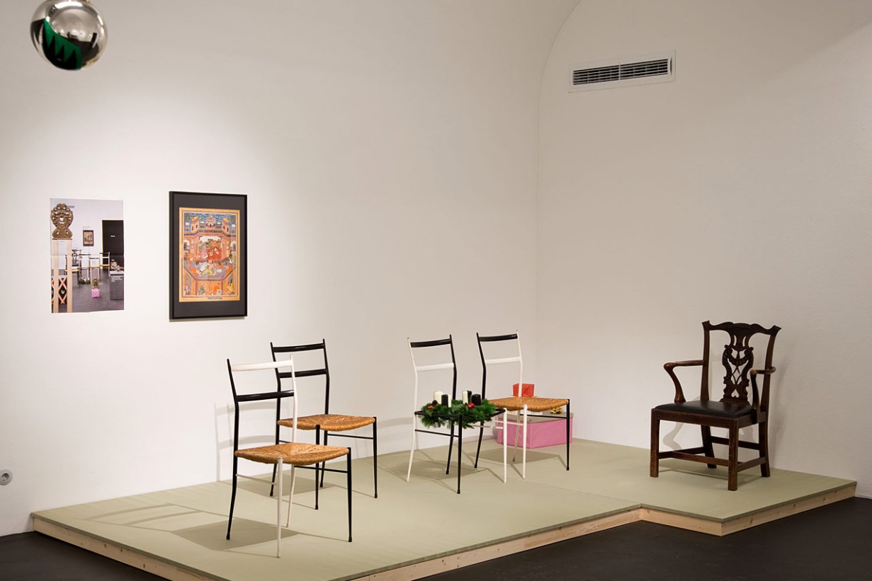 Mit eigens von einem MAK-Tischler für Kathi Hofer angefertigten Objekten, die sie nach Ende der Ausstellung in ihrer Wohnung nutzen wird, thematisiert die Künstlerin das Phänomen des Sich-Einrichtens eines Raumes für Freizeit und Muße und stellt sich damit gegen die professionalisierte Form einer künstlerischen Selbstverwirklichung. So kauft sie nach dem Vorbild des Design-Klassikers Superleggera von Gio Ponti (Modell 699), den sie in der Studiensammlung Sitzmöbel findet, billig kopierte Stühle, die sie dem Original annähert, und reproduziert Blätter aus der MAK-Kunstblättersammlung als Poster.Hofer bezieht sich dabei auch auf eine Gründungsidee des MAK, die Vorbildersammlung, die sie für den eigenen Gebrach interpretiert.