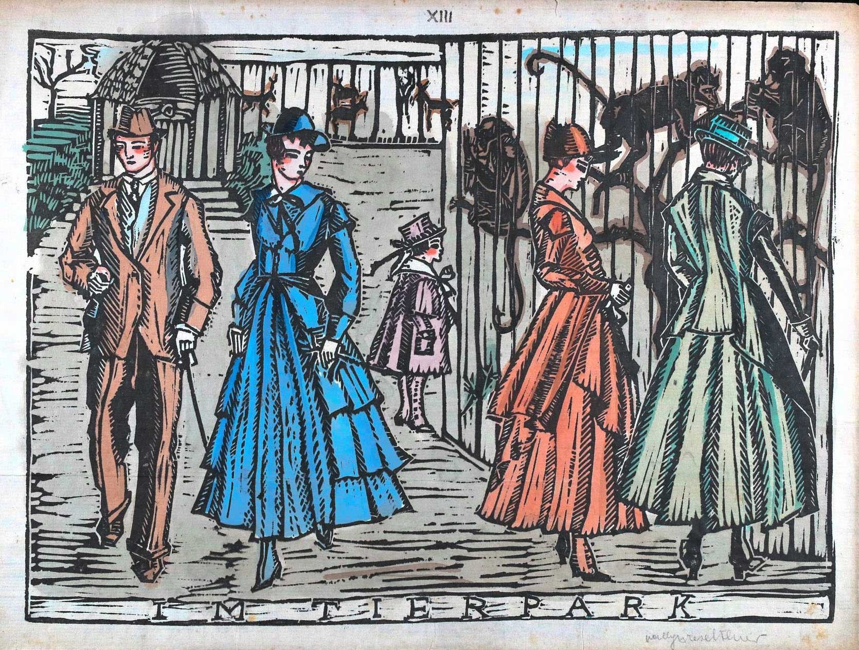Vally Wieselthier, Illustration für das Mappenwerk Das Leben einer Dame, 1916, Linolschnitt, handkoloriert, auf Japanpapier © MAK