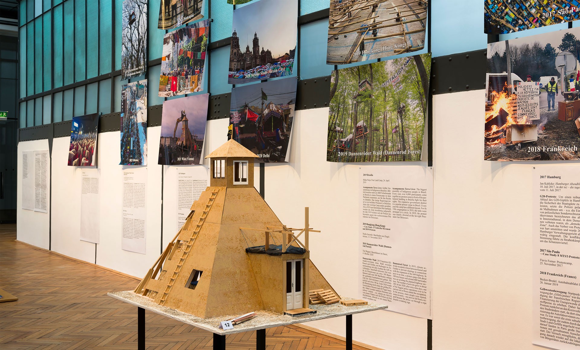 Intricately detailed models made at the Technical University of Munich and the Hochschule für Technik Stuttgart (Prof. Andreas Kretzer) depict a broad range of protest camps, from Resurrection City in Washington in 1968 through to the Austrian “LobauBleibt!” movement of 2021/22. Forty “ground-based structures” from Lützerath, mostly pile structures, were documented by Rokas Wille (Karlsruhe University of Arts and Design) by way of models made of photographic paper, while director Oliver Hardt produced a film installation for the exhibition. In coordination with activists, a suspension bridge from the Hambach Forest was able to be secured as an exhibit. The hanging model of the Beechtown barrio by artist Stephan Mörsch also shows the Hambach Forest occupation. Furthermore, the “LobauBleibt!” protests are documented by two films by the artists Oliver Ressler and Christoph Schwarz and Extinction Rebellion Austria made one of their tensegrity structures available for the show. The exhibition architecture was created by Something Fantastic.