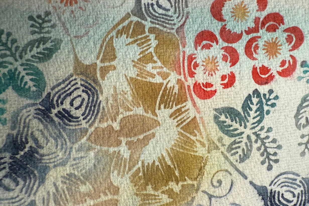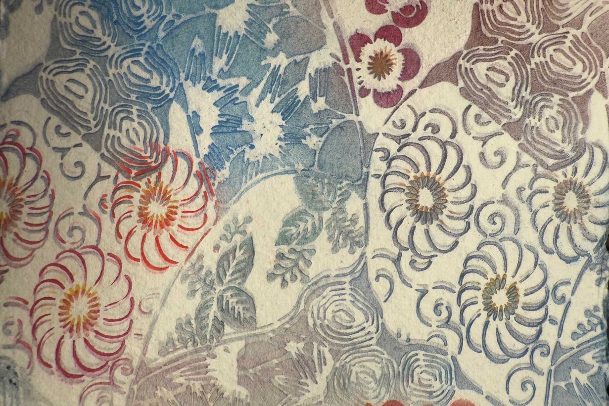 Katazome ist eine japanische Reservetechnik auf Stoff, die als Vorreiter des Siebdrucks gilt und auch Parallelen zum europäischen Blaudruck aufweist. Bei dieser traditionellen Technik der Kimonostoffherstellung wird eine spezielle Reispaste durch detailreiche Papierschablonen (Katagami) auf Stoff gedruckt. Nach dem Trocknen dieser Reservepaste kann der Farbstoff direkt auf den Stoff appliziert werden. In diesem Workshop stellen Sie Ihre eigene Schablone her und arbeiten in der Katazome-Technik mit Pinsel und Pigmenten auf japanischem Papier.